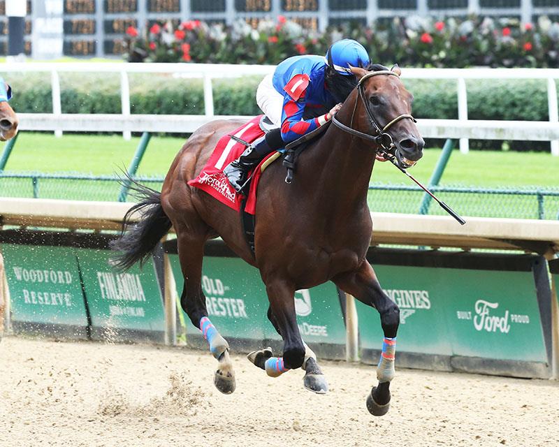 The 4-year-old son of Distorted Humor won the Marathon in front-running style, drawing off in the lane to win by 4 3/4-lengths in 2:29.58 on a fast main track, besting the track record of 2:30.42 set last year in this same race.