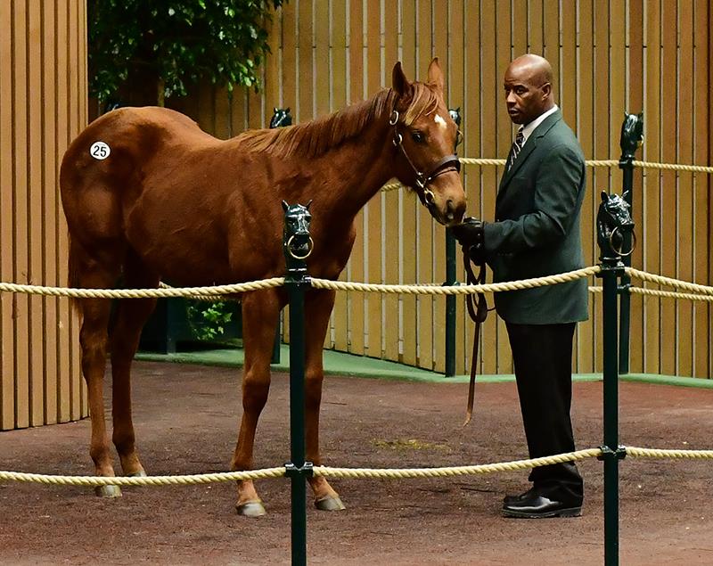 A chestnut filly consigned by Taylor Made Sales agency, hip No. 25 went to The Legends Stables. The filly is out of the Distorted Humor mare Lusaka and is from the same family as 2-year-old champion filly Halfbridled, Grade 1 winner and sire Mshawish, and multiple graded stakes winner Lu Ravi.