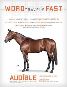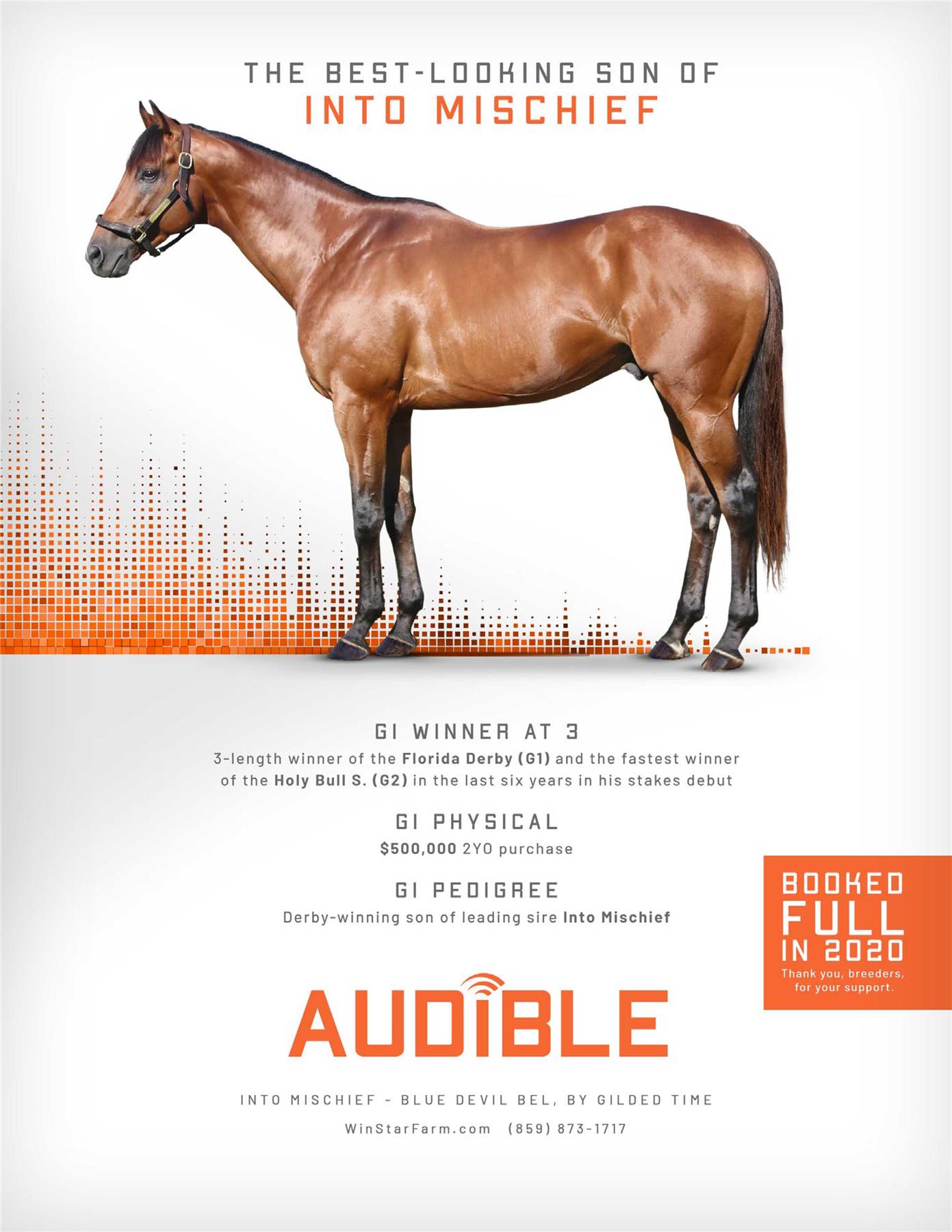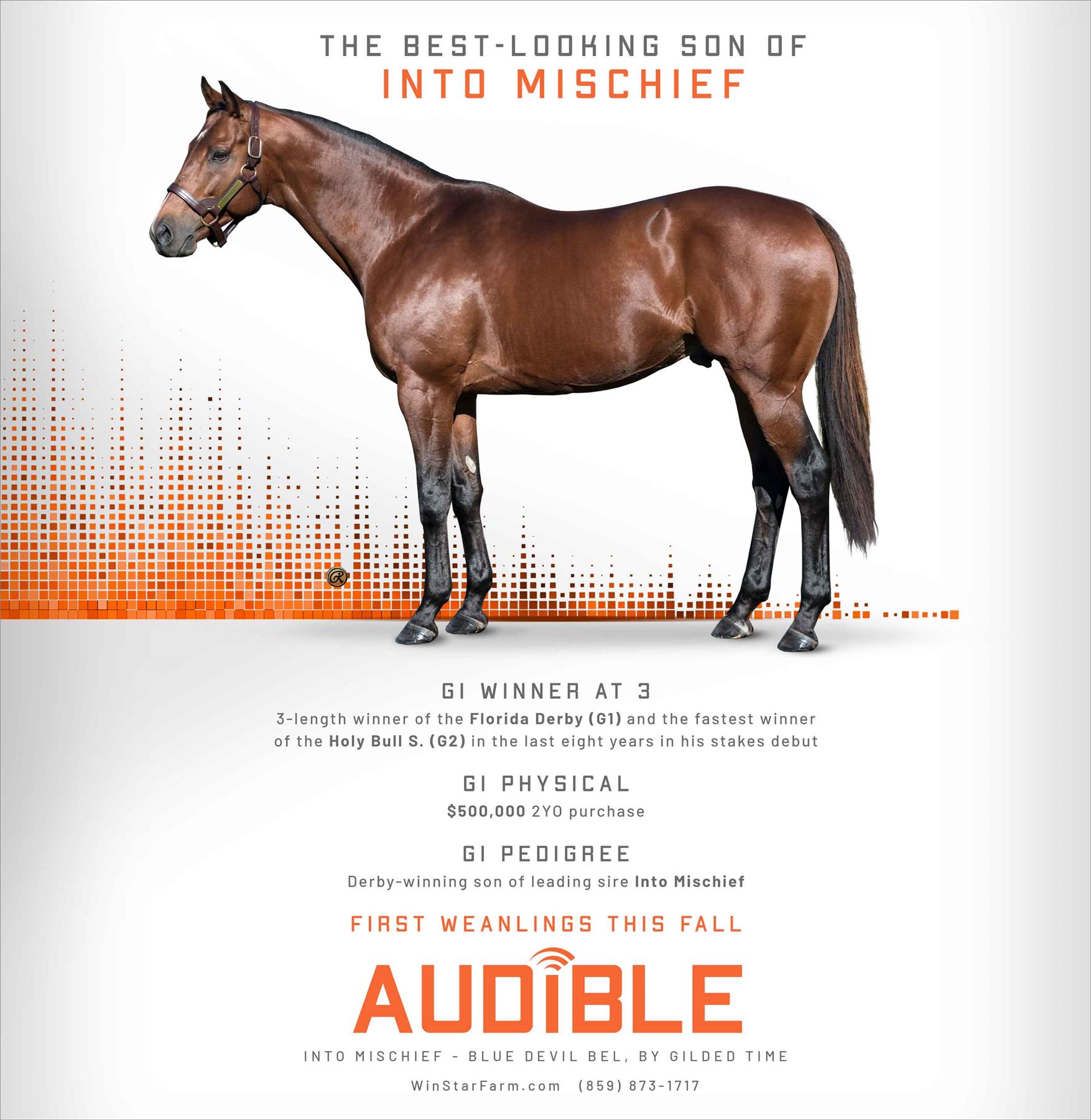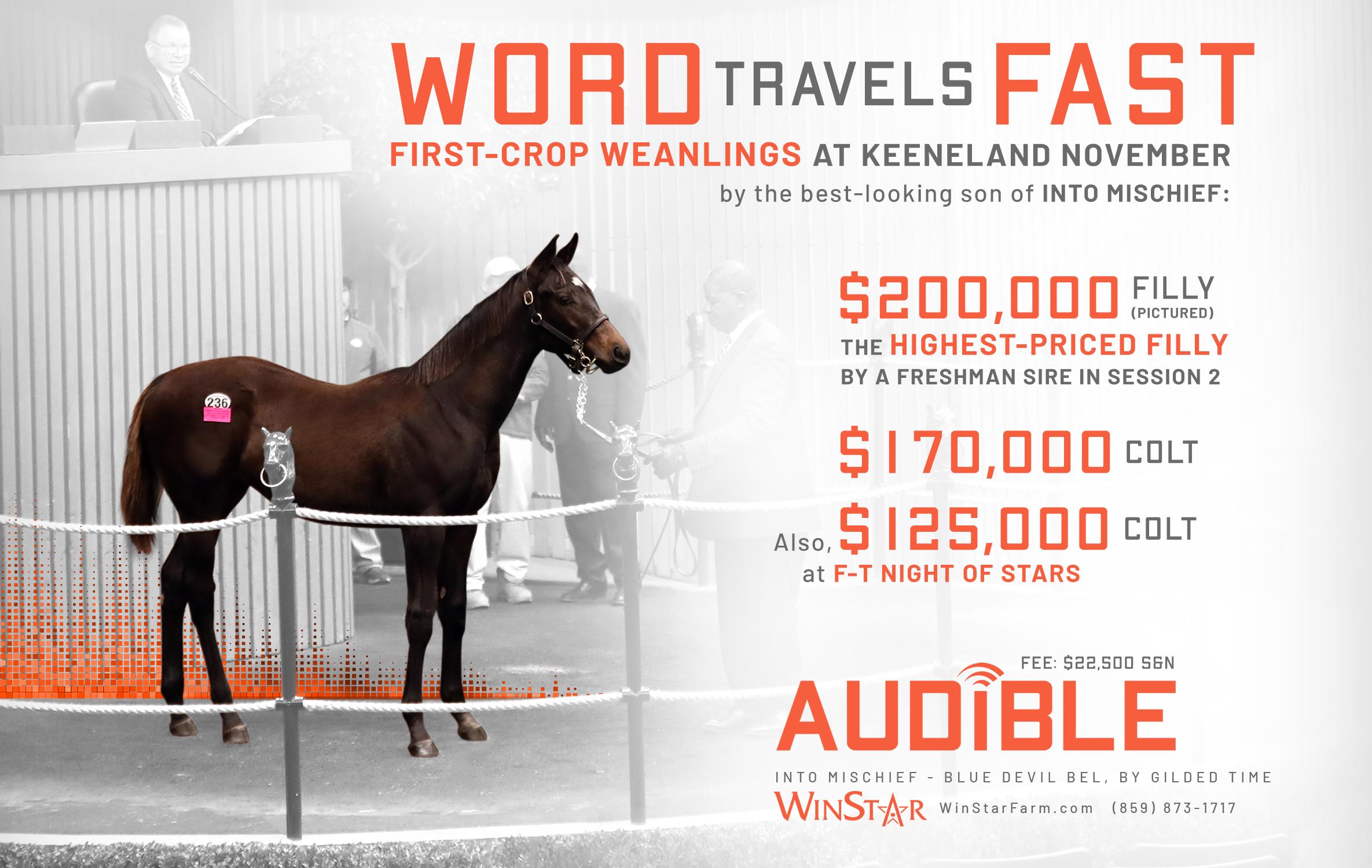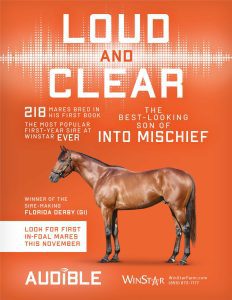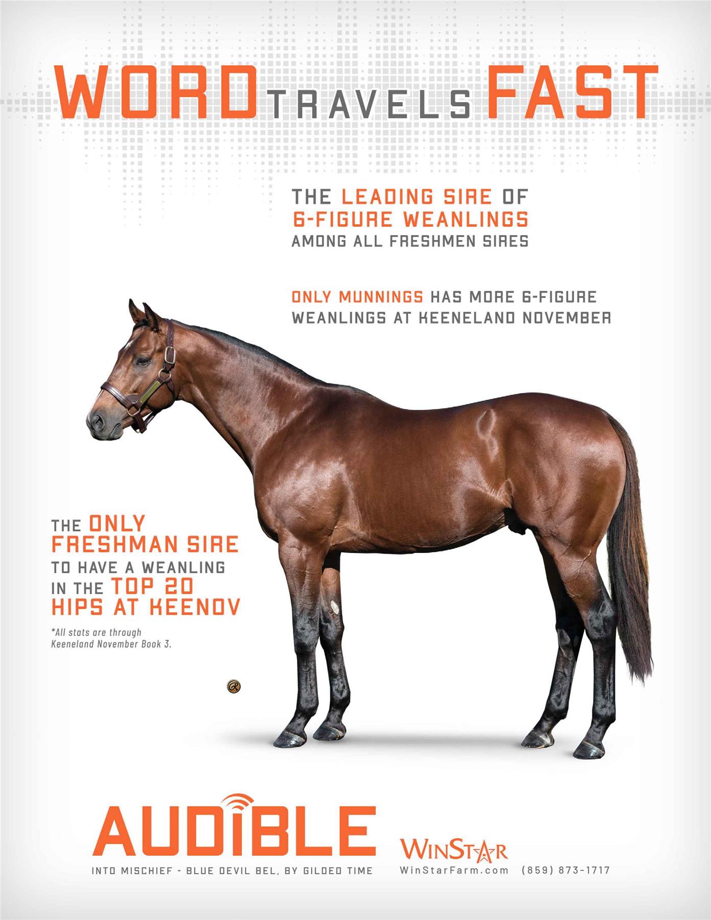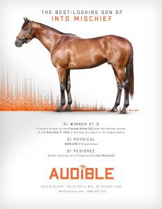 Audible is free to cross over nearly all of the broodmare sire lines that have worked under Into Mischief. This includes the prolific cross with Distorted Humor mares, which has produced Life Is Good, Practical Joke, etc. He has also been exceptional with the Gone West branch of Mr. Prospector, including Authentic out of a mare by Mr. Greeley; 2 G1Ws out of mares by Speightstown; a GSW out of a mare by Grand Slam; and BTWs out of mares by Elusive Quality and Proud Citizen.The cross with mares from the Fappiano branch of Mr. Prospector has been an extremely productive one, including Champion Covfefe out of a mare by Unbridled and Kentucky Derby victor Mandaloun, out of a mare by Empire Maker. Mares by Unbridled’s Song have done well and it is worth considering Fappiano through Candy Ride. Other branches of Mr. Prospector that have met with success include Carson City, Smart Strike, and Lemon Drop Kid. Looking at the Northern Dancer line, the Into Mischief cross with Danzig line mares has an excellent strike-rate, including through Langfuhr and Hard Spun, and War Front also appeals. He is also beginning to show an affinity for the El Pado branch of Sadler’s Wells. Into Mischief has the speedy Dayoutoftheoffice and Frank’s Rockette out of mares by Indian Charlie (sire of Uncle Mo), and 2 sons of Into Mischief have BTWs on the same cross. Into Mischief also has 2 BTWs out of mares by Arch (sire of Blame). – Alan Porter