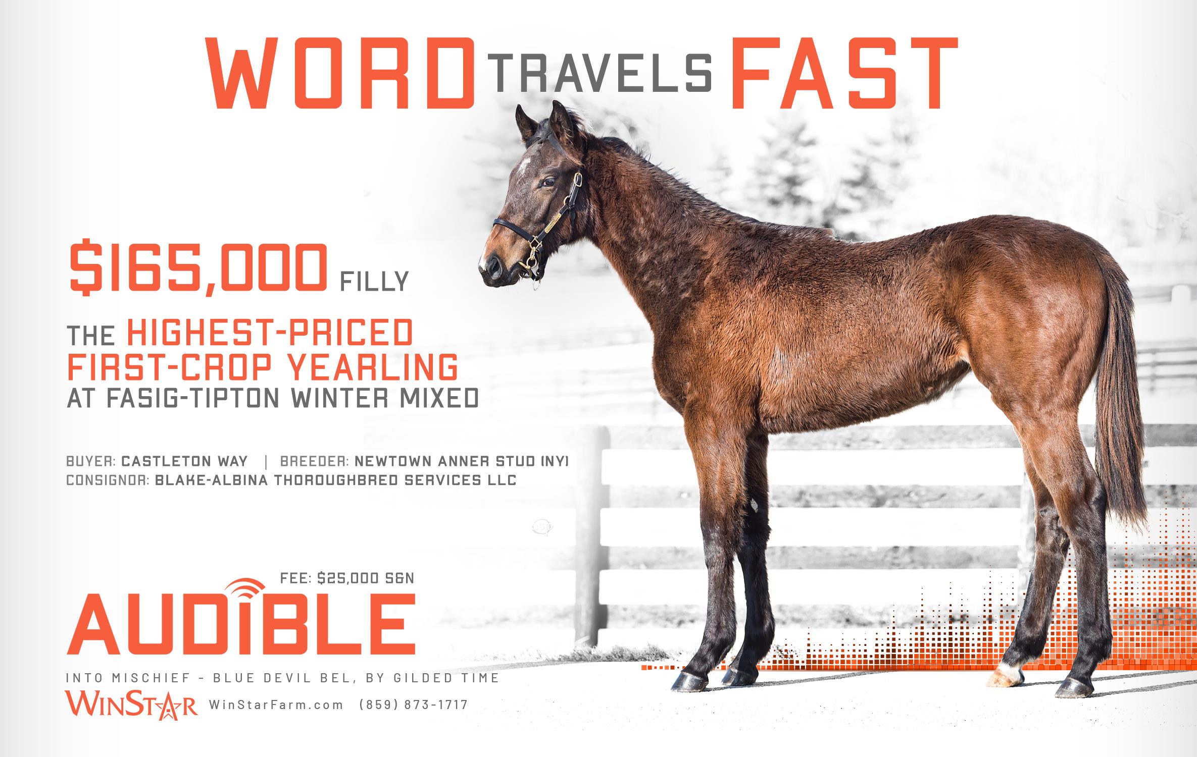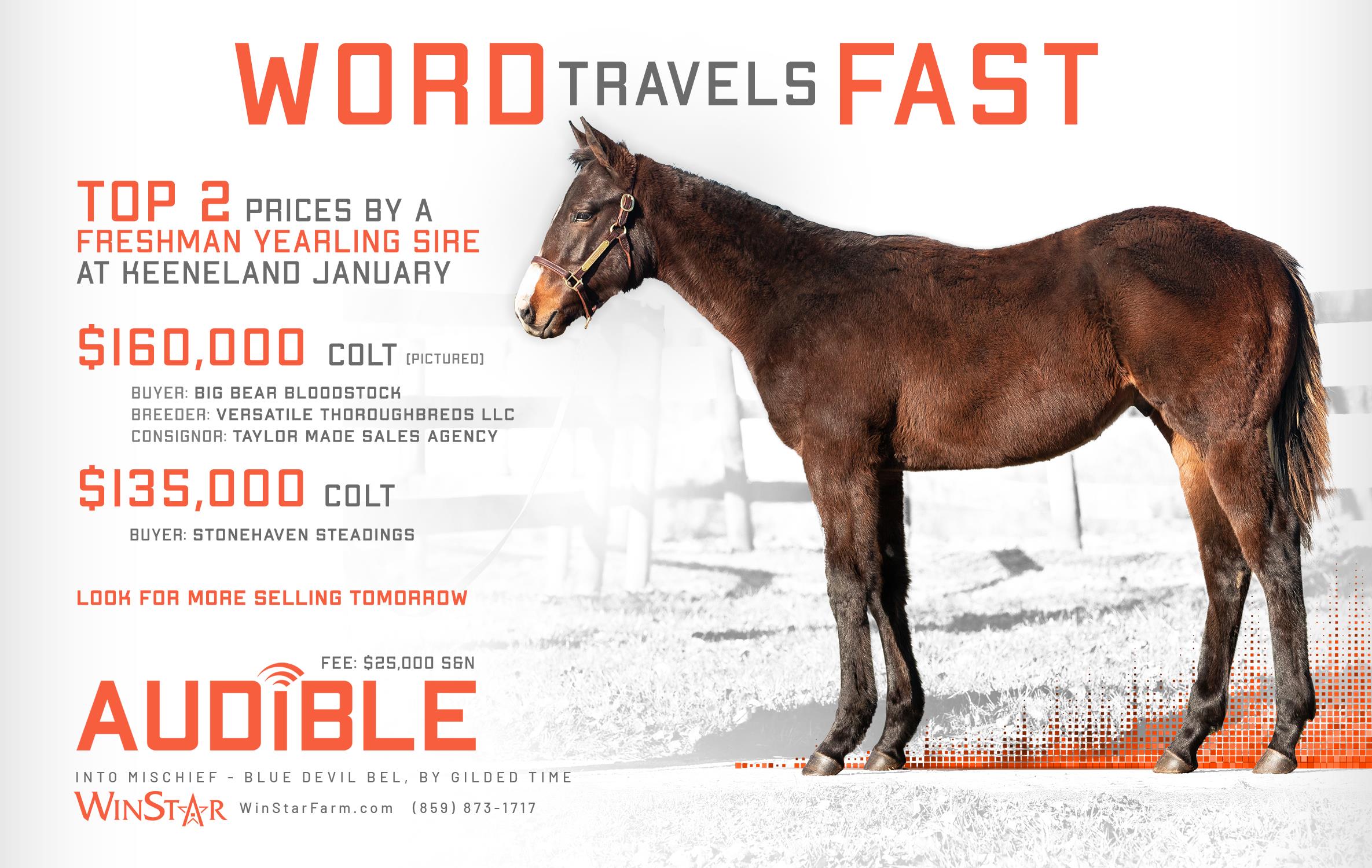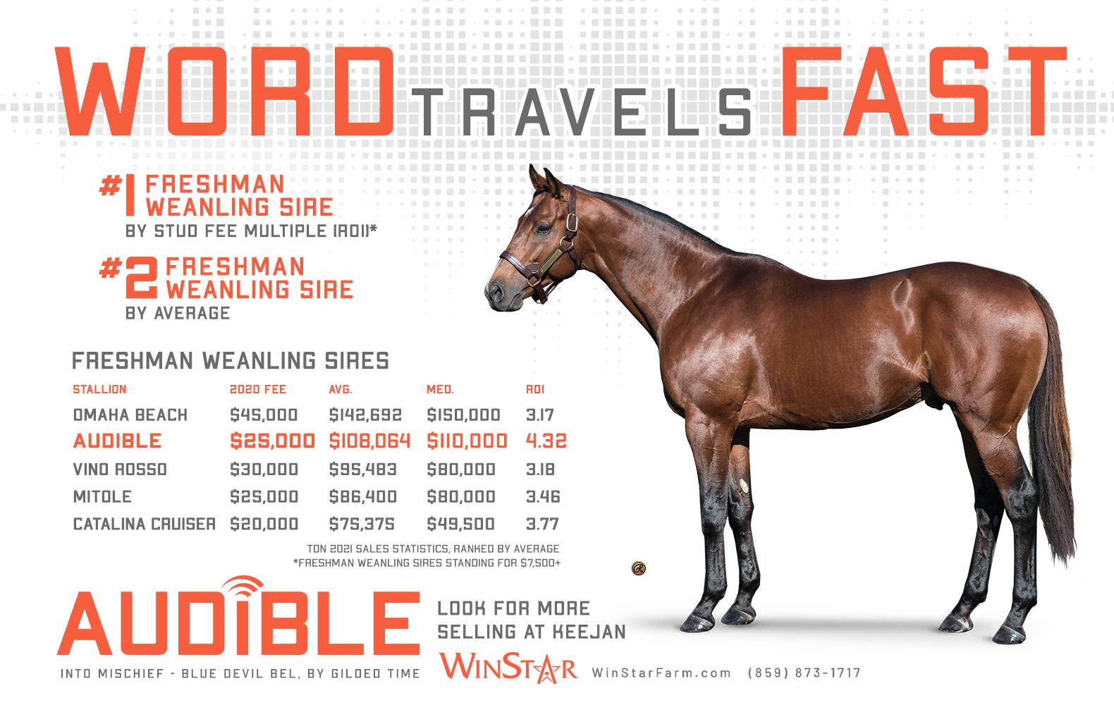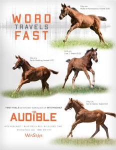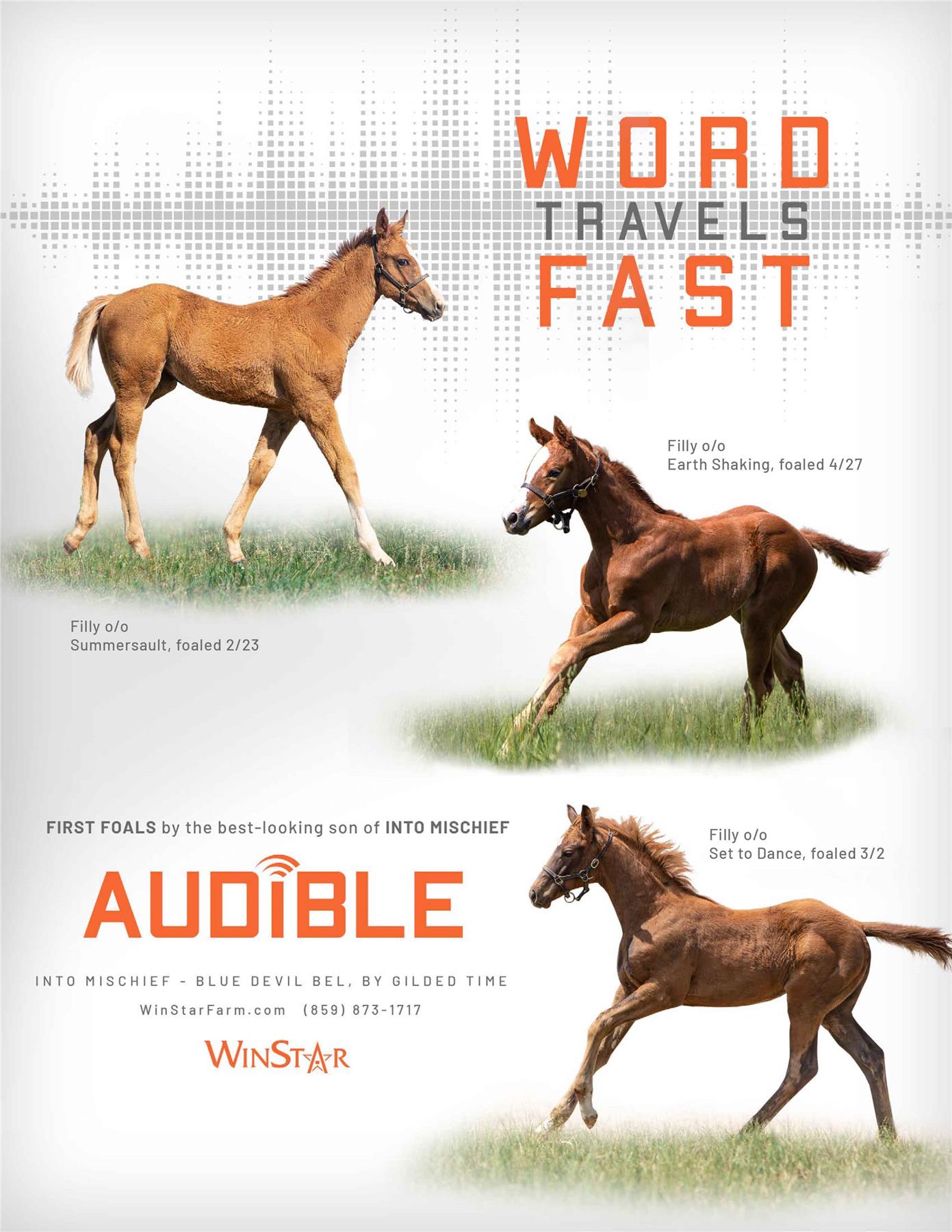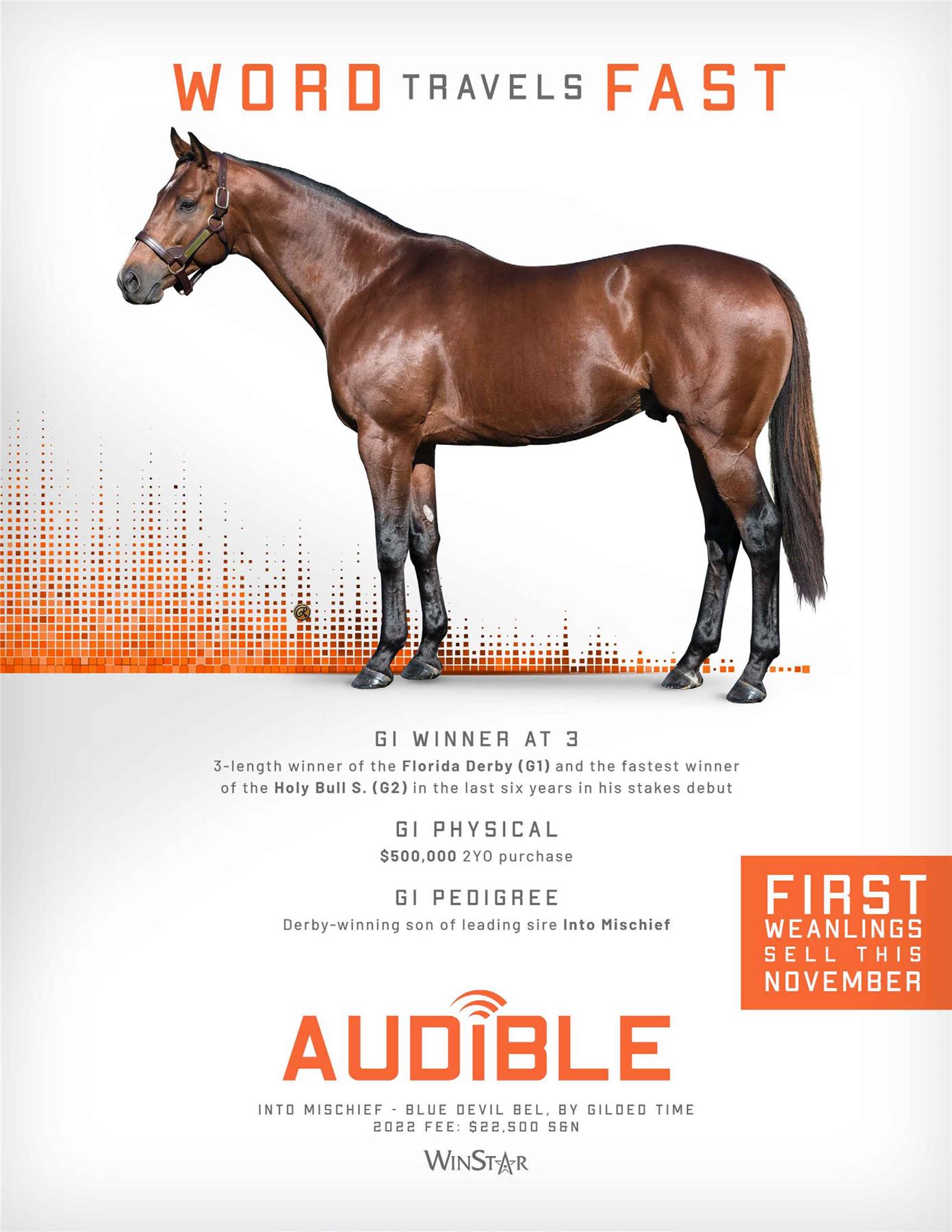 Audible is free to cross over nearly all of the broodmare sire lines that have worked under Into Mischief. This includes the prolific cross with Distorted Humor mares, which has produced Life Is Good, Practical Joke, etc. He has also been exceptional with the Gone West branch of Mr. Prospector, including Authentic out of a mare by Mr. Greeley; 2 G1Ws out of mares by Speightstown; a GSW out of a mare by Grand Slam; and BTWs out of mares by Elusive Quality and Proud Citizen.The cross with mares from the Fappiano branch of Mr. Prospector has been an extremely productive one, including Champion Covfefe out of a mare by Unbridled and Kentucky Derby victor Mandaloun, out of a mare by Empire Maker. Mares by Unbridled’s Song have done well and it is worth considering Fappiano through Candy Ride. Other branches of Mr. Prospector that have met with success include Carson City, Smart Strike, and Lemon Drop Kid. Looking at the Northern Dancer line, the Into Mischief cross with Danzig line mares has an excellent strike-rate, including through Langfuhr and Hard Spun, and War Front also appeals. He is also beginning to show an affinity for the El Pado branch of Sadler’s Wells. Into Mischief has the speedy Dayoutoftheoffice and Frank’s Rockette out of mares by Indian Charlie (sire of Uncle Mo), and 2 sons of Into Mischief have BTWs on the same cross. Into Mischief also has 2 BTWs out of mares by Arch (sire of Blame). – Alan Porter