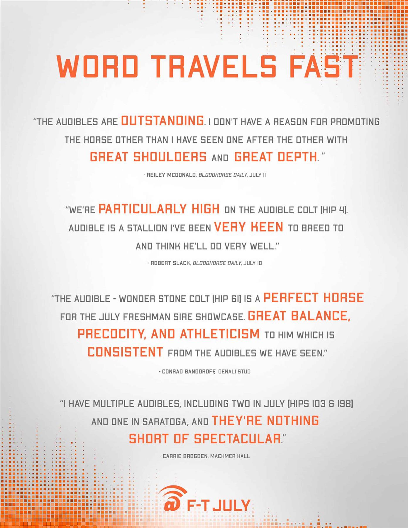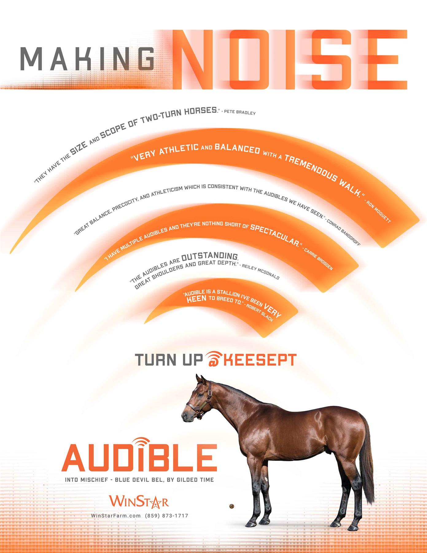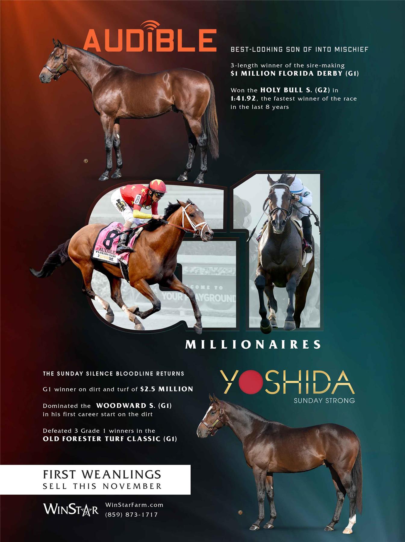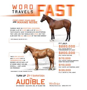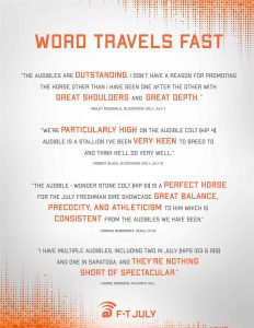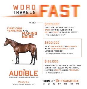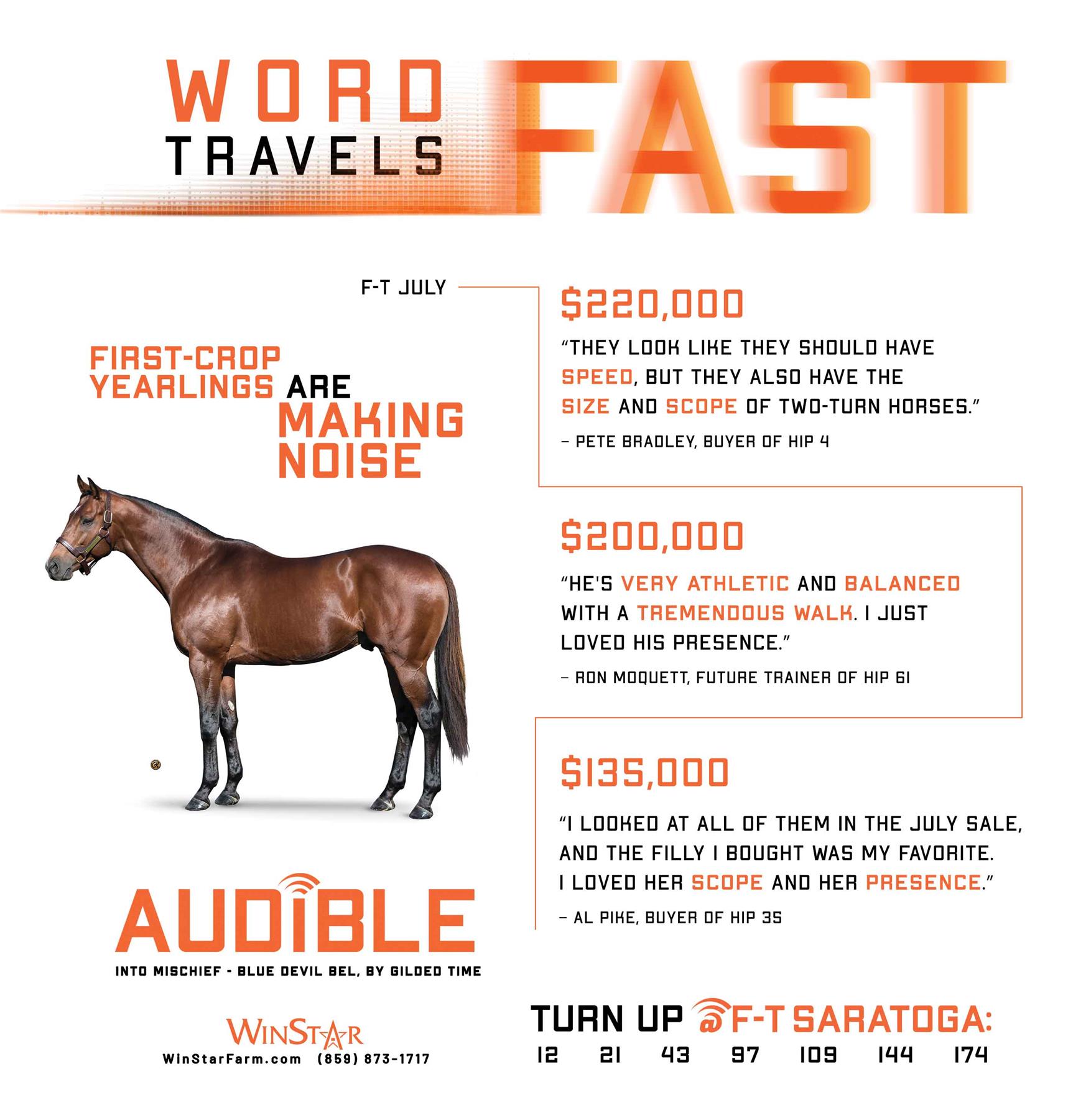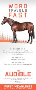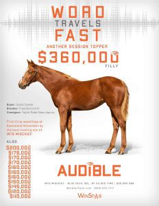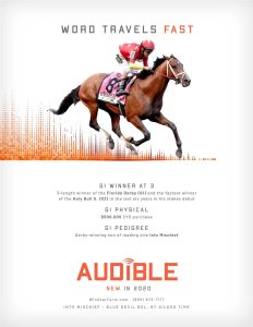 Audible is free to cross over nearly all of the broodmare sire lines that have worked under Into Mischief. This includes the prolific cross with Distorted Humor mares, which has produced Life Is Good, Practical Joke, etc. He has also been exceptional with the Gone West branch of Mr. Prospector, including Authentic out of a mare by Mr. Greeley; 2 G1Ws out of mares by Speightstown; a GSW out of a mare by Grand Slam; and BTWs out of mares by Elusive Quality and Proud Citizen.The cross with mares from the Fappiano branch of Mr. Prospector has been an extremely productive one, including Champion Covfefe out of a mare by Unbridled and Kentucky Derby victor Mandaloun, out of a mare by Empire Maker. Mares by Unbridled’s Song have done well and it is worth considering Fappiano through Candy Ride. Other branches of Mr. Prospector that have met with success include Carson City, Smart Strike, and Lemon Drop Kid. Looking at the Northern Dancer line, the Into Mischief cross with Danzig line mares has an excellent strike-rate, including through Langfuhr and Hard Spun, and War Front also appeals. He is also beginning to show an affinity for the El Pado branch of Sadler’s Wells. Into Mischief has the speedy Dayoutoftheoffice and Frank’s Rockette out of mares by Indian Charlie (sire of Uncle Mo), and 2 sons of Into Mischief have BTWs on the same cross. Into Mischief also has 2 BTWs out of mares by Arch (sire of Blame). – Alan Porter
