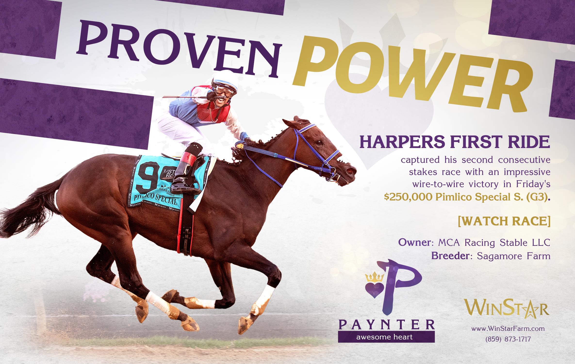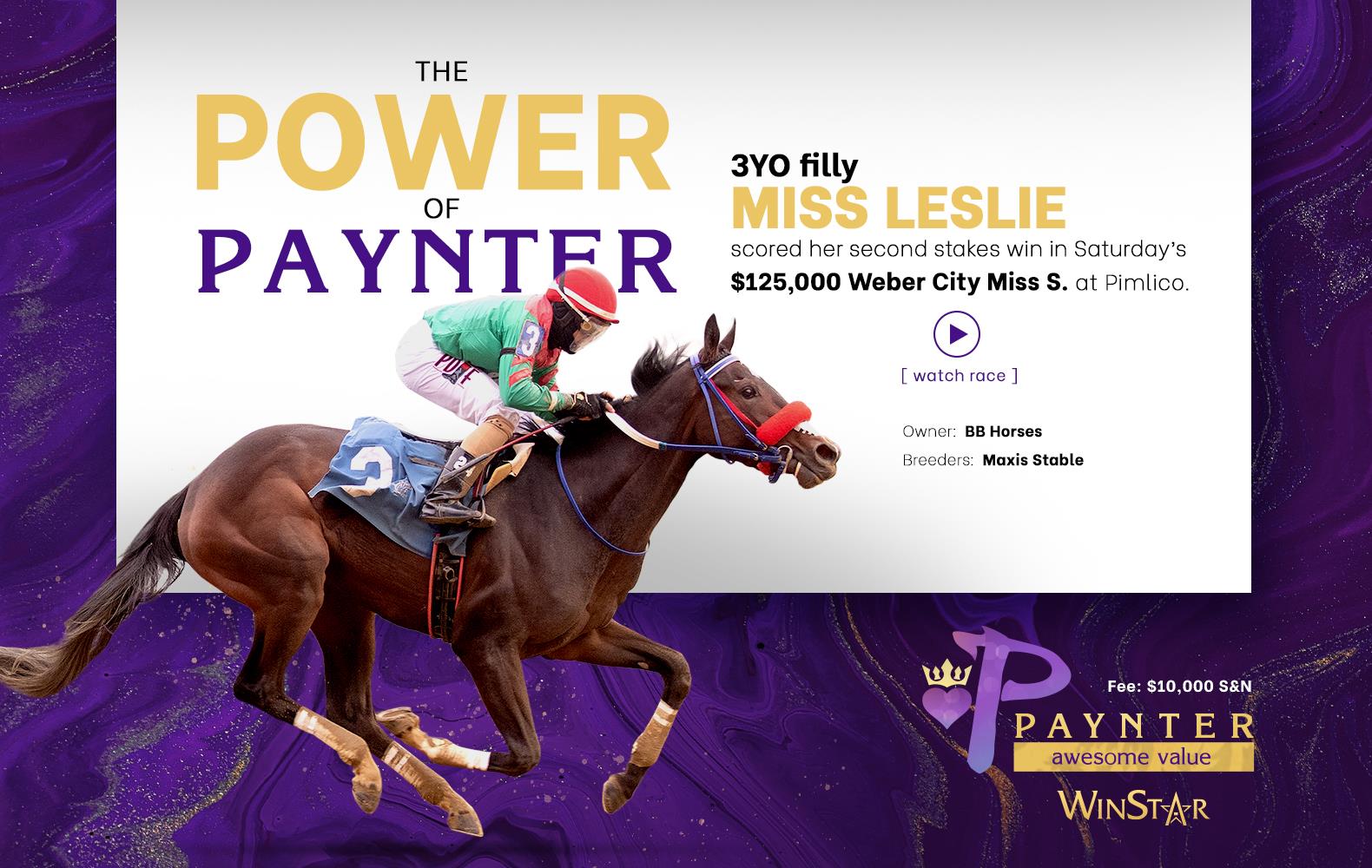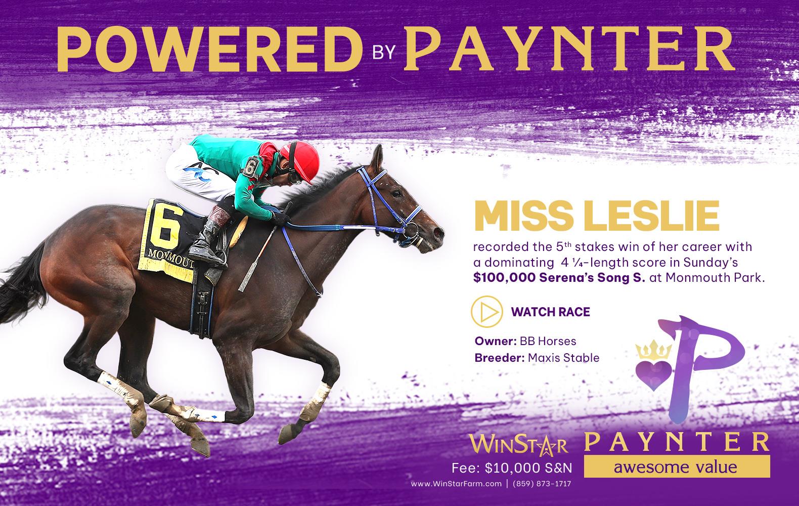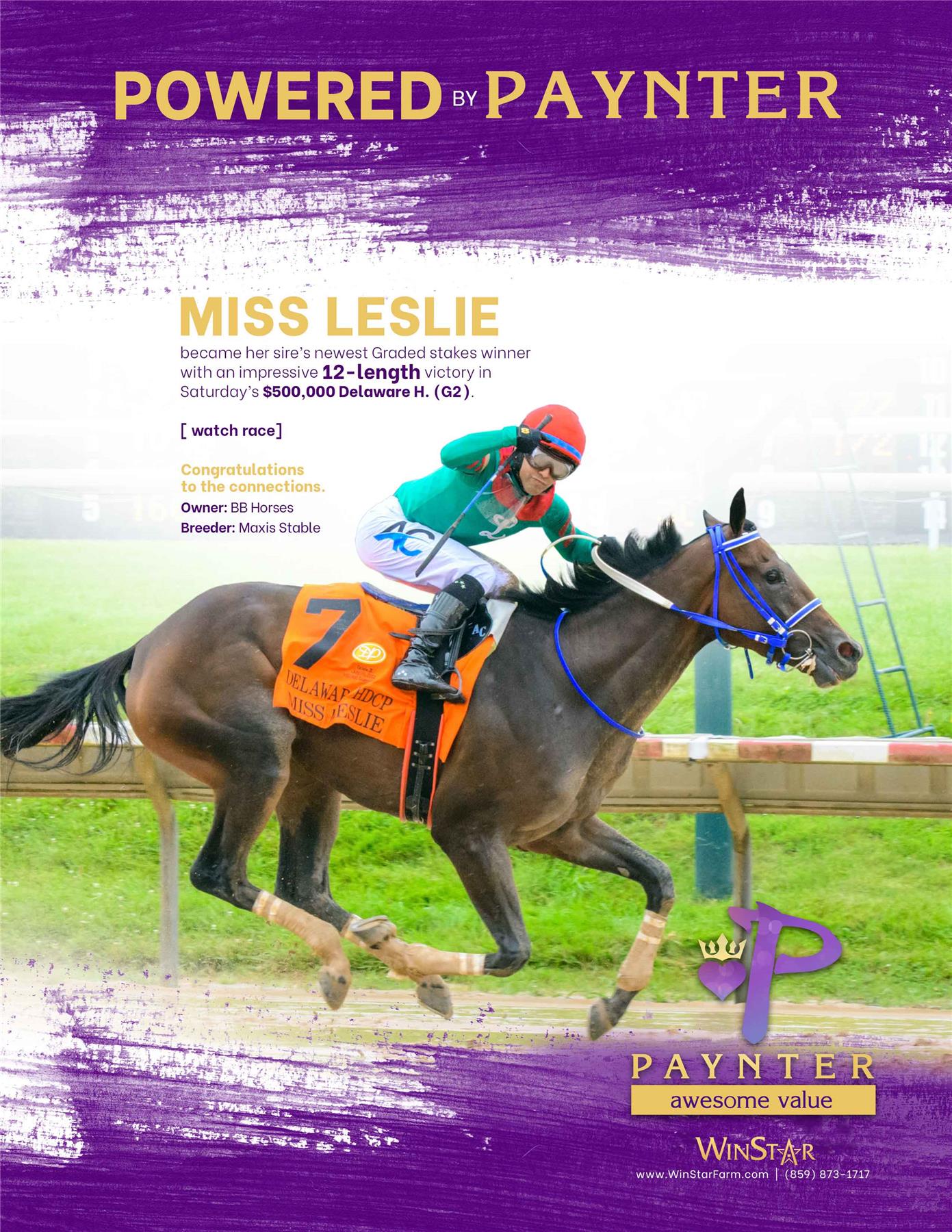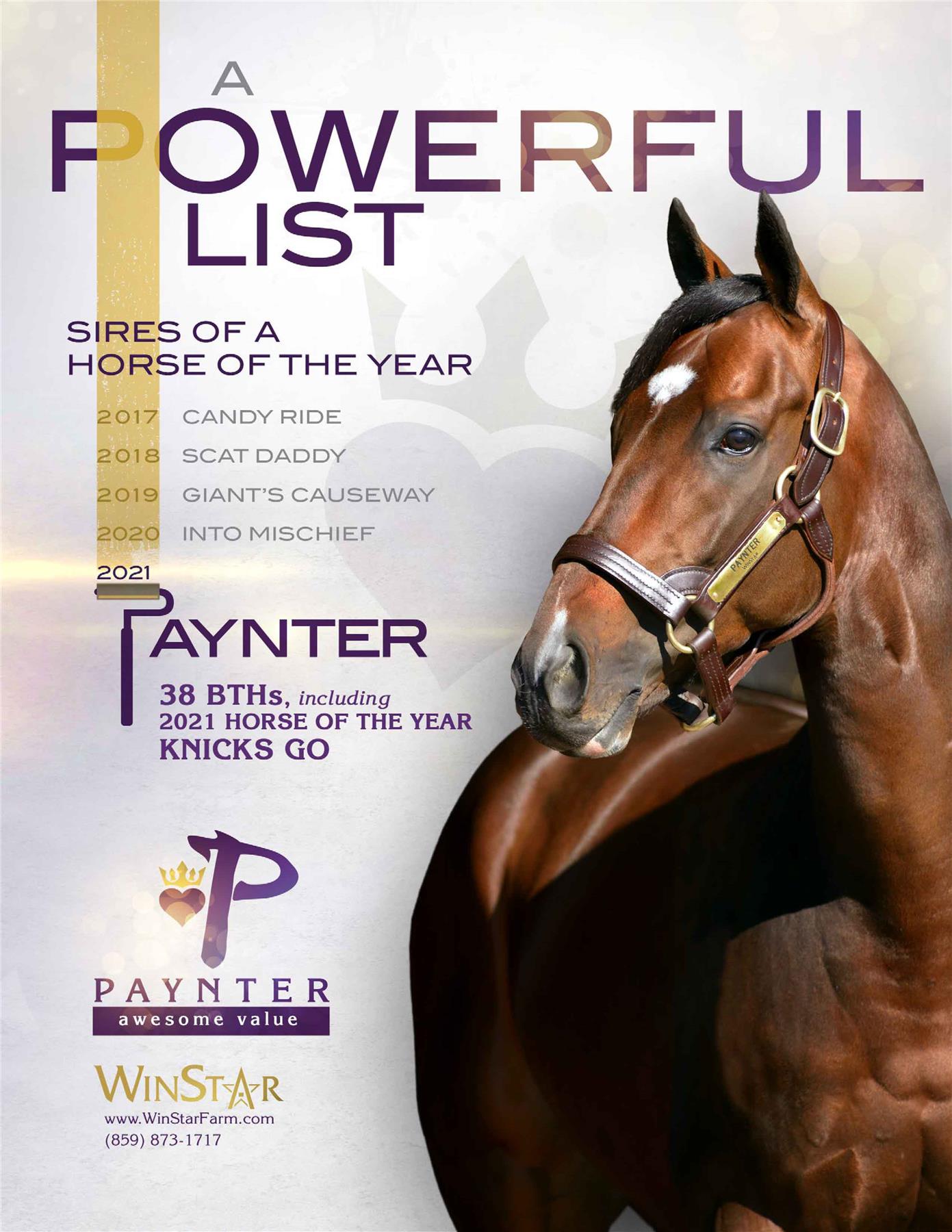 - 2022 racing: MISS LESLIE, 12-length winner of the Delaware H. (G2); PAYNTDEMBLUESAWAY, winner of the Lightning City S.; HYBRID ECLIPSE, winner of the Caesar’s Wish S.; BREEZE RIDER, winner of the Wintergreen S. and the Jersey Lilly Turf S.; KNICKS GO, runner-up in the Pegasus World Cup (G1); stakes-placed POSITIVITY, Payne, Mr Paytience, 2-year-olds C R Insta Gator & Hand Pay; etc.