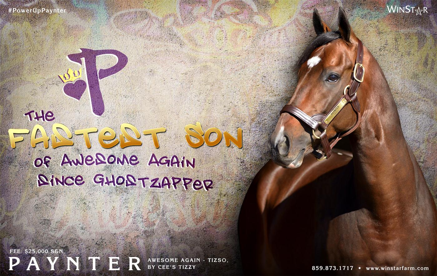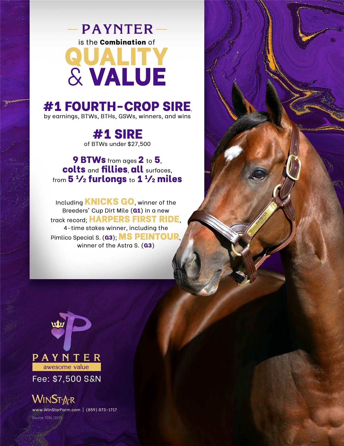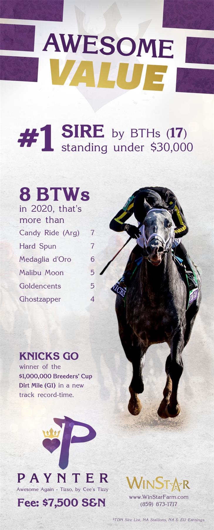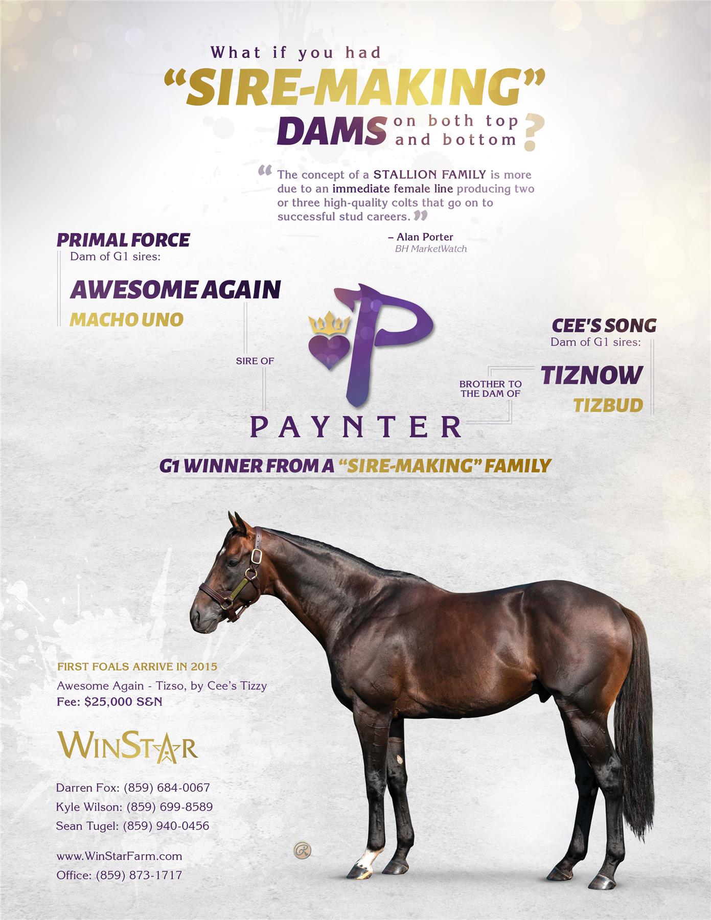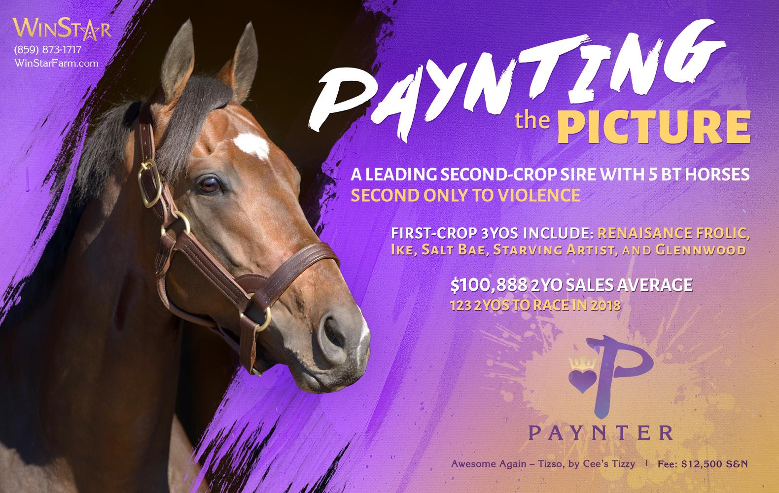 Paynter is already the sire of 23+ BTWs, including HOTY Knicks Go, who is out of a mare by Outflanker, a son of Danzig, and there are Awesome Again BTWs out of mares by Danzig sons Danehill, Dayjur, Langfuhr and Polish Numbers. From another branch of Northern Dancer, Paynter has a BTW out of a mare by Storm Cat. Outflanker is from the immediate family of A.P. Indy, and Paynter has sired GSWs out of mares by A.P. Indy sons Sauve and Mingun—A.P. Indy and sons and grandsons should be interesting here, especially Tapit. Out of Mr. Prospector line mares, he has BTWs out of mares by City Zip and his sire Carson City; Bandini, by Fusaichi Pegasus; and English Channel, by Smart Strike. There is a BTW from the sire line of Forty Niner, also the sire of Distorted Humor. From other branches of Mr. Prospector, there is a G1W on an Awesome Again cross over Gone West, making Speightstown, Elusive Quality, Mr. Greeley, and Grand Slam appealing choices. We can note Awesome Again line Classic winner Sir Winston out of a mare by Afleet Alex (by Northern Afleet). From the Fappiano branch of Mr. Prospector, Paynter has a BTW out of a mare by Quiet American and a BTW out of a mare by Unbridled’s Song. He has a GSW out of a mare by Dynaformer, a version of the successful Awesome Again cross with a Roberto line mare. Paynter has a BTW out of a mare by Holy Bull, another good cross under Awesome Again; a BTW out of a mare by Leroidesanimaux (sire of Animal Kingdom); a BTW out of a mare by Tiznow and a GSW out of a mare by his son Tiz Wonderful (both giving inbreeding to Tiznow and a sister). – Alan Porter