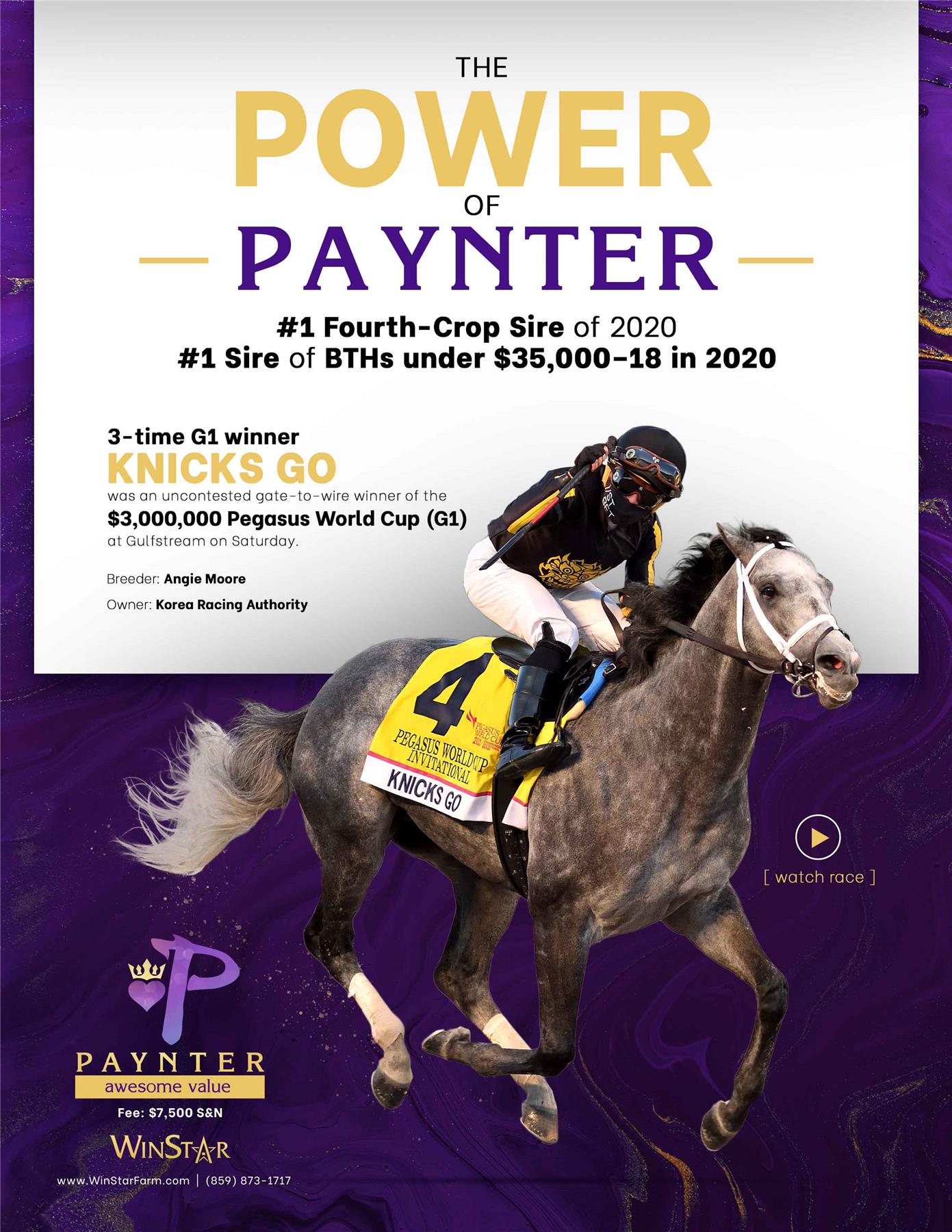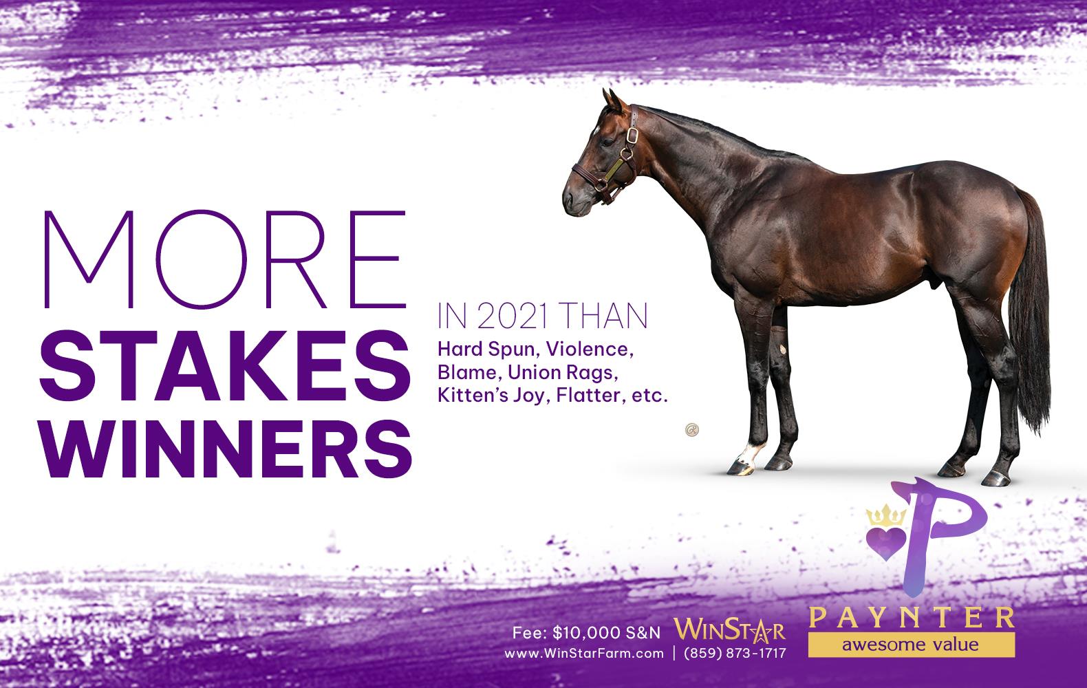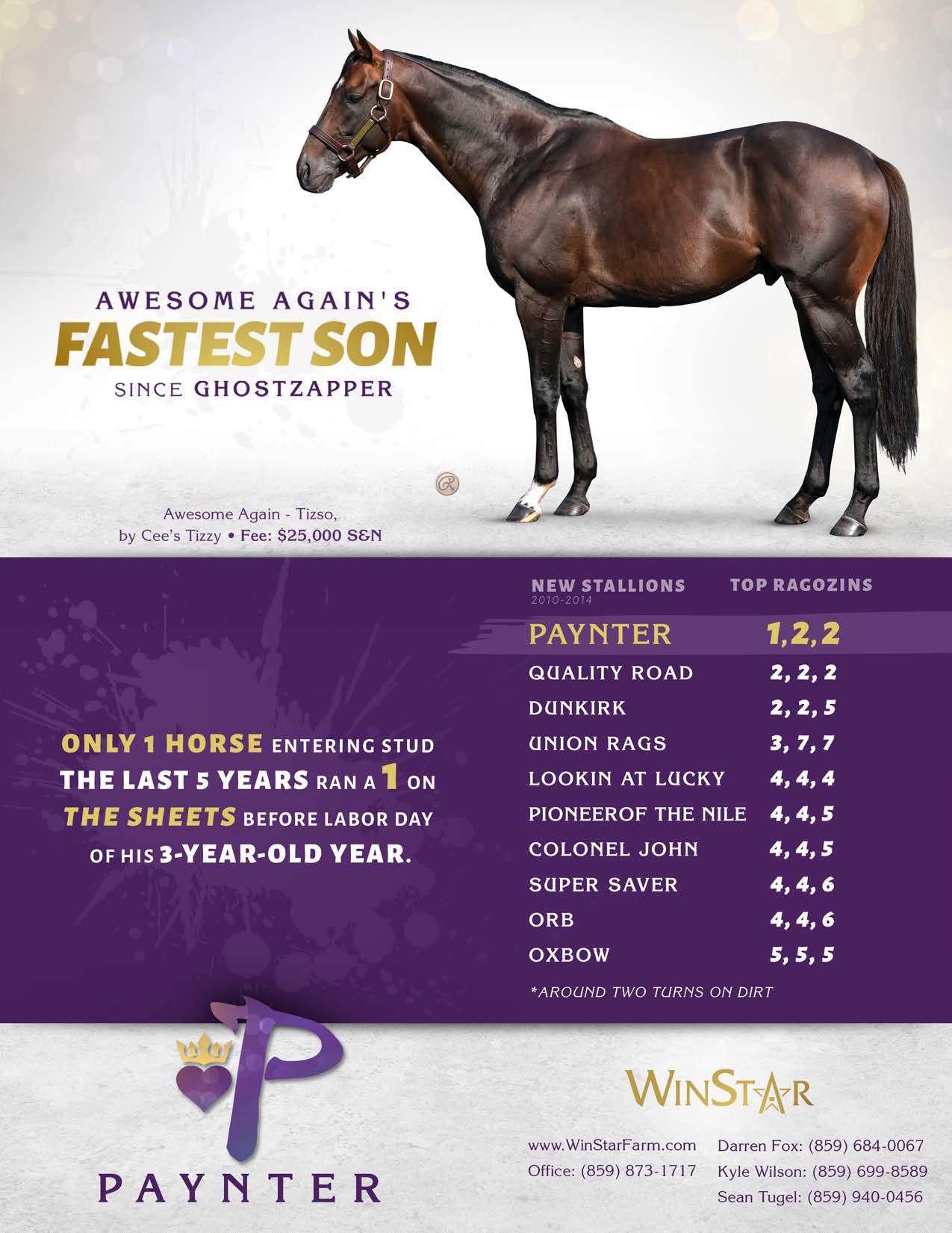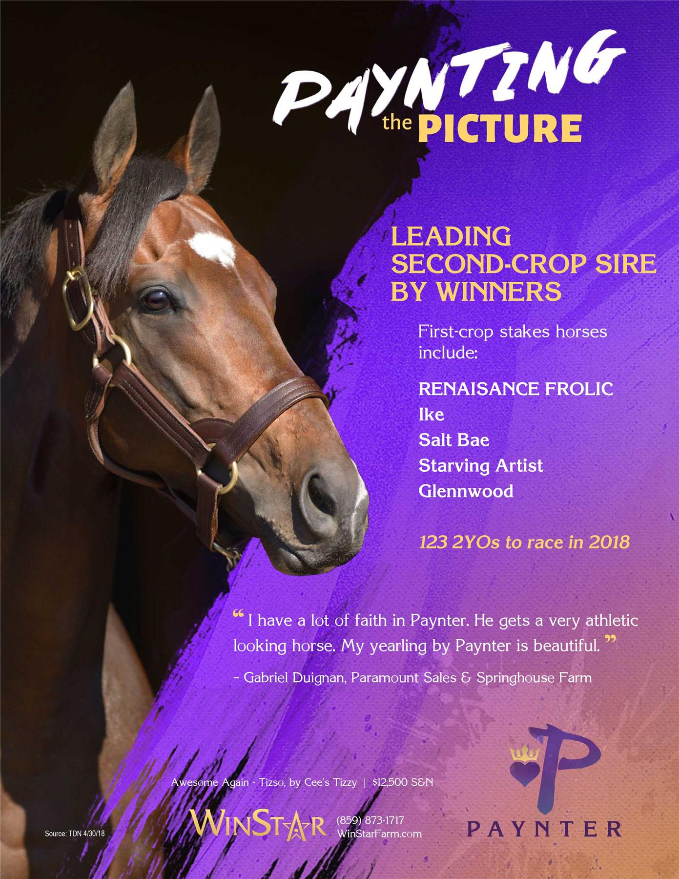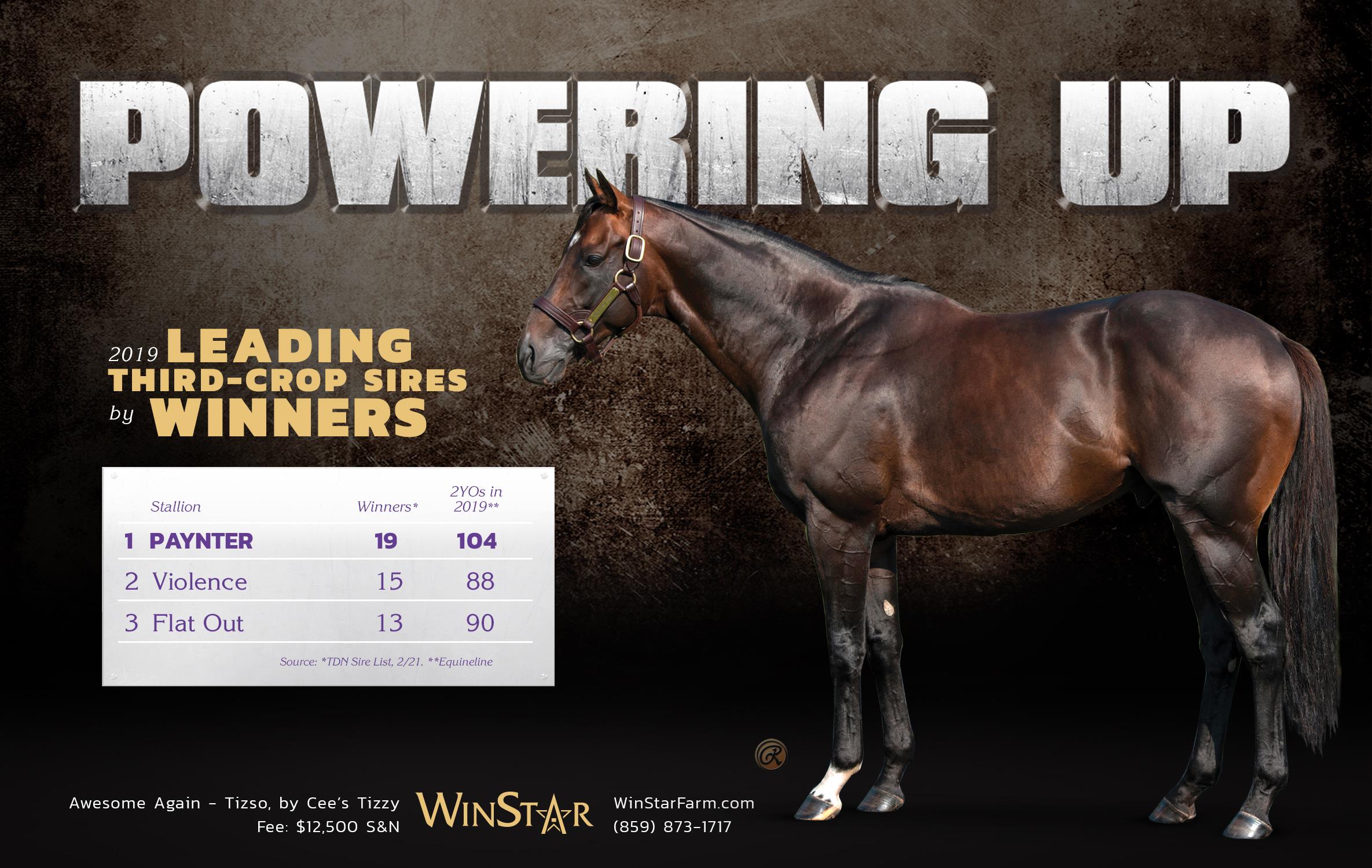 Paynter is already the sire of 23+ BTWs, including HOTY Knicks Go, who is out of a mare by Outflanker, a son of Danzig, and there are Awesome Again BTWs out of mares by Danzig sons Danehill, Dayjur, Langfuhr and Polish Numbers. From another branch of Northern Dancer, Paynter has a BTW out of a mare by Storm Cat. Outflanker is from the immediate family of A.P. Indy, and Paynter has sired GSWs out of mares by A.P. Indy sons Sauve and Mingun—A.P. Indy and sons and grandsons should be interesting here, especially Tapit. Out of Mr. Prospector line mares, he has BTWs out of mares by City Zip and his sire Carson City; Bandini, by Fusaichi Pegasus; and English Channel, by Smart Strike. There is a BTW from the sire line of Forty Niner, also the sire of Distorted Humor. From other branches of Mr. Prospector, there is a G1W on an Awesome Again cross over Gone West, making Speightstown, Elusive Quality, Mr. Greeley, and Grand Slam appealing choices. We can note Awesome Again line Classic winner Sir Winston out of a mare by Afleet Alex (by Northern Afleet). From the Fappiano branch of Mr. Prospector, Paynter has a BTW out of a mare by Quiet American and a BTW out of a mare by Unbridled’s Song. He has a GSW out of a mare by Dynaformer, a version of the successful Awesome Again cross with a Roberto line mare. Paynter has a BTW out of a mare by Holy Bull, another good cross under Awesome Again; a BTW out of a mare by Leroidesanimaux (sire of Animal Kingdom); a BTW out of a mare by Tiznow and a GSW out of a mare by his son Tiz Wonderful (both giving inbreeding to Tiznow and a sister). – Alan Porter