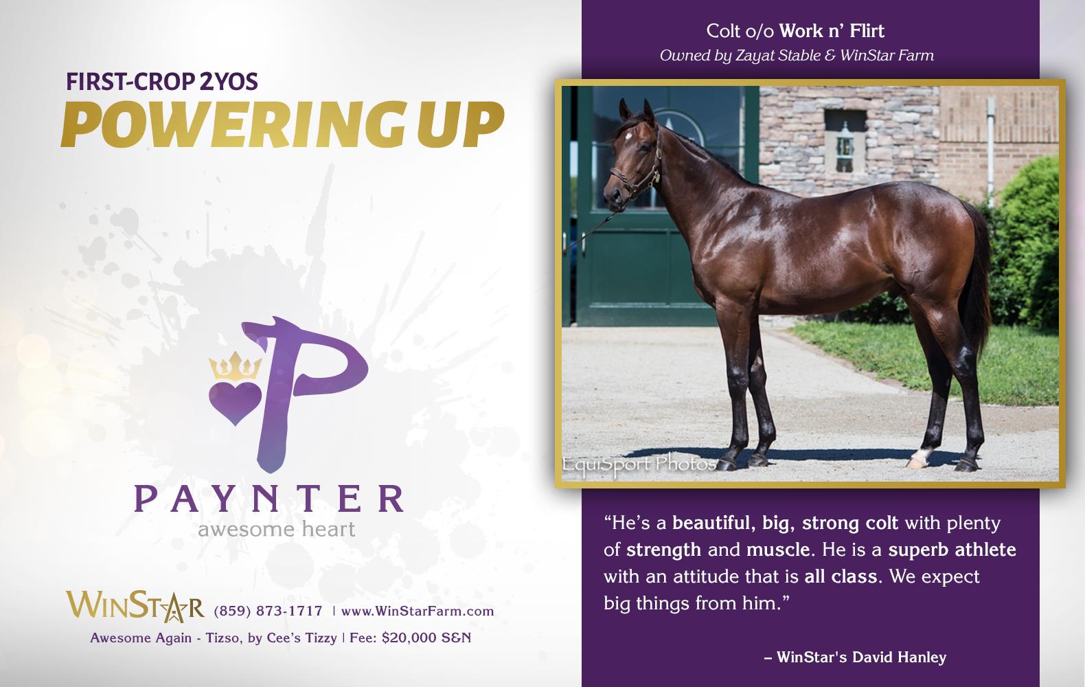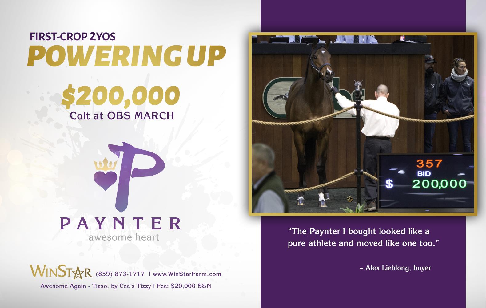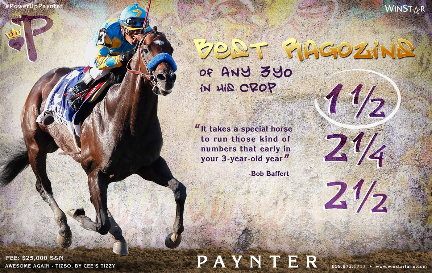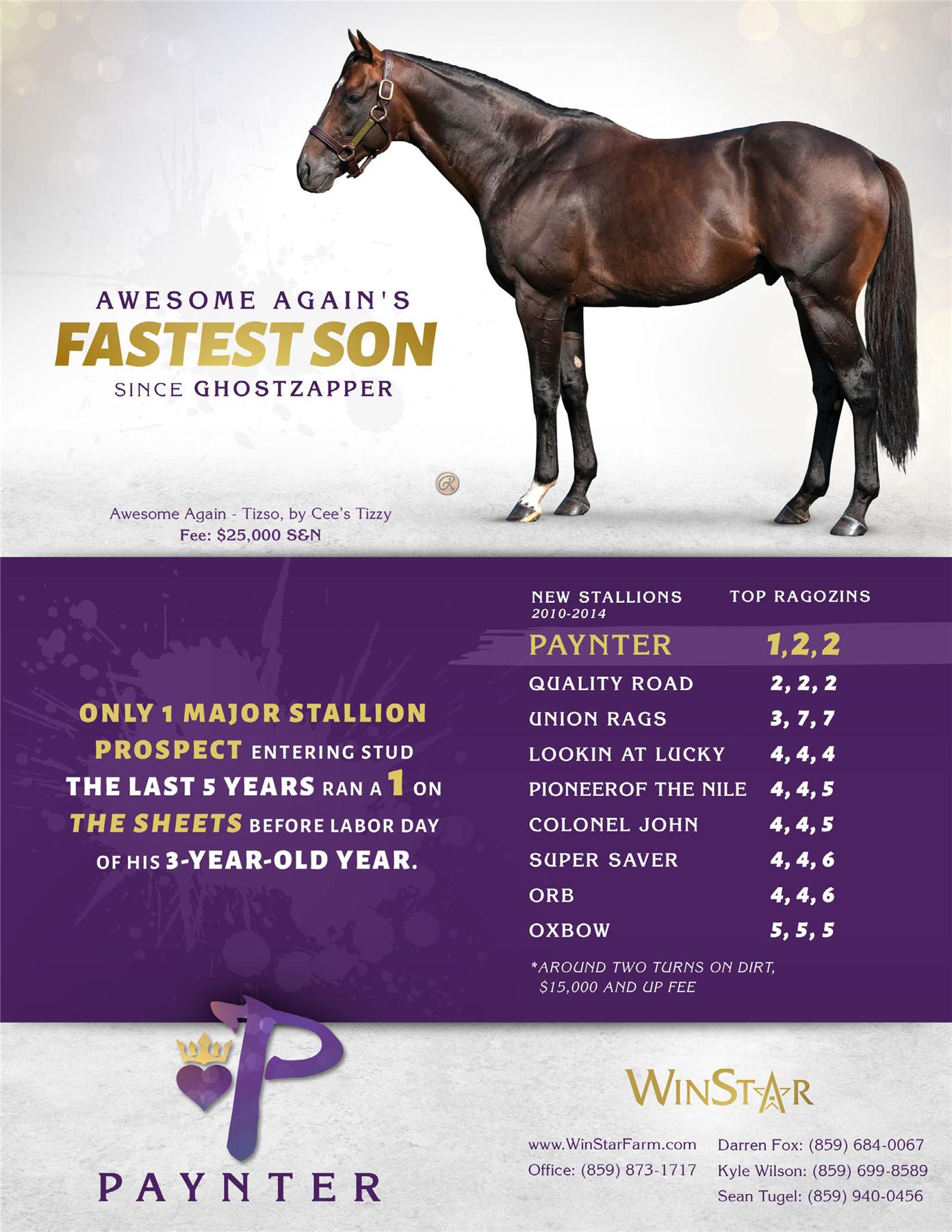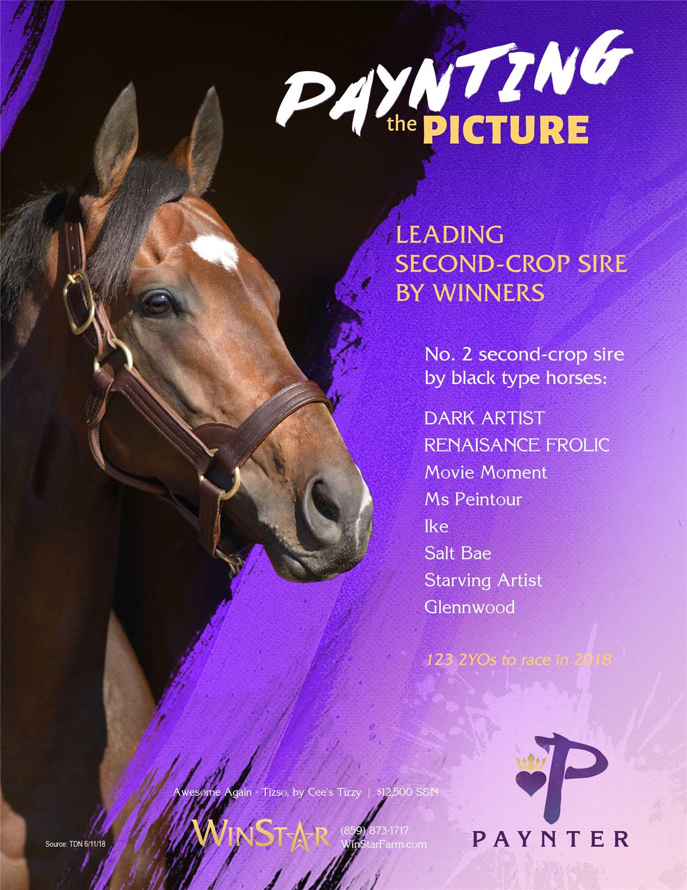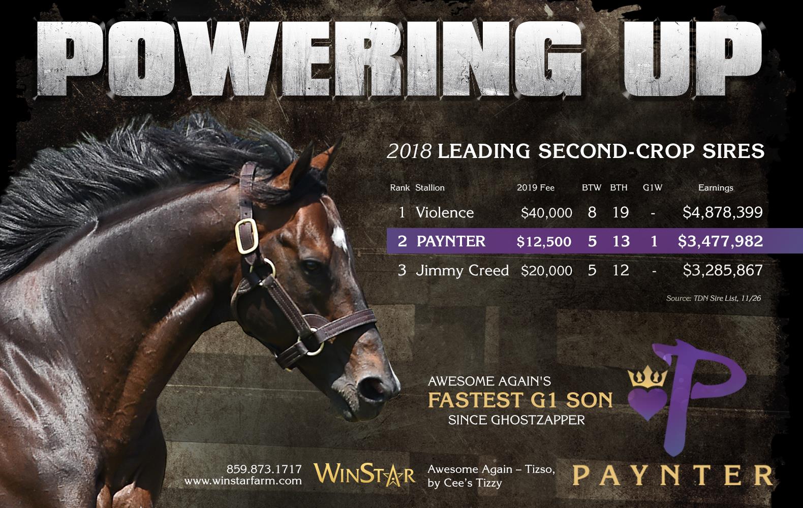 Paynter is already the sire of 23+ BTWs, including HOTY Knicks Go, who is out of a mare by Outflanker, a son of Danzig, and there are Awesome Again BTWs out of mares by Danzig sons Danehill, Dayjur, Langfuhr and Polish Numbers. From another branch of Northern Dancer, Paynter has a BTW out of a mare by Storm Cat. Outflanker is from the immediate family of A.P. Indy, and Paynter has sired GSWs out of mares by A.P. Indy sons Sauve and Mingun—A.P. Indy and sons and grandsons should be interesting here, especially Tapit. Out of Mr. Prospector line mares, he has BTWs out of mares by City Zip and his sire Carson City; Bandini, by Fusaichi Pegasus; and English Channel, by Smart Strike. There is a BTW from the sire line of Forty Niner, also the sire of Distorted Humor. From other branches of Mr. Prospector, there is a G1W on an Awesome Again cross over Gone West, making Speightstown, Elusive Quality, Mr. Greeley, and Grand Slam appealing choices. We can note Awesome Again line Classic winner Sir Winston out of a mare by Afleet Alex (by Northern Afleet). From the Fappiano branch of Mr. Prospector, Paynter has a BTW out of a mare by Quiet American and a BTW out of a mare by Unbridled’s Song. He has a GSW out of a mare by Dynaformer, a version of the successful Awesome Again cross with a Roberto line mare. Paynter has a BTW out of a mare by Holy Bull, another good cross under Awesome Again; a BTW out of a mare by Leroidesanimaux (sire of Animal Kingdom); a BTW out of a mare by Tiznow and a GSW out of a mare by his son Tiz Wonderful (both giving inbreeding to Tiznow and a sister). – Alan Porter