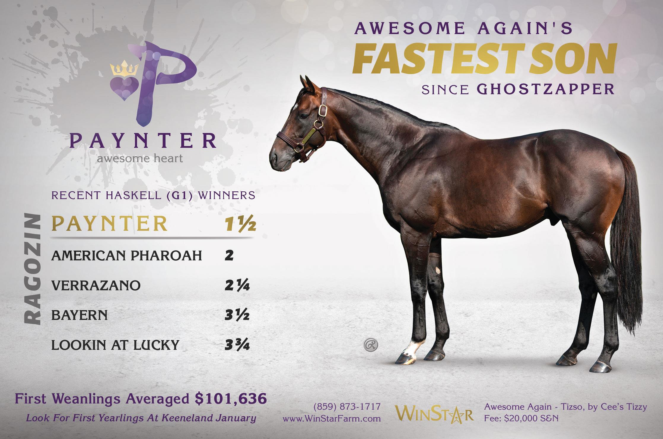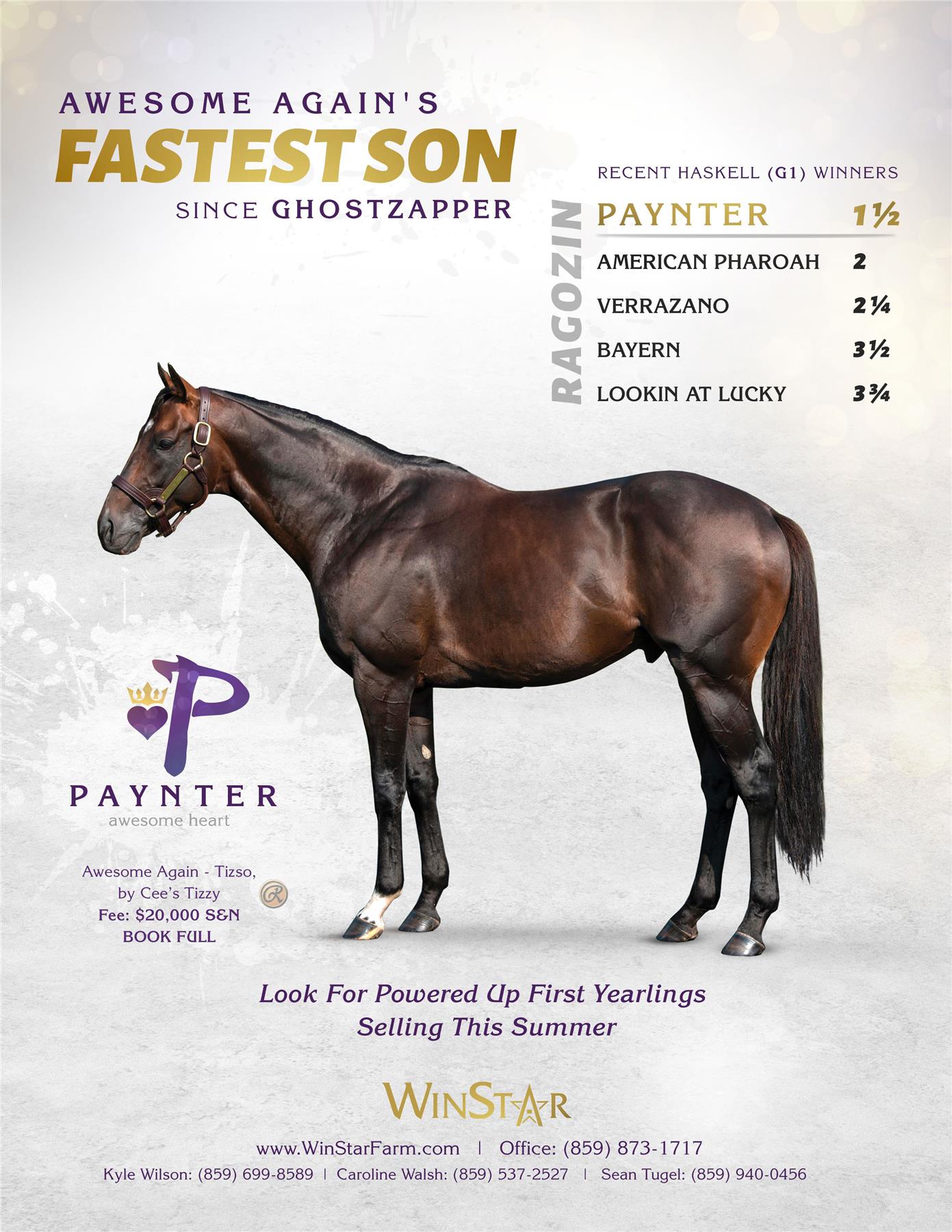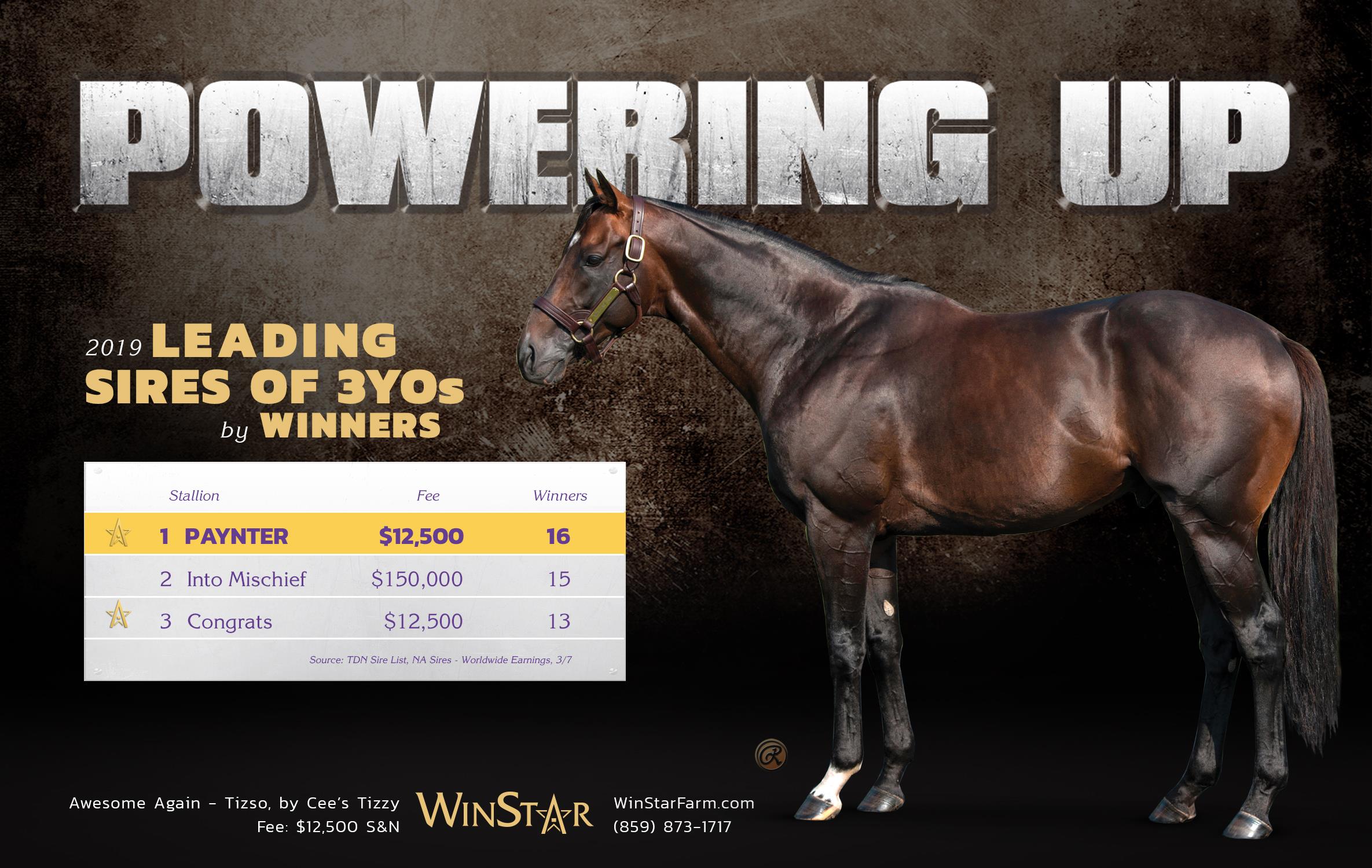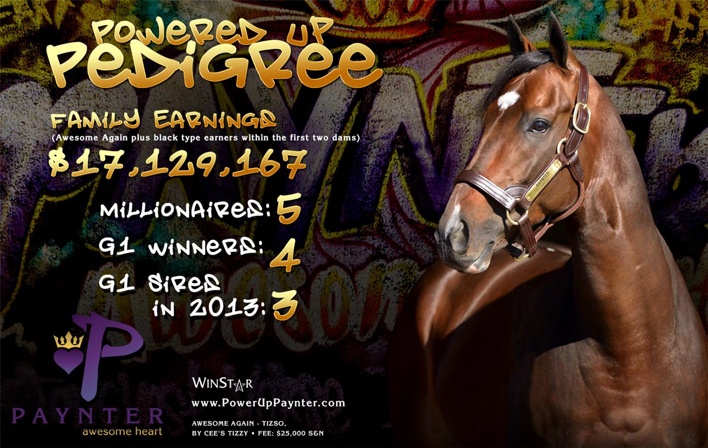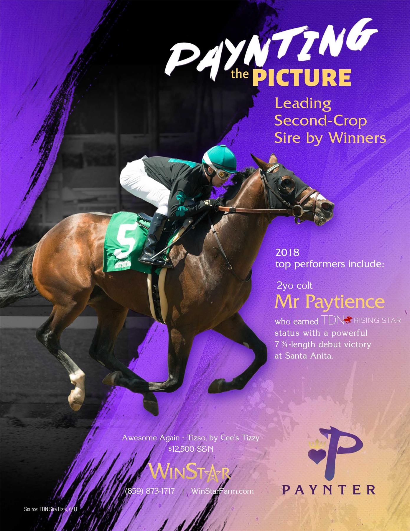 Paynter is already the sire of 23+ BTWs, including HOTY Knicks Go, who is out of a mare by Outflanker, a son of Danzig, and there are Awesome Again BTWs out of mares by Danzig sons Danehill, Dayjur, Langfuhr and Polish Numbers. From another branch of Northern Dancer, Paynter has a BTW out of a mare by Storm Cat. Outflanker is from the immediate family of A.P. Indy, and Paynter has sired GSWs out of mares by A.P. Indy sons Sauve and Mingun—A.P. Indy and sons and grandsons should be interesting here, especially Tapit. Out of Mr. Prospector line mares, he has BTWs out of mares by City Zip and his sire Carson City; Bandini, by Fusaichi Pegasus; and English Channel, by Smart Strike. There is a BTW from the sire line of Forty Niner, also the sire of Distorted Humor. From other branches of Mr. Prospector, there is a G1W on an Awesome Again cross over Gone West, making Speightstown, Elusive Quality, Mr. Greeley, and Grand Slam appealing choices. We can note Awesome Again line Classic winner Sir Winston out of a mare by Afleet Alex (by Northern Afleet). From the Fappiano branch of Mr. Prospector, Paynter has a BTW out of a mare by Quiet American and a BTW out of a mare by Unbridled’s Song. He has a GSW out of a mare by Dynaformer, a version of the successful Awesome Again cross with a Roberto line mare. Paynter has a BTW out of a mare by Holy Bull, another good cross under Awesome Again; a BTW out of a mare by Leroidesanimaux (sire of Animal Kingdom); a BTW out of a mare by Tiznow and a GSW out of a mare by his son Tiz Wonderful (both giving inbreeding to Tiznow and a sister). – Alan Porter