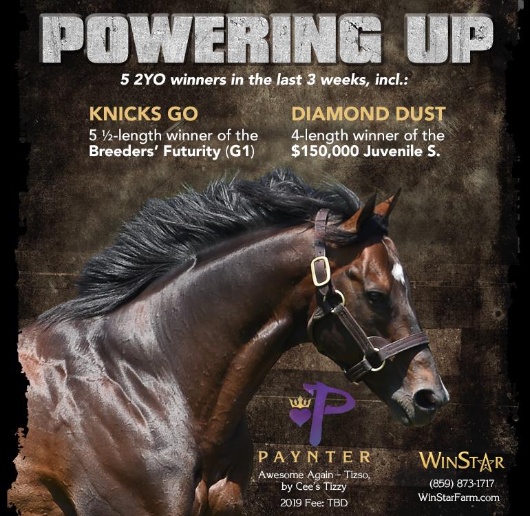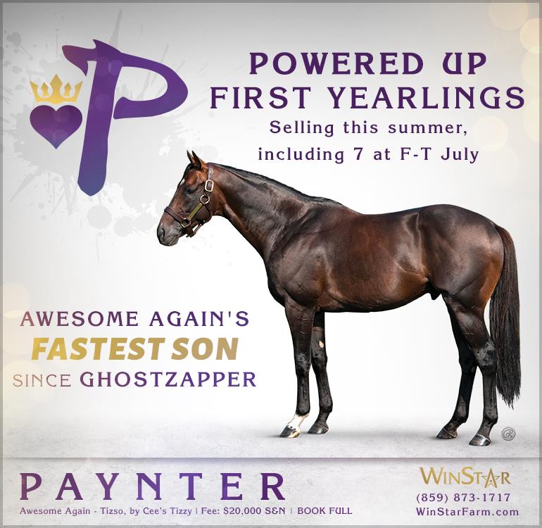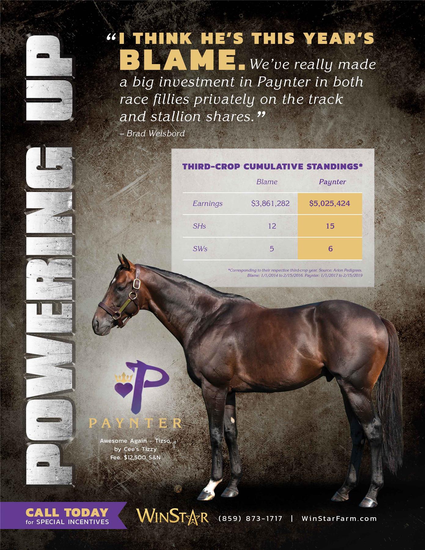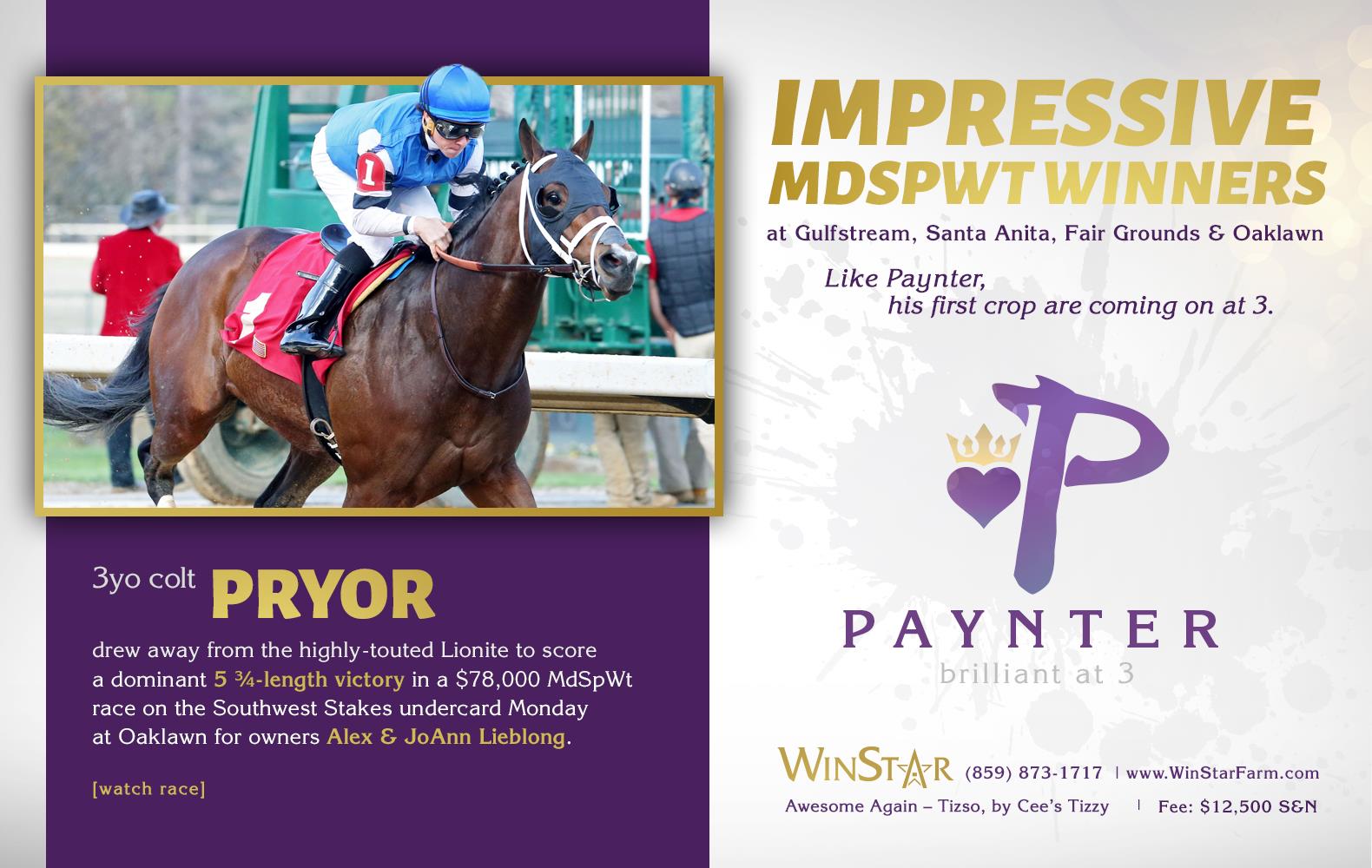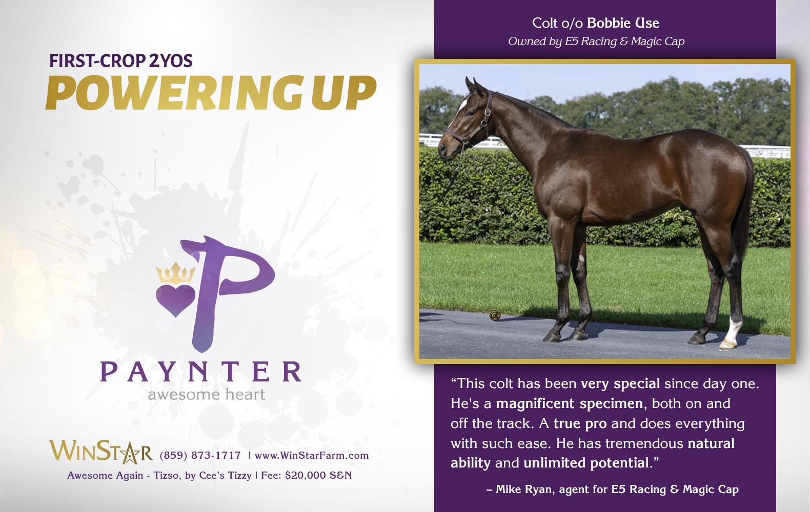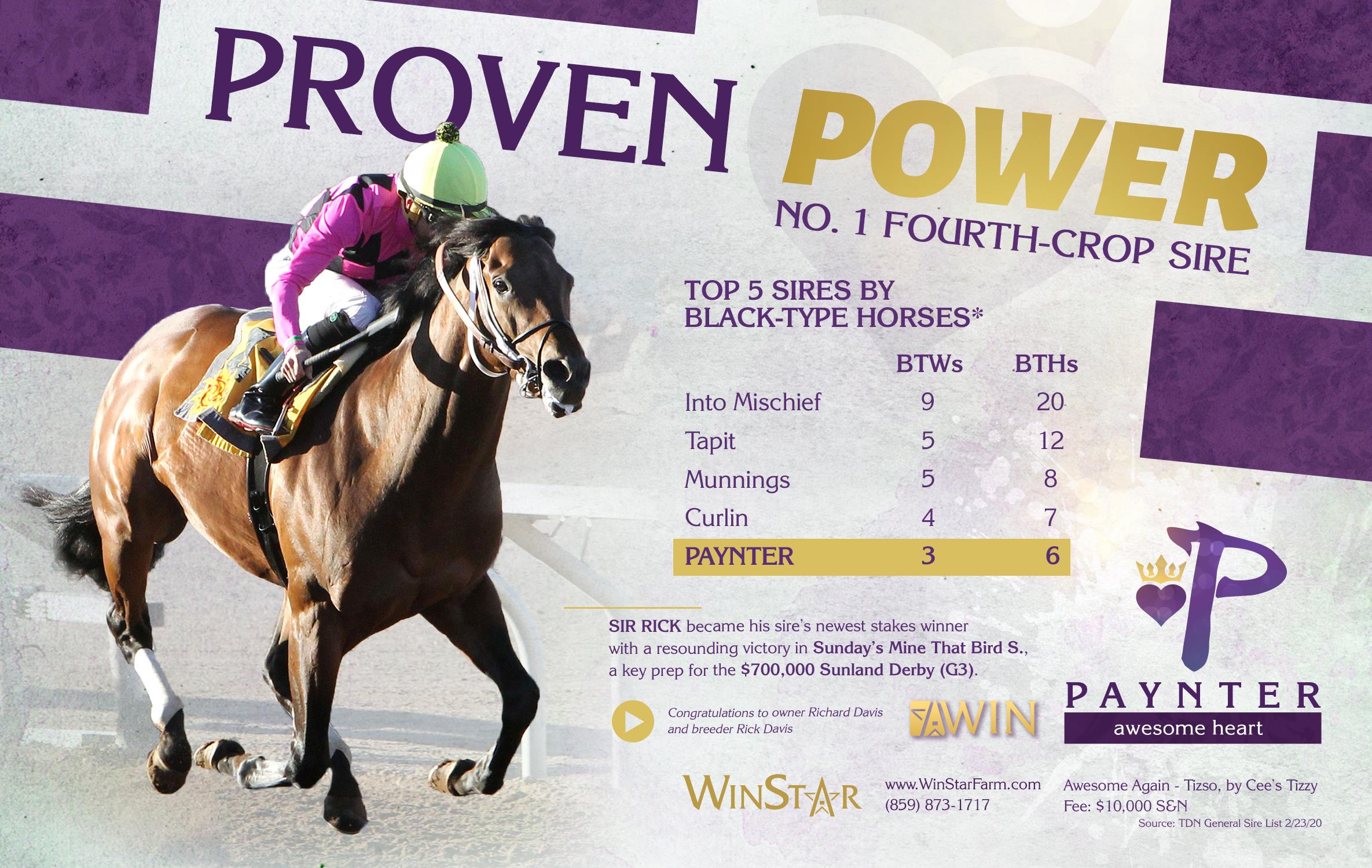 Paynter is already the sire of 23+ BTWs, including HOTY Knicks Go, who is out of a mare by Outflanker, a son of Danzig, and there are Awesome Again BTWs out of mares by Danzig sons Danehill, Dayjur, Langfuhr and Polish Numbers. From another branch of Northern Dancer, Paynter has a BTW out of a mare by Storm Cat. Outflanker is from the immediate family of A.P. Indy, and Paynter has sired GSWs out of mares by A.P. Indy sons Sauve and Mingun—A.P. Indy and sons and grandsons should be interesting here, especially Tapit. Out of Mr. Prospector line mares, he has BTWs out of mares by City Zip and his sire Carson City; Bandini, by Fusaichi Pegasus; and English Channel, by Smart Strike. There is a BTW from the sire line of Forty Niner, also the sire of Distorted Humor. From other branches of Mr. Prospector, there is a G1W on an Awesome Again cross over Gone West, making Speightstown, Elusive Quality, Mr. Greeley, and Grand Slam appealing choices. We can note Awesome Again line Classic winner Sir Winston out of a mare by Afleet Alex (by Northern Afleet). From the Fappiano branch of Mr. Prospector, Paynter has a BTW out of a mare by Quiet American and a BTW out of a mare by Unbridled’s Song. He has a GSW out of a mare by Dynaformer, a version of the successful Awesome Again cross with a Roberto line mare. Paynter has a BTW out of a mare by Holy Bull, another good cross under Awesome Again; a BTW out of a mare by Leroidesanimaux (sire of Animal Kingdom); a BTW out of a mare by Tiznow and a GSW out of a mare by his son Tiz Wonderful (both giving inbreeding to Tiznow and a sister). – Alan Porter