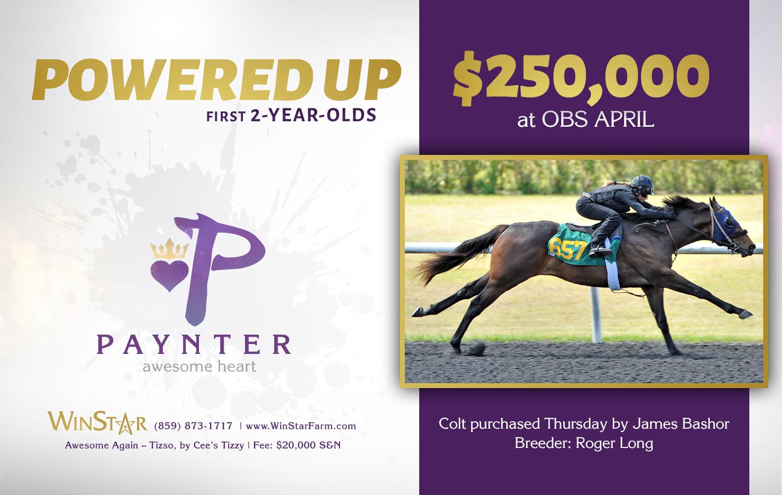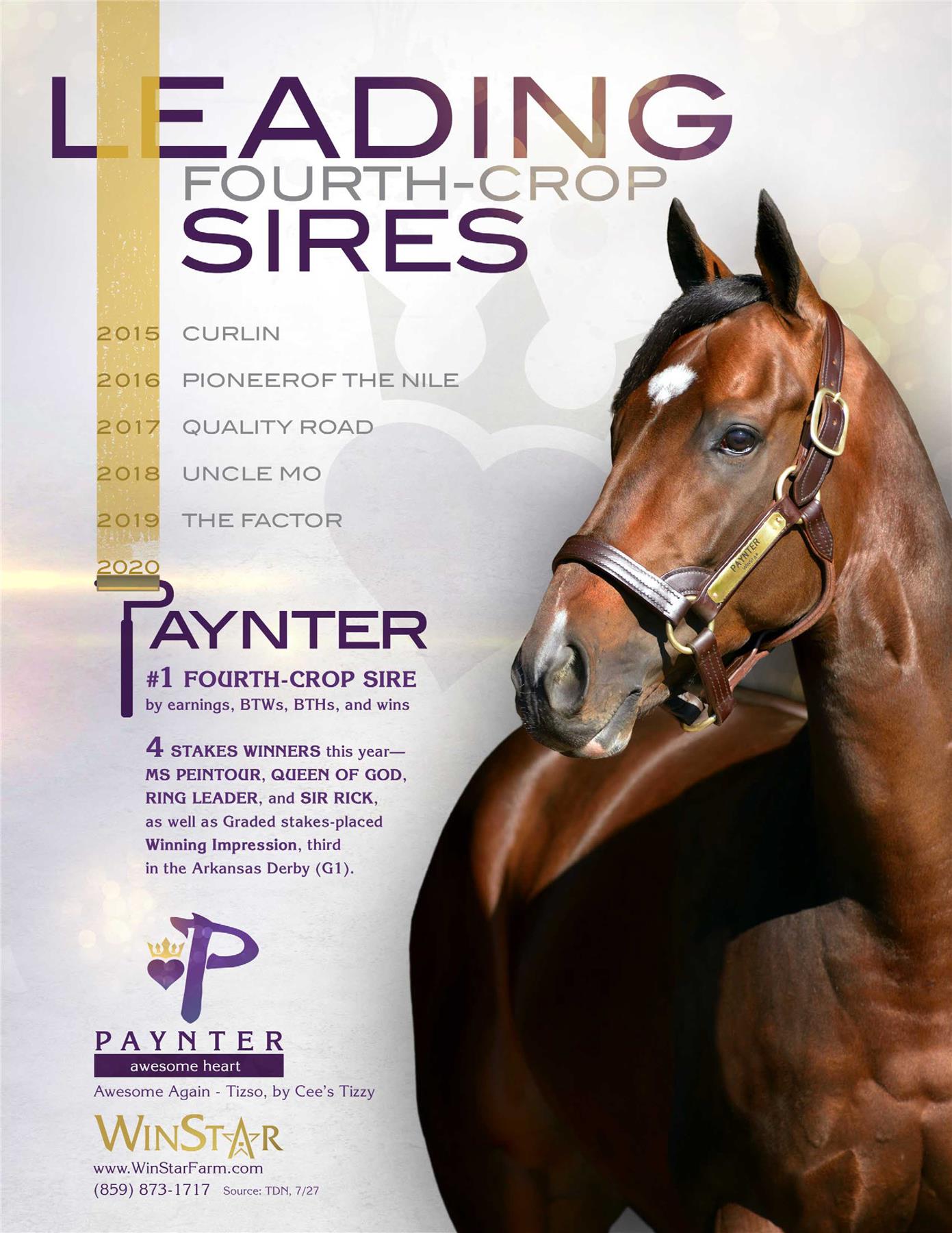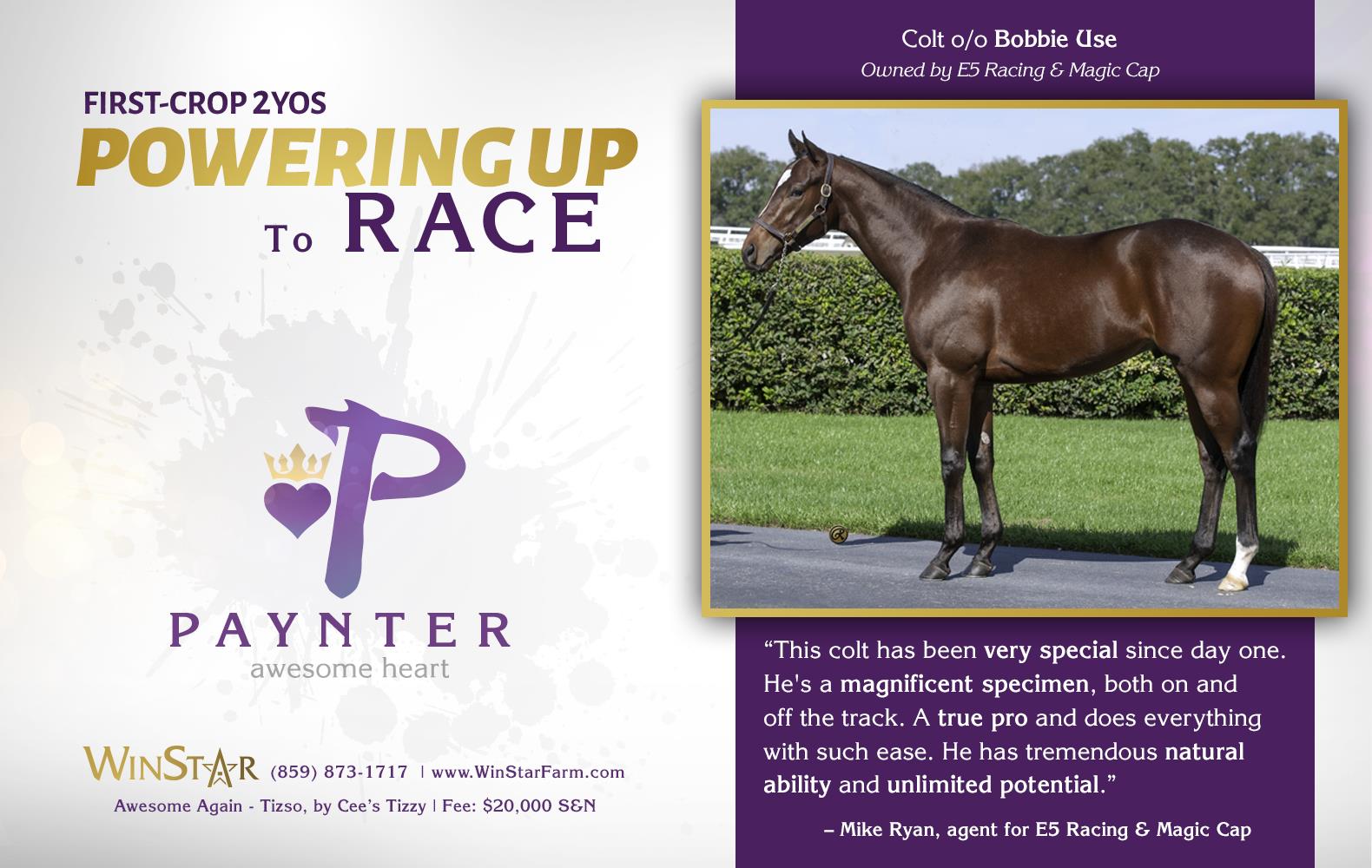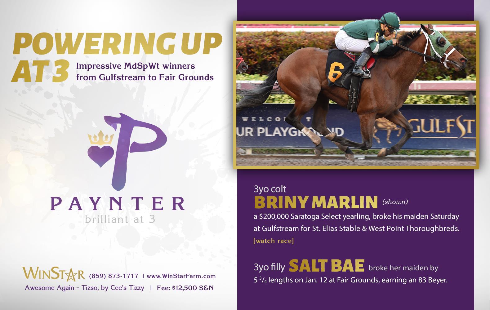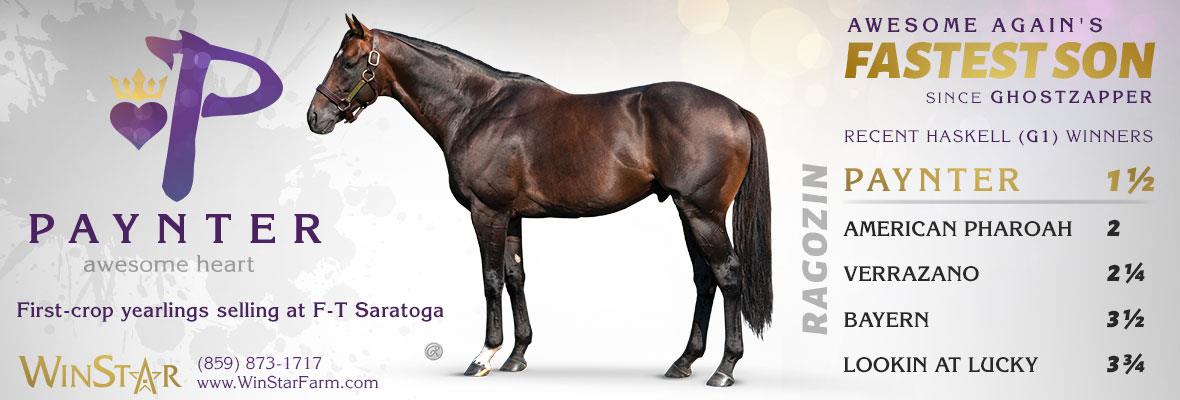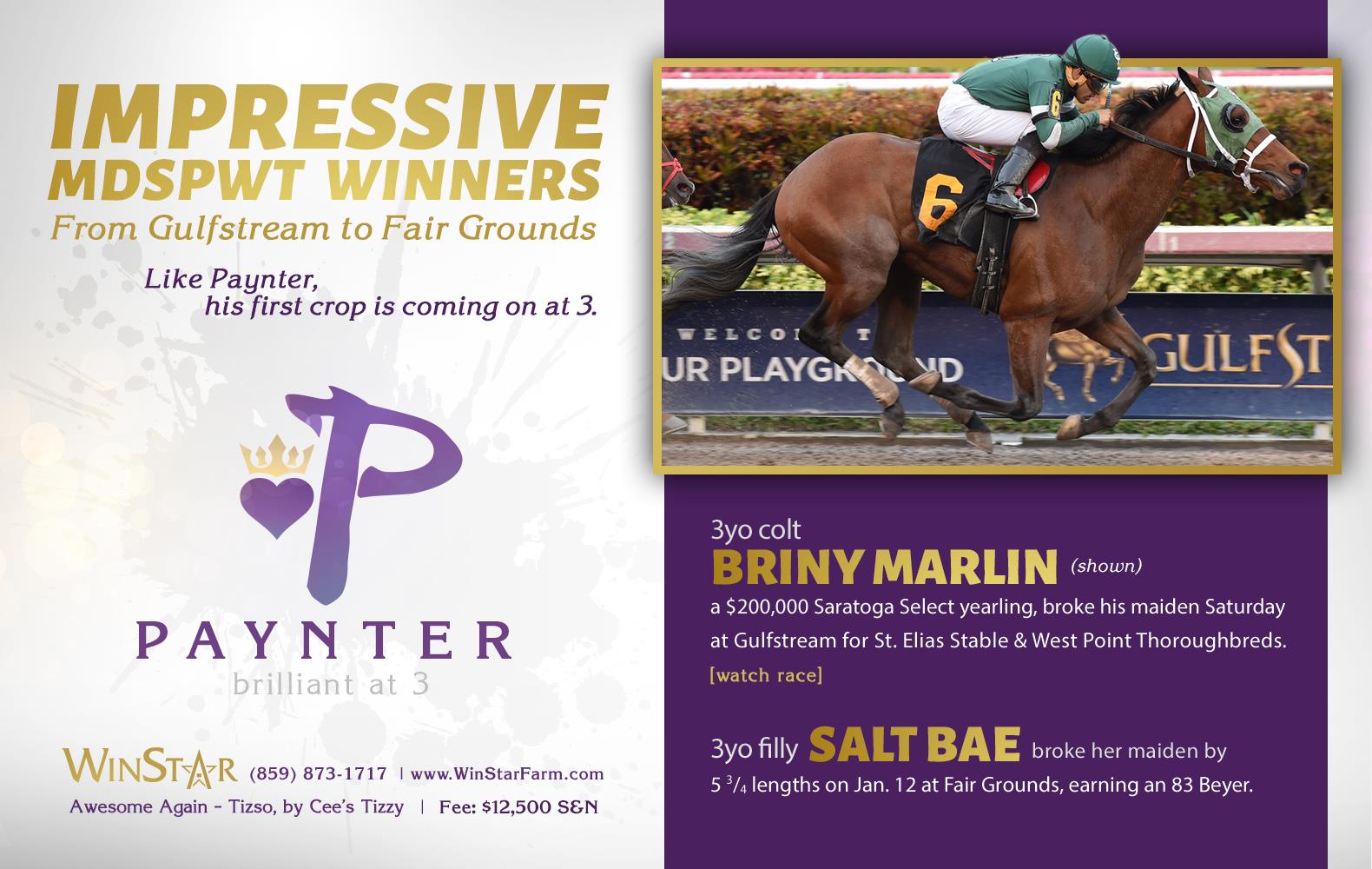 Paynter is already the sire of 23+ BTWs, including HOTY Knicks Go, who is out of a mare by Outflanker, a son of Danzig, and there are Awesome Again BTWs out of mares by Danzig sons Danehill, Dayjur, Langfuhr and Polish Numbers. From another branch of Northern Dancer, Paynter has a BTW out of a mare by Storm Cat. Outflanker is from the immediate family of A.P. Indy, and Paynter has sired GSWs out of mares by A.P. Indy sons Sauve and Mingun—A.P. Indy and sons and grandsons should be interesting here, especially Tapit. Out of Mr. Prospector line mares, he has BTWs out of mares by City Zip and his sire Carson City; Bandini, by Fusaichi Pegasus; and English Channel, by Smart Strike. There is a BTW from the sire line of Forty Niner, also the sire of Distorted Humor. From other branches of Mr. Prospector, there is a G1W on an Awesome Again cross over Gone West, making Speightstown, Elusive Quality, Mr. Greeley, and Grand Slam appealing choices. We can note Awesome Again line Classic winner Sir Winston out of a mare by Afleet Alex (by Northern Afleet). From the Fappiano branch of Mr. Prospector, Paynter has a BTW out of a mare by Quiet American and a BTW out of a mare by Unbridled’s Song. He has a GSW out of a mare by Dynaformer, a version of the successful Awesome Again cross with a Roberto line mare. Paynter has a BTW out of a mare by Holy Bull, another good cross under Awesome Again; a BTW out of a mare by Leroidesanimaux (sire of Animal Kingdom); a BTW out of a mare by Tiznow and a GSW out of a mare by his son Tiz Wonderful (both giving inbreeding to Tiznow and a sister). – Alan Porter