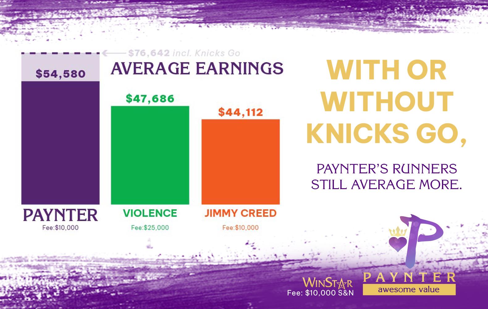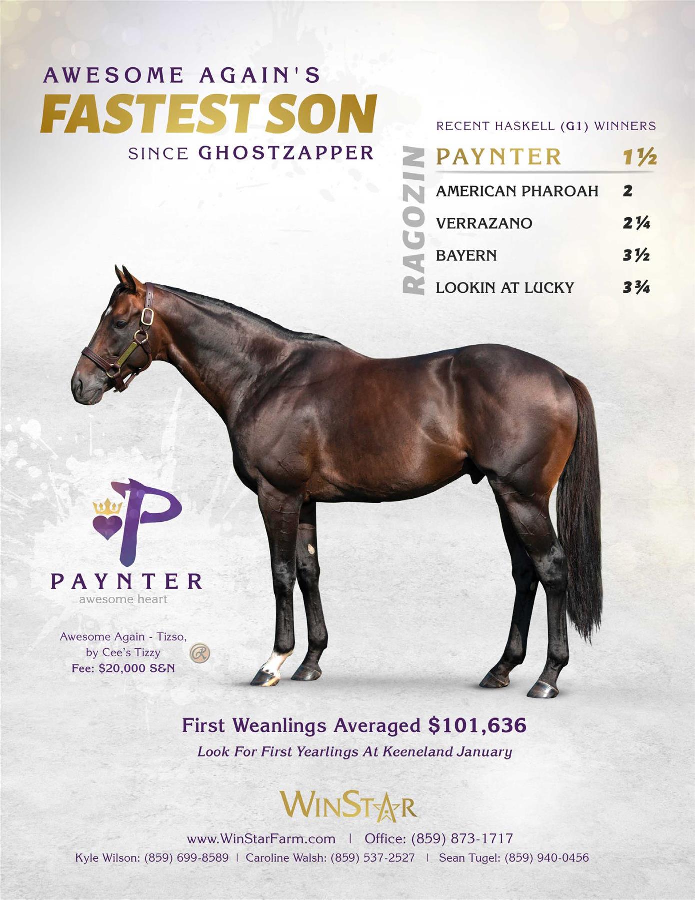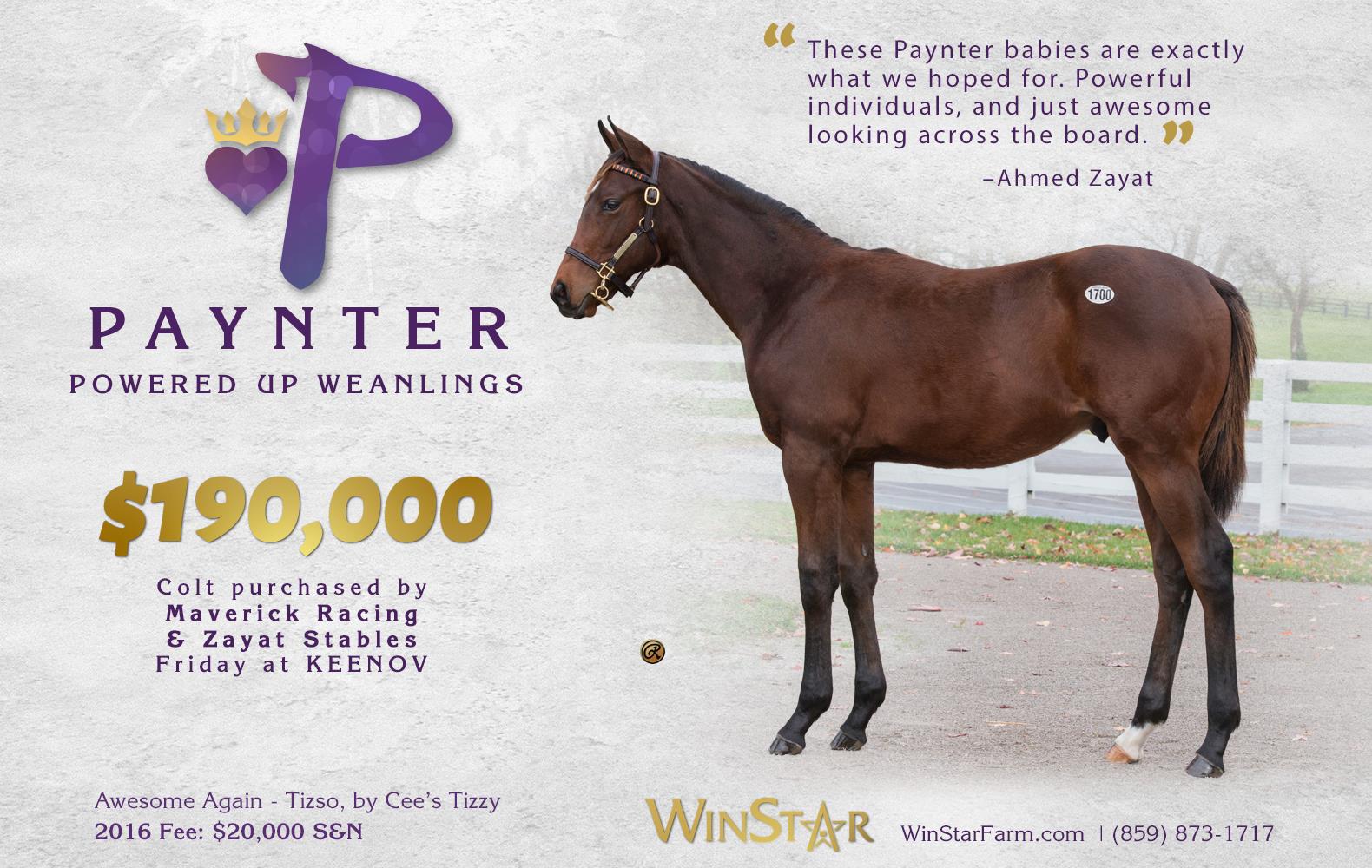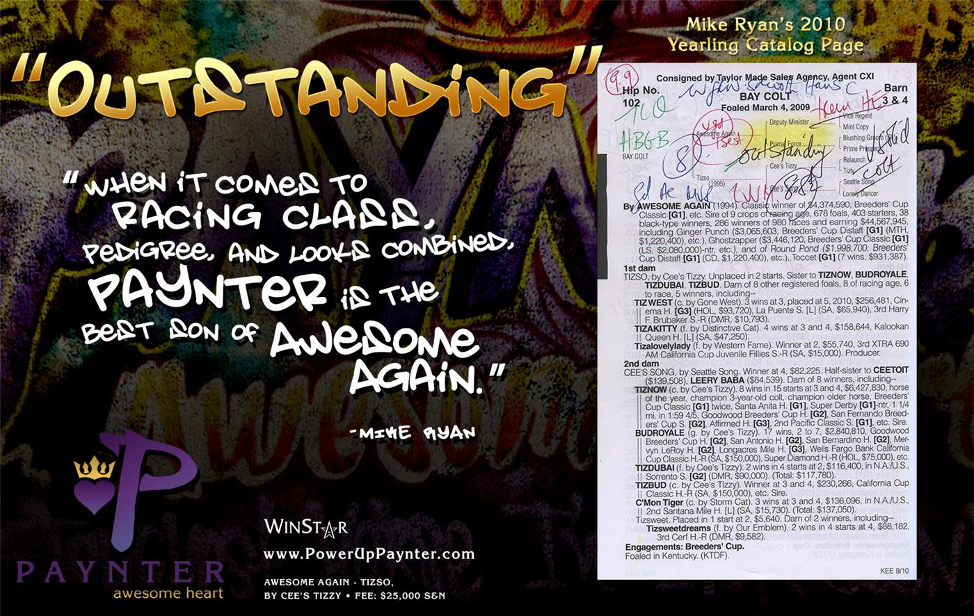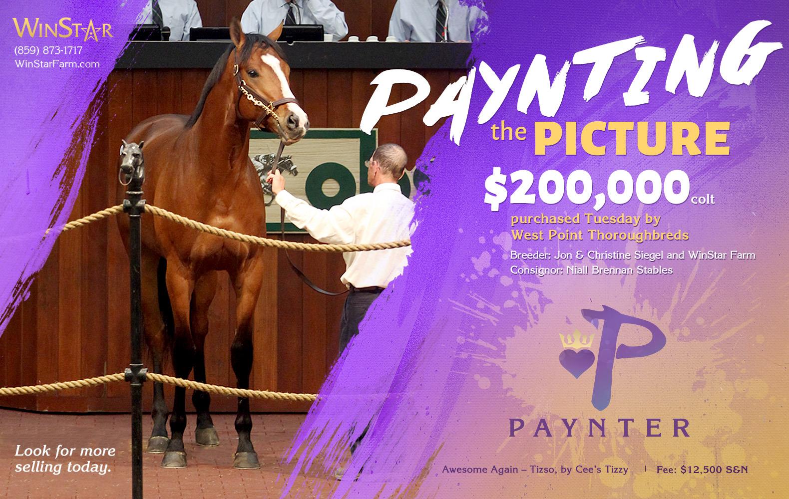 Paynter is already the sire of 23+ BTWs, including HOTY Knicks Go, who is out of a mare by Outflanker, a son of Danzig, and there are Awesome Again BTWs out of mares by Danzig sons Danehill, Dayjur, Langfuhr and Polish Numbers. From another branch of Northern Dancer, Paynter has a BTW out of a mare by Storm Cat. Outflanker is from the immediate family of A.P. Indy, and Paynter has sired GSWs out of mares by A.P. Indy sons Sauve and Mingun—A.P. Indy and sons and grandsons should be interesting here, especially Tapit. Out of Mr. Prospector line mares, he has BTWs out of mares by City Zip and his sire Carson City; Bandini, by Fusaichi Pegasus; and English Channel, by Smart Strike. There is a BTW from the sire line of Forty Niner, also the sire of Distorted Humor. From other branches of Mr. Prospector, there is a G1W on an Awesome Again cross over Gone West, making Speightstown, Elusive Quality, Mr. Greeley, and Grand Slam appealing choices. We can note Awesome Again line Classic winner Sir Winston out of a mare by Afleet Alex (by Northern Afleet). From the Fappiano branch of Mr. Prospector, Paynter has a BTW out of a mare by Quiet American and a BTW out of a mare by Unbridled’s Song. He has a GSW out of a mare by Dynaformer, a version of the successful Awesome Again cross with a Roberto line mare. Paynter has a BTW out of a mare by Holy Bull, another good cross under Awesome Again; a BTW out of a mare by Leroidesanimaux (sire of Animal Kingdom); a BTW out of a mare by Tiznow and a GSW out of a mare by his son Tiz Wonderful (both giving inbreeding to Tiznow and a sister). – Alan Porter