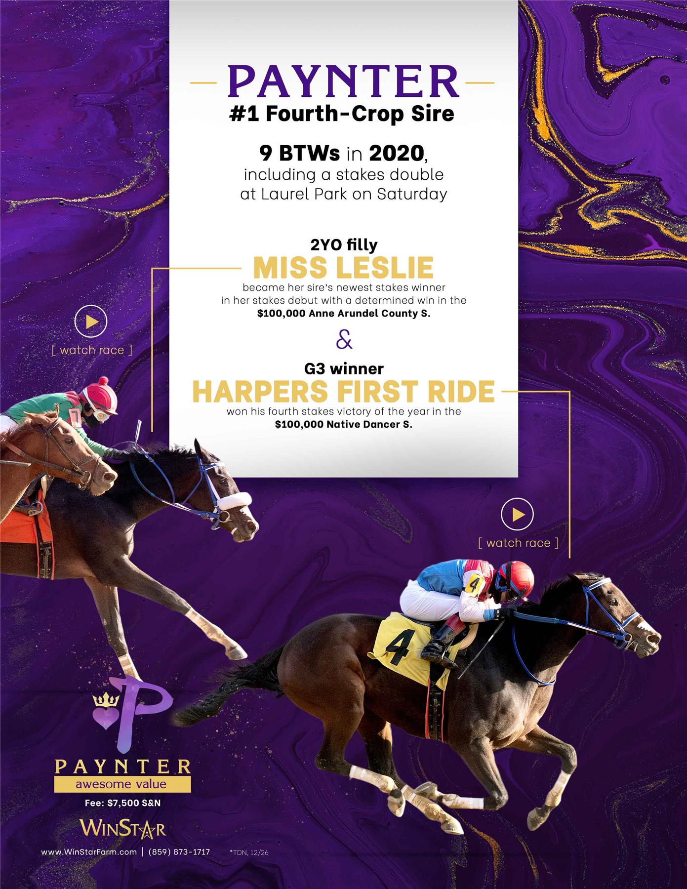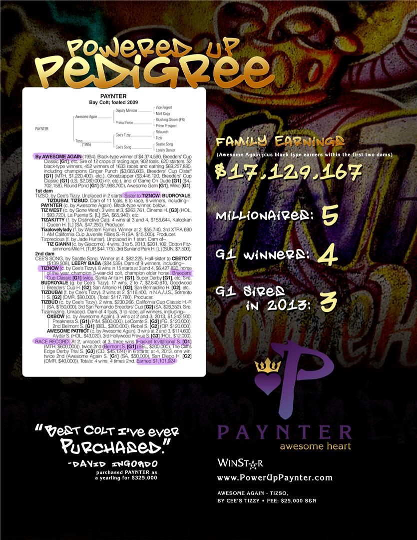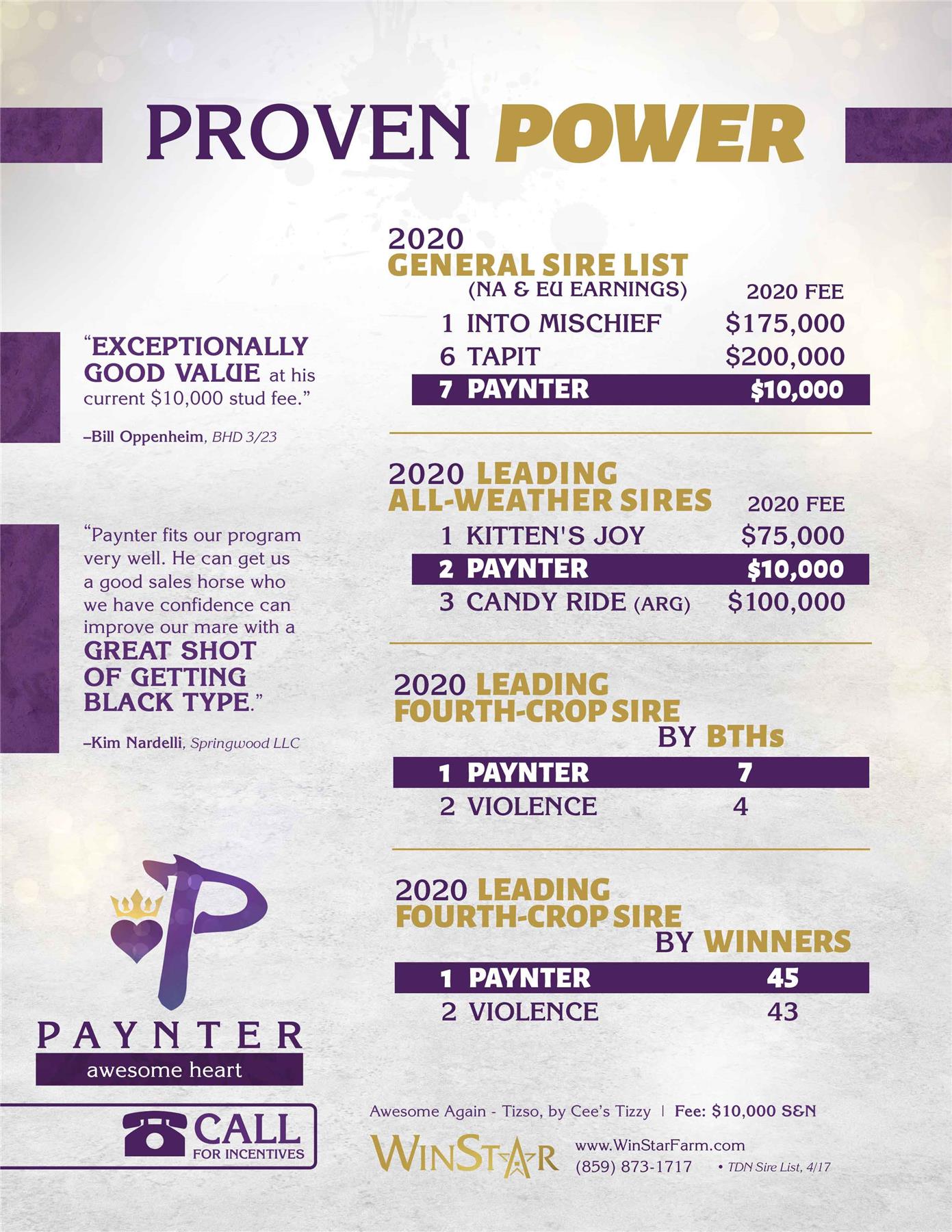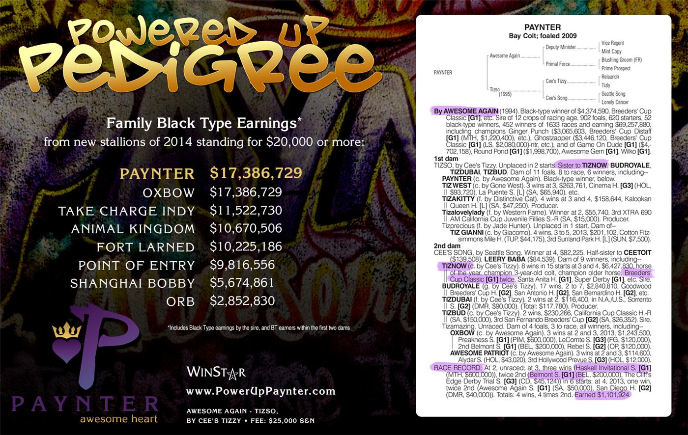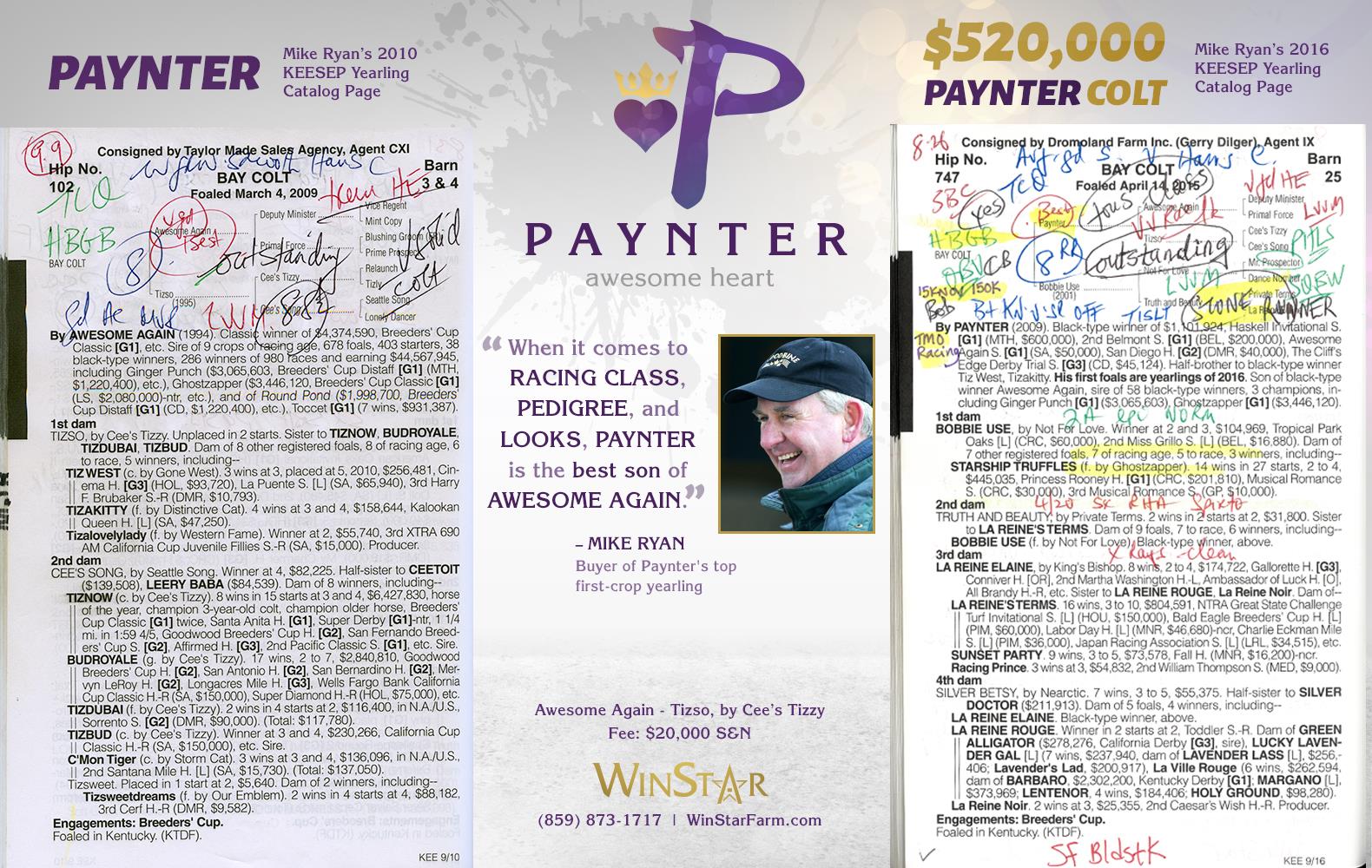 Paynter is already the sire of 23+ BTWs, including HOTY Knicks Go, who is out of a mare by Outflanker, a son of Danzig, and there are Awesome Again BTWs out of mares by Danzig sons Danehill, Dayjur, Langfuhr and Polish Numbers. From another branch of Northern Dancer, Paynter has a BTW out of a mare by Storm Cat. Outflanker is from the immediate family of A.P. Indy, and Paynter has sired GSWs out of mares by A.P. Indy sons Sauve and Mingun—A.P. Indy and sons and grandsons should be interesting here, especially Tapit. Out of Mr. Prospector line mares, he has BTWs out of mares by City Zip and his sire Carson City; Bandini, by Fusaichi Pegasus; and English Channel, by Smart Strike. There is a BTW from the sire line of Forty Niner, also the sire of Distorted Humor. From other branches of Mr. Prospector, there is a G1W on an Awesome Again cross over Gone West, making Speightstown, Elusive Quality, Mr. Greeley, and Grand Slam appealing choices. We can note Awesome Again line Classic winner Sir Winston out of a mare by Afleet Alex (by Northern Afleet). From the Fappiano branch of Mr. Prospector, Paynter has a BTW out of a mare by Quiet American and a BTW out of a mare by Unbridled’s Song. He has a GSW out of a mare by Dynaformer, a version of the successful Awesome Again cross with a Roberto line mare. Paynter has a BTW out of a mare by Holy Bull, another good cross under Awesome Again; a BTW out of a mare by Leroidesanimaux (sire of Animal Kingdom); a BTW out of a mare by Tiznow and a GSW out of a mare by his son Tiz Wonderful (both giving inbreeding to Tiznow and a sister). – Alan Porter