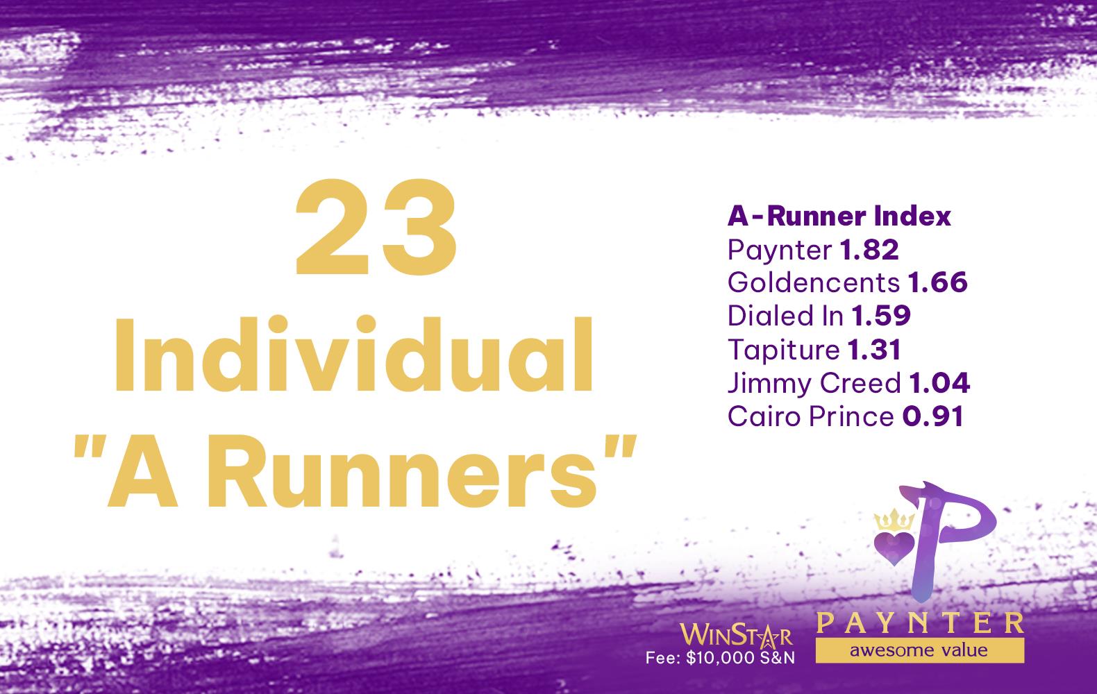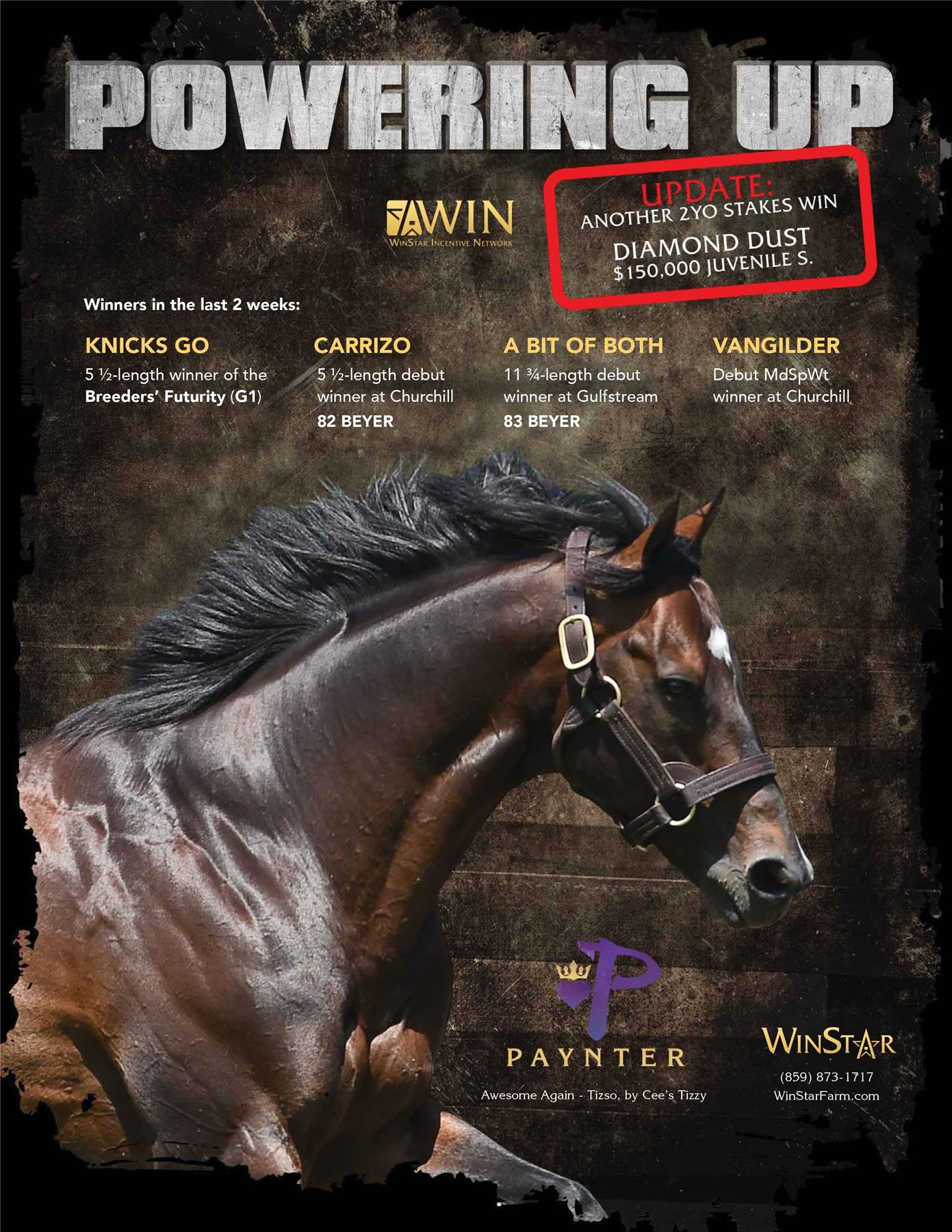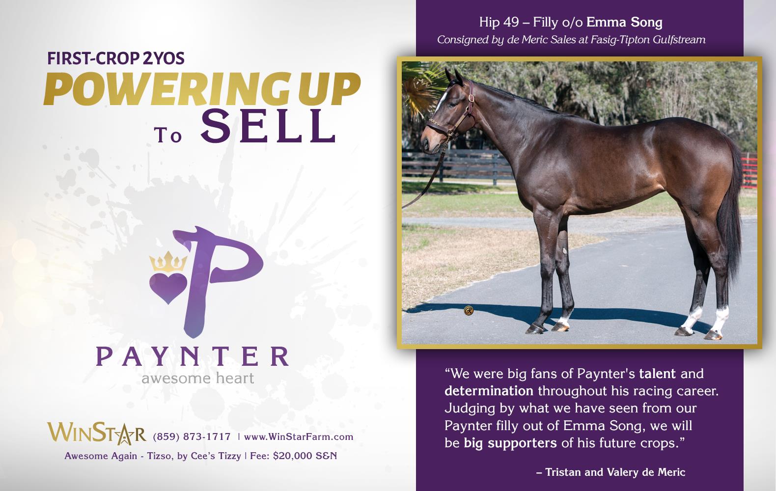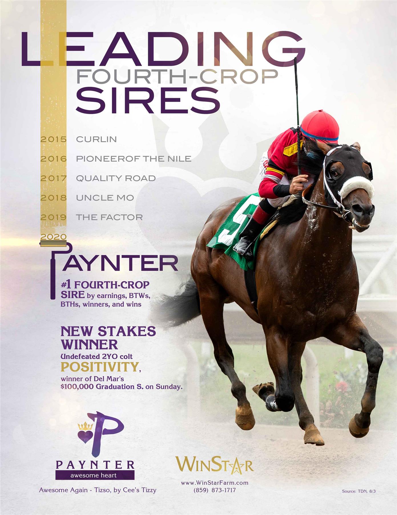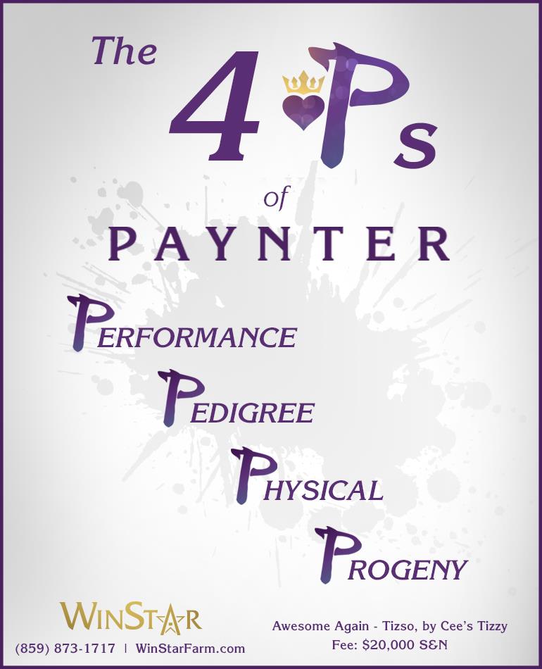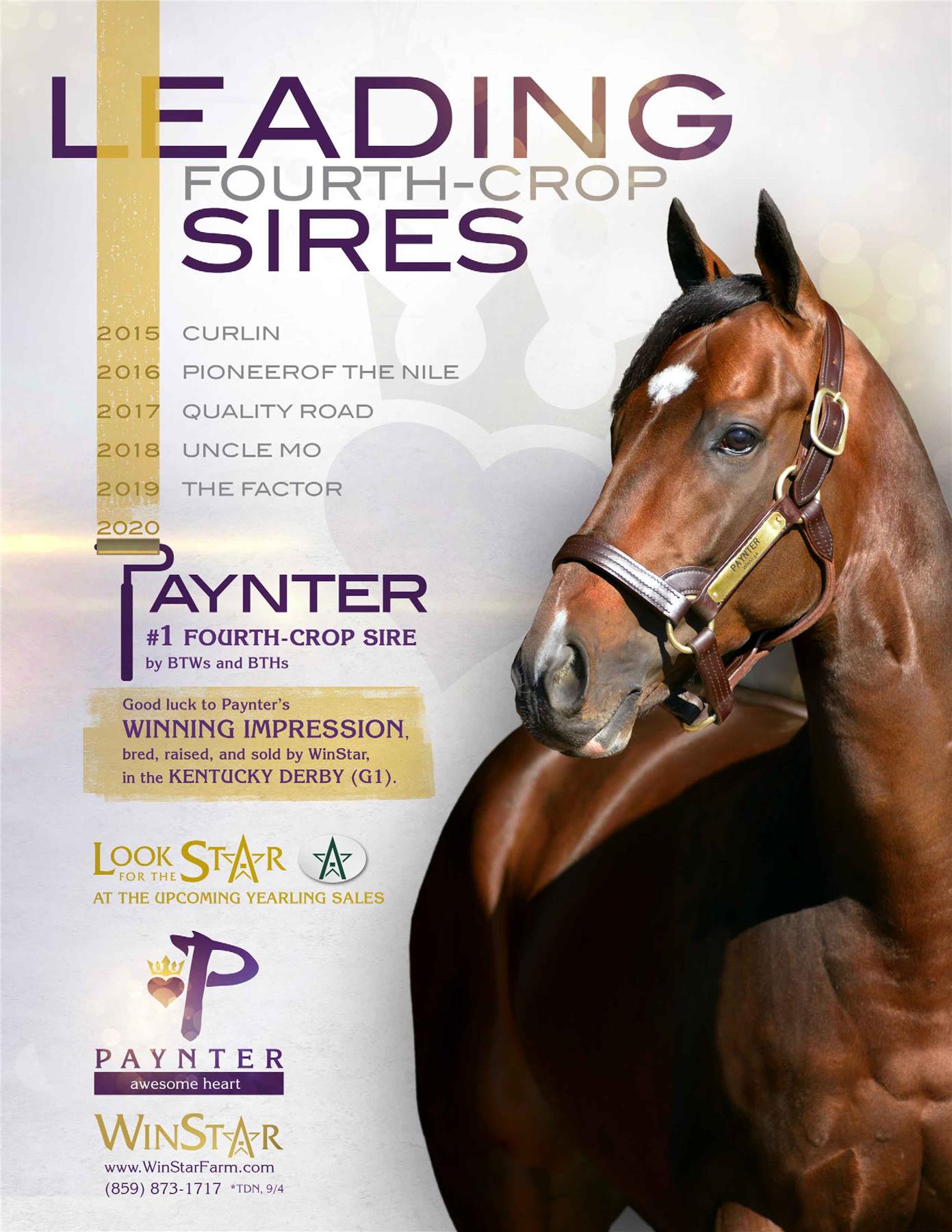 Paynter is already the sire of 23+ BTWs, including HOTY Knicks Go, who is out of a mare by Outflanker, a son of Danzig, and there are Awesome Again BTWs out of mares by Danzig sons Danehill, Dayjur, Langfuhr and Polish Numbers. From another branch of Northern Dancer, Paynter has a BTW out of a mare by Storm Cat. Outflanker is from the immediate family of A.P. Indy, and Paynter has sired GSWs out of mares by A.P. Indy sons Sauve and Mingun—A.P. Indy and sons and grandsons should be interesting here, especially Tapit. Out of Mr. Prospector line mares, he has BTWs out of mares by City Zip and his sire Carson City; Bandini, by Fusaichi Pegasus; and English Channel, by Smart Strike. There is a BTW from the sire line of Forty Niner, also the sire of Distorted Humor. From other branches of Mr. Prospector, there is a G1W on an Awesome Again cross over Gone West, making Speightstown, Elusive Quality, Mr. Greeley, and Grand Slam appealing choices. We can note Awesome Again line Classic winner Sir Winston out of a mare by Afleet Alex (by Northern Afleet). From the Fappiano branch of Mr. Prospector, Paynter has a BTW out of a mare by Quiet American and a BTW out of a mare by Unbridled’s Song. He has a GSW out of a mare by Dynaformer, a version of the successful Awesome Again cross with a Roberto line mare. Paynter has a BTW out of a mare by Holy Bull, another good cross under Awesome Again; a BTW out of a mare by Leroidesanimaux (sire of Animal Kingdom); a BTW out of a mare by Tiznow and a GSW out of a mare by his son Tiz Wonderful (both giving inbreeding to Tiznow and a sister). – Alan Porter