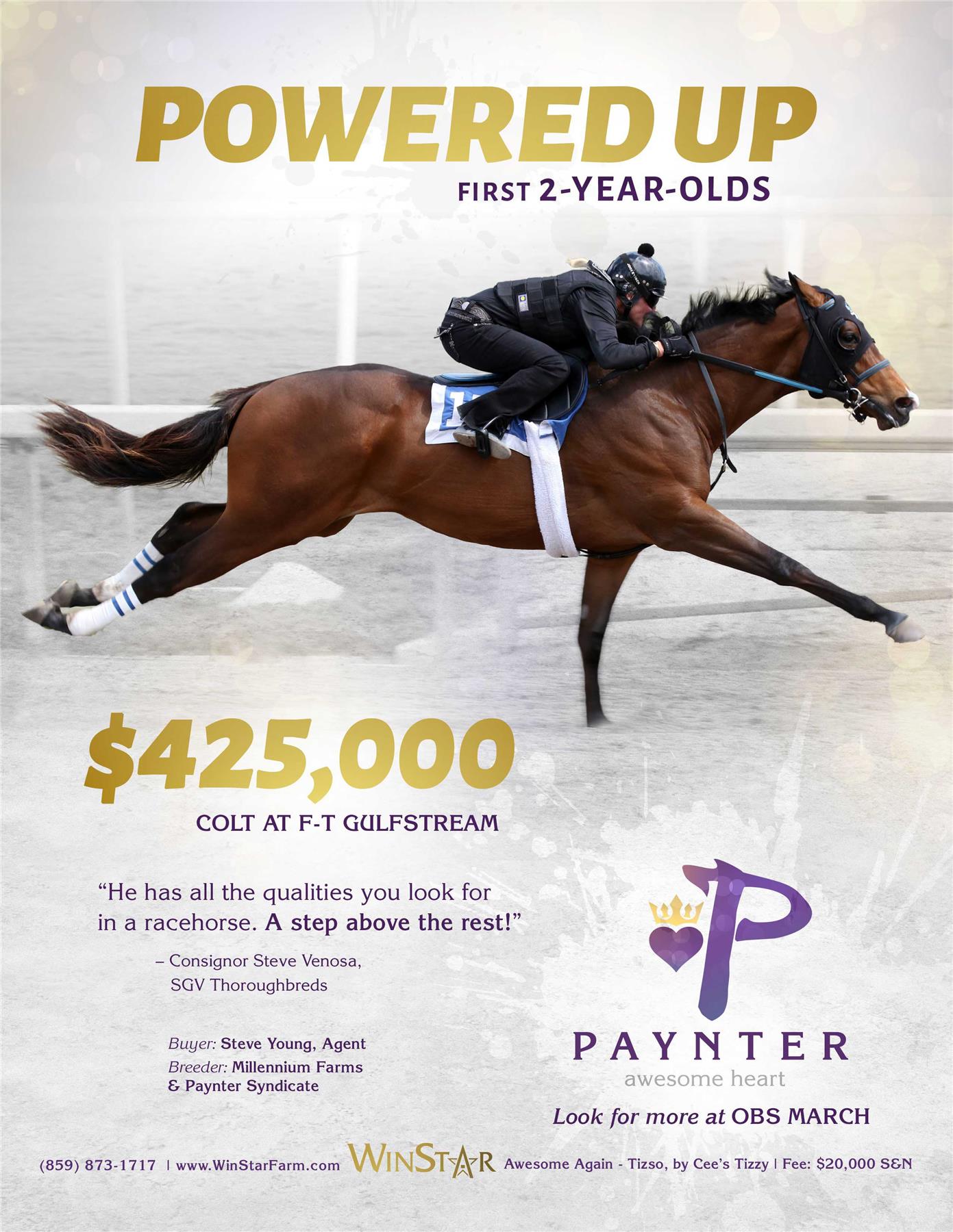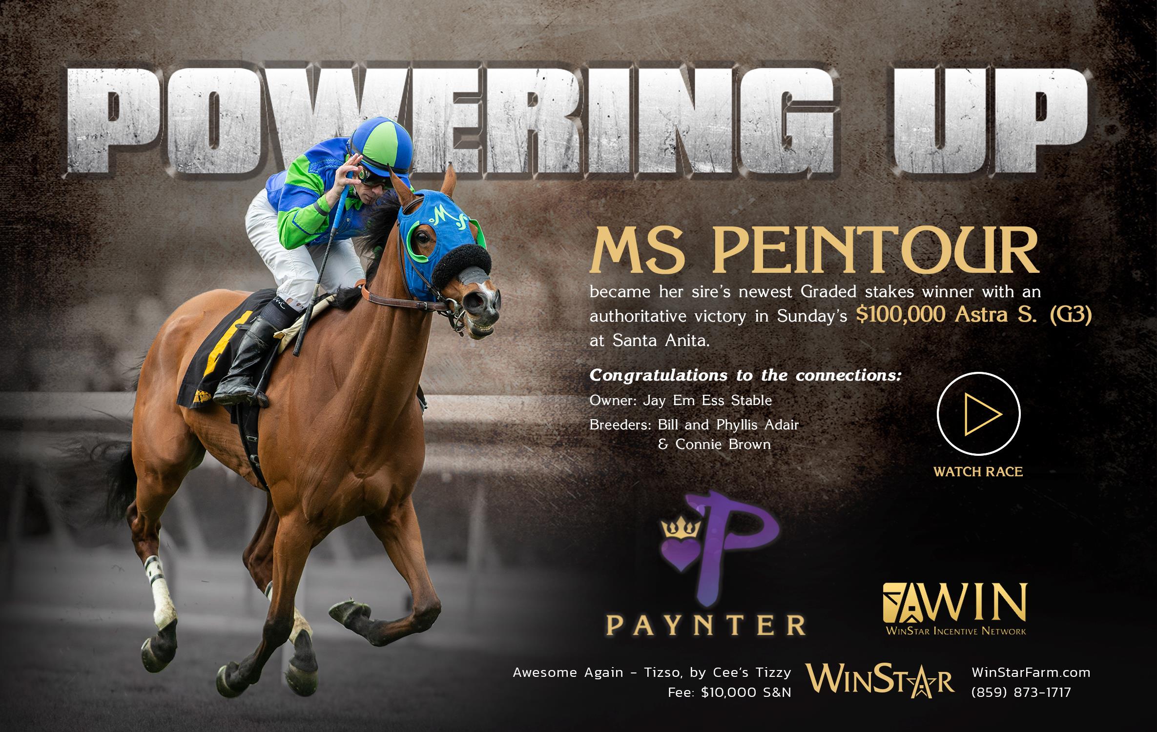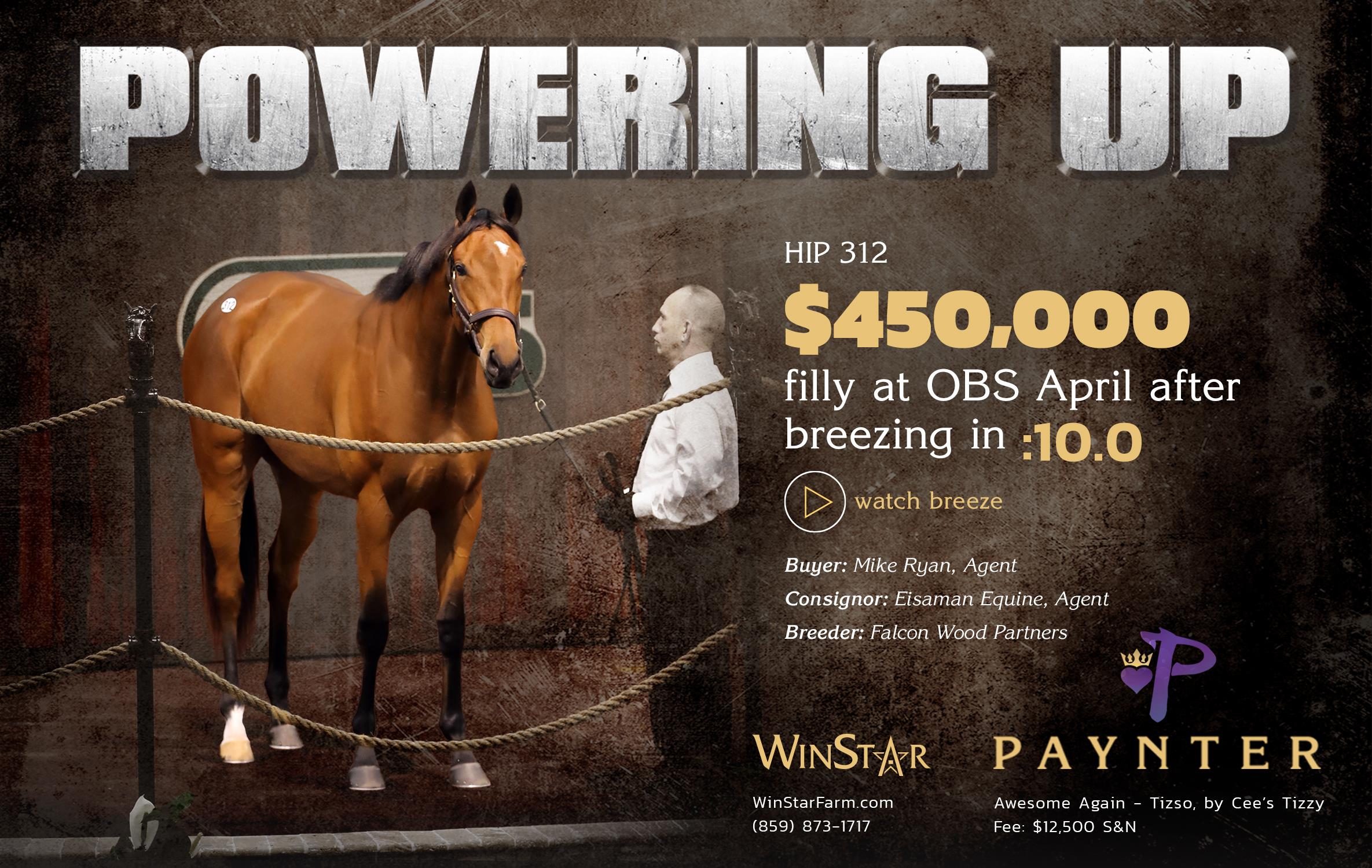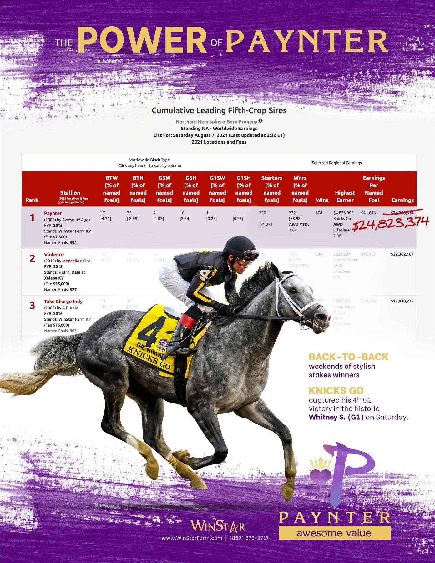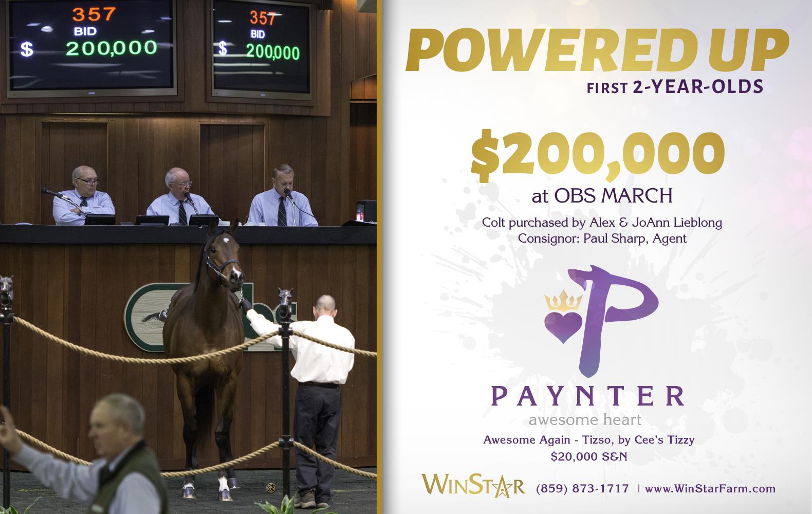 Paynter is already the sire of 23+ BTWs, including HOTY Knicks Go, who is out of a mare by Outflanker, a son of Danzig, and there are Awesome Again BTWs out of mares by Danzig sons Danehill, Dayjur, Langfuhr and Polish Numbers. From another branch of Northern Dancer, Paynter has a BTW out of a mare by Storm Cat. Outflanker is from the immediate family of A.P. Indy, and Paynter has sired GSWs out of mares by A.P. Indy sons Sauve and Mingun—A.P. Indy and sons and grandsons should be interesting here, especially Tapit. Out of Mr. Prospector line mares, he has BTWs out of mares by City Zip and his sire Carson City; Bandini, by Fusaichi Pegasus; and English Channel, by Smart Strike. There is a BTW from the sire line of Forty Niner, also the sire of Distorted Humor. From other branches of Mr. Prospector, there is a G1W on an Awesome Again cross over Gone West, making Speightstown, Elusive Quality, Mr. Greeley, and Grand Slam appealing choices. We can note Awesome Again line Classic winner Sir Winston out of a mare by Afleet Alex (by Northern Afleet). From the Fappiano branch of Mr. Prospector, Paynter has a BTW out of a mare by Quiet American and a BTW out of a mare by Unbridled’s Song. He has a GSW out of a mare by Dynaformer, a version of the successful Awesome Again cross with a Roberto line mare. Paynter has a BTW out of a mare by Holy Bull, another good cross under Awesome Again; a BTW out of a mare by Leroidesanimaux (sire of Animal Kingdom); a BTW out of a mare by Tiznow and a GSW out of a mare by his son Tiz Wonderful (both giving inbreeding to Tiznow and a sister). – Alan Porter