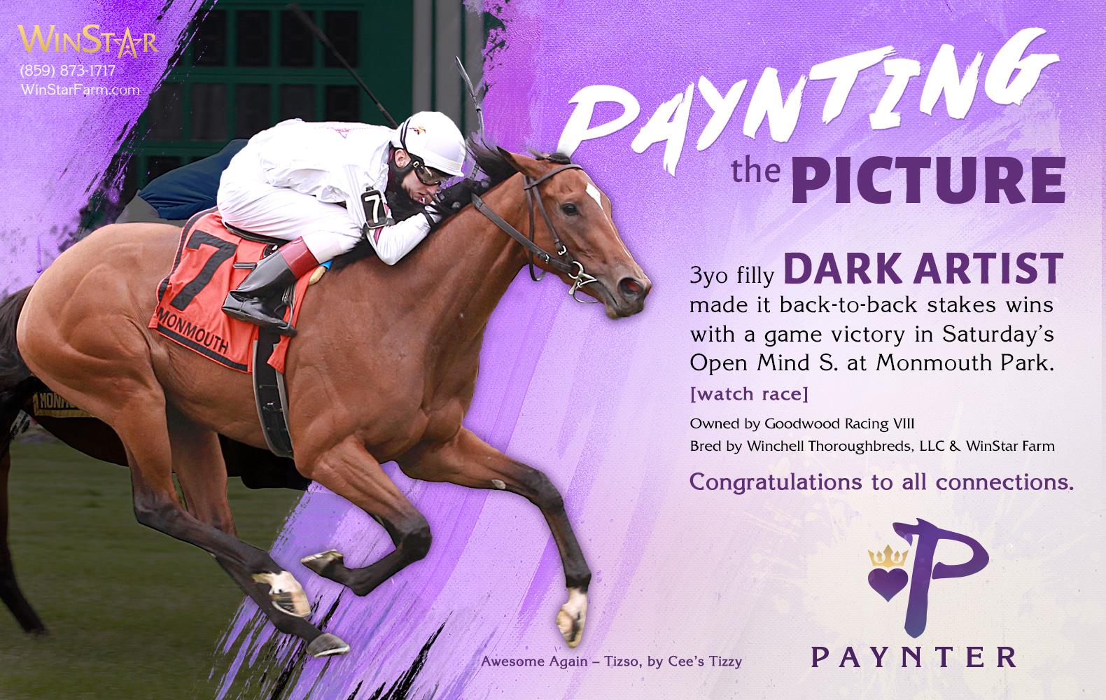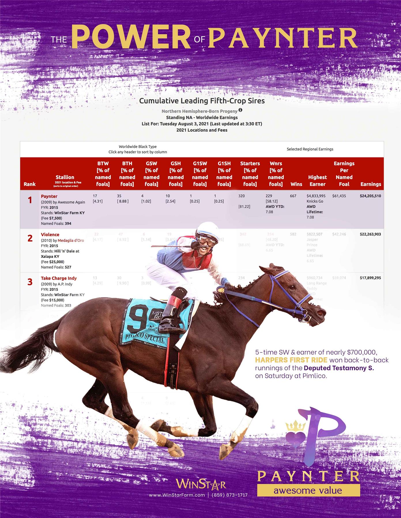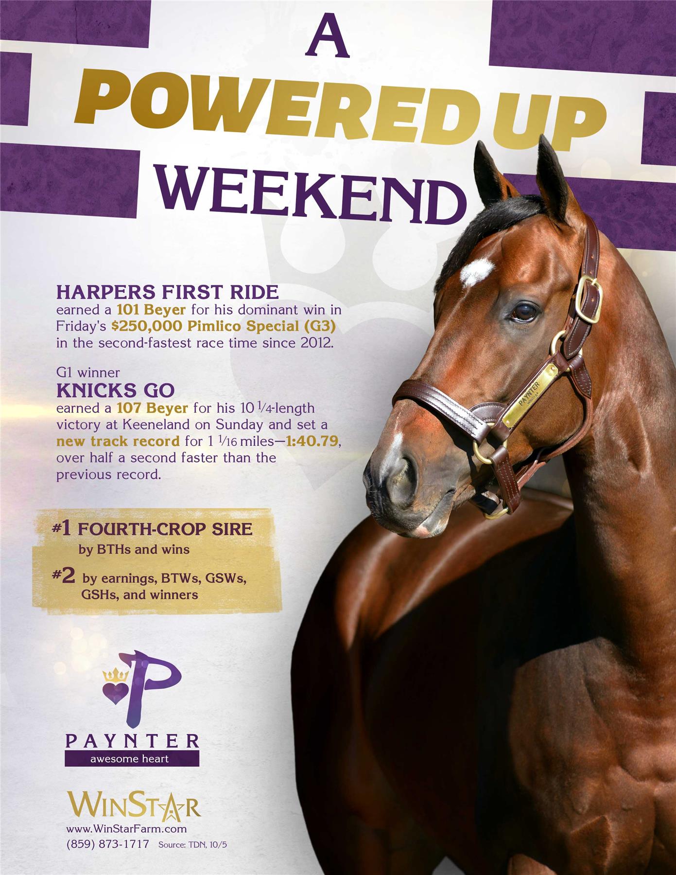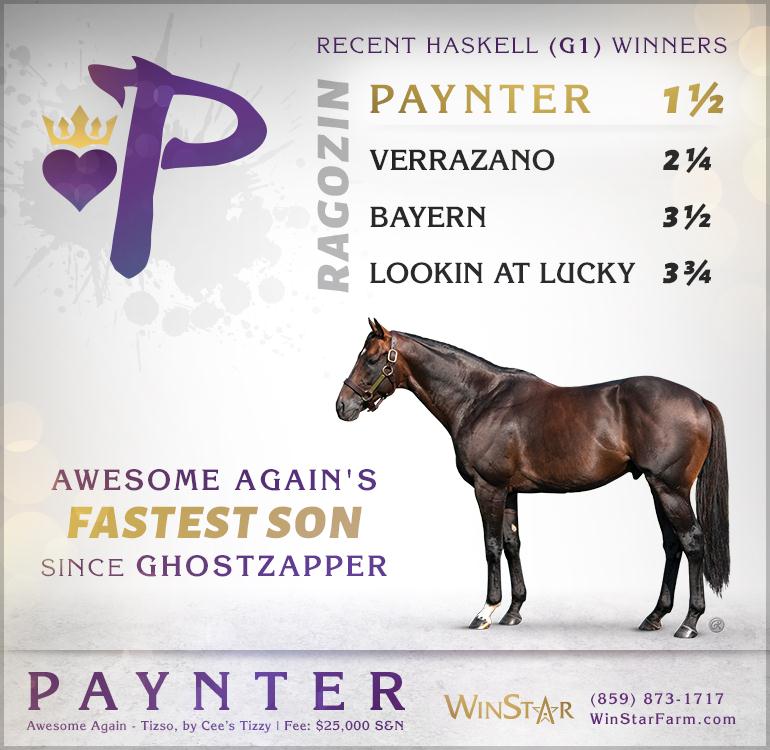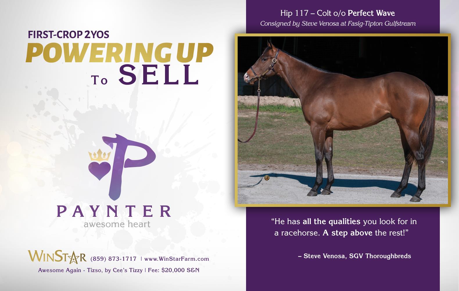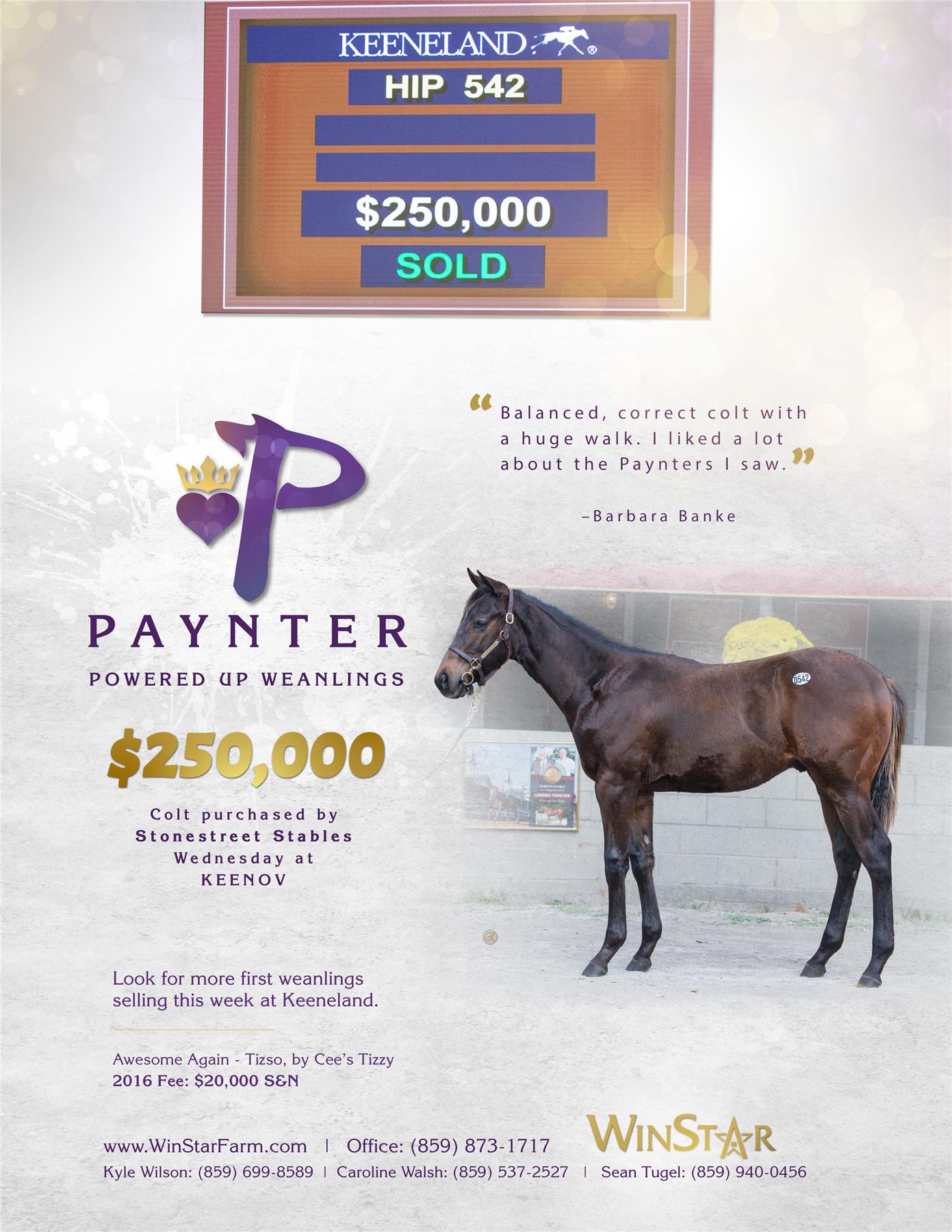 Paynter is already the sire of 23+ BTWs, including HOTY Knicks Go, who is out of a mare by Outflanker, a son of Danzig, and there are Awesome Again BTWs out of mares by Danzig sons Danehill, Dayjur, Langfuhr and Polish Numbers. From another branch of Northern Dancer, Paynter has a BTW out of a mare by Storm Cat. Outflanker is from the immediate family of A.P. Indy, and Paynter has sired GSWs out of mares by A.P. Indy sons Sauve and Mingun—A.P. Indy and sons and grandsons should be interesting here, especially Tapit. Out of Mr. Prospector line mares, he has BTWs out of mares by City Zip and his sire Carson City; Bandini, by Fusaichi Pegasus; and English Channel, by Smart Strike. There is a BTW from the sire line of Forty Niner, also the sire of Distorted Humor. From other branches of Mr. Prospector, there is a G1W on an Awesome Again cross over Gone West, making Speightstown, Elusive Quality, Mr. Greeley, and Grand Slam appealing choices. We can note Awesome Again line Classic winner Sir Winston out of a mare by Afleet Alex (by Northern Afleet). From the Fappiano branch of Mr. Prospector, Paynter has a BTW out of a mare by Quiet American and a BTW out of a mare by Unbridled’s Song. He has a GSW out of a mare by Dynaformer, a version of the successful Awesome Again cross with a Roberto line mare. Paynter has a BTW out of a mare by Holy Bull, another good cross under Awesome Again; a BTW out of a mare by Leroidesanimaux (sire of Animal Kingdom); a BTW out of a mare by Tiznow and a GSW out of a mare by his son Tiz Wonderful (both giving inbreeding to Tiznow and a sister). – Alan Porter
