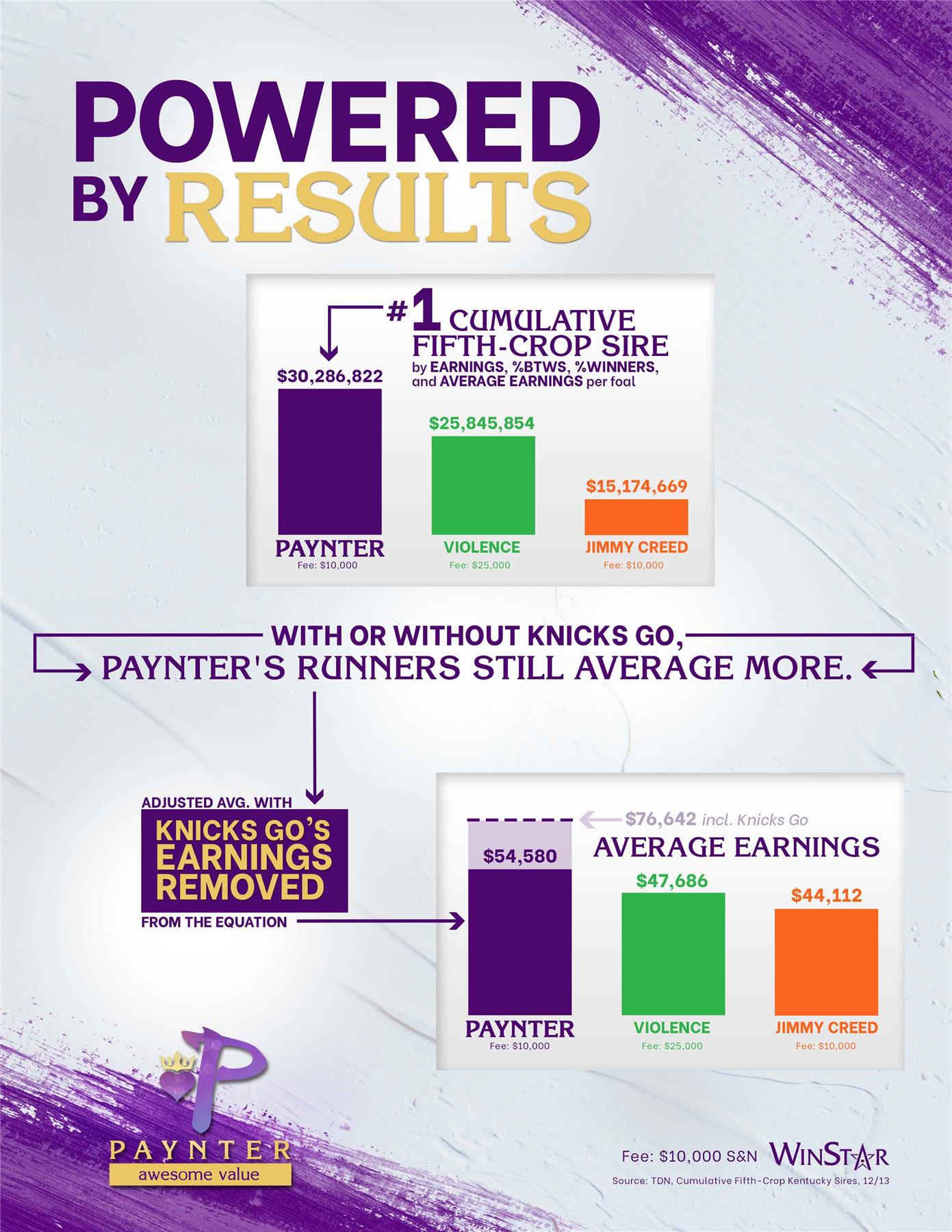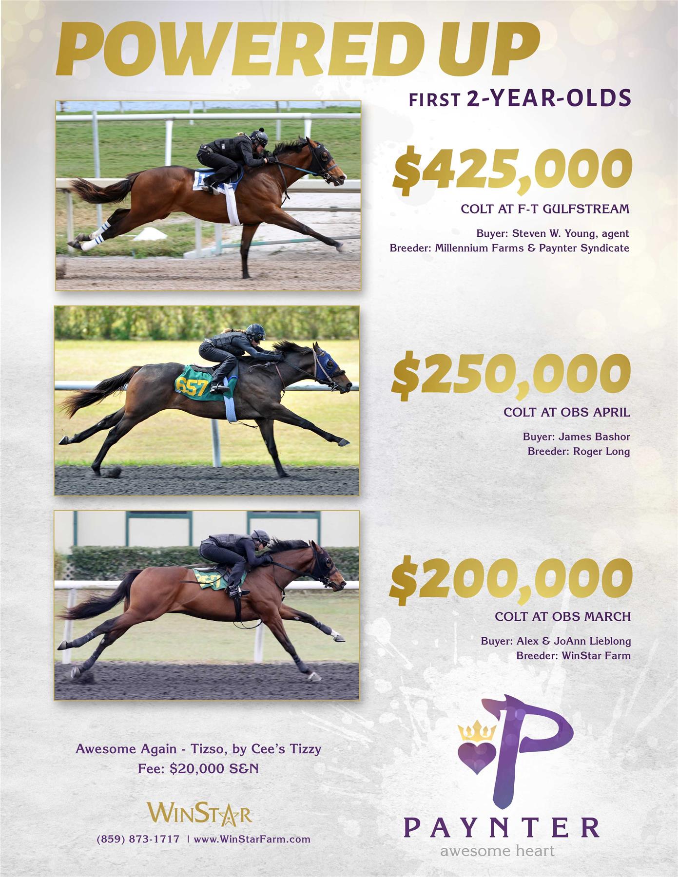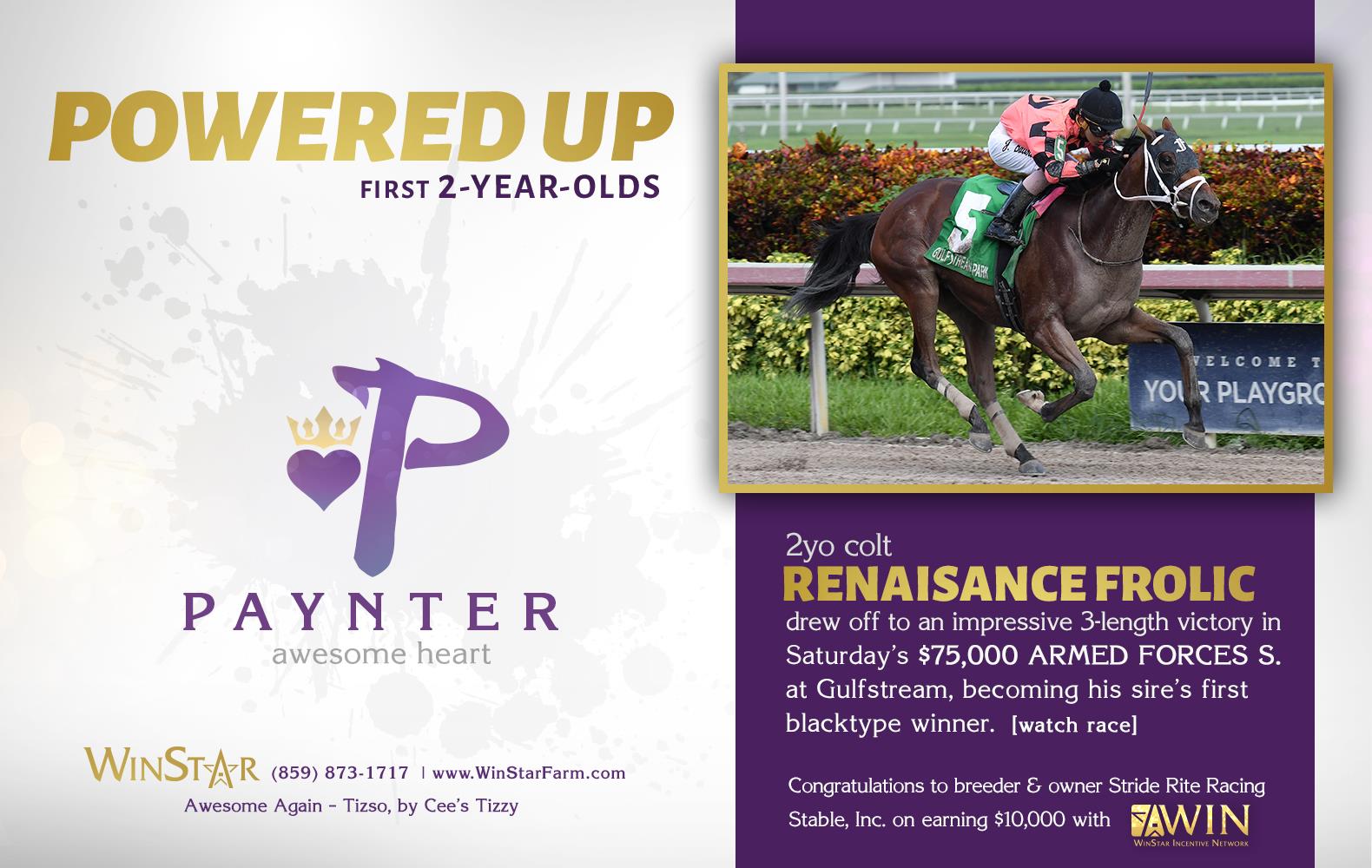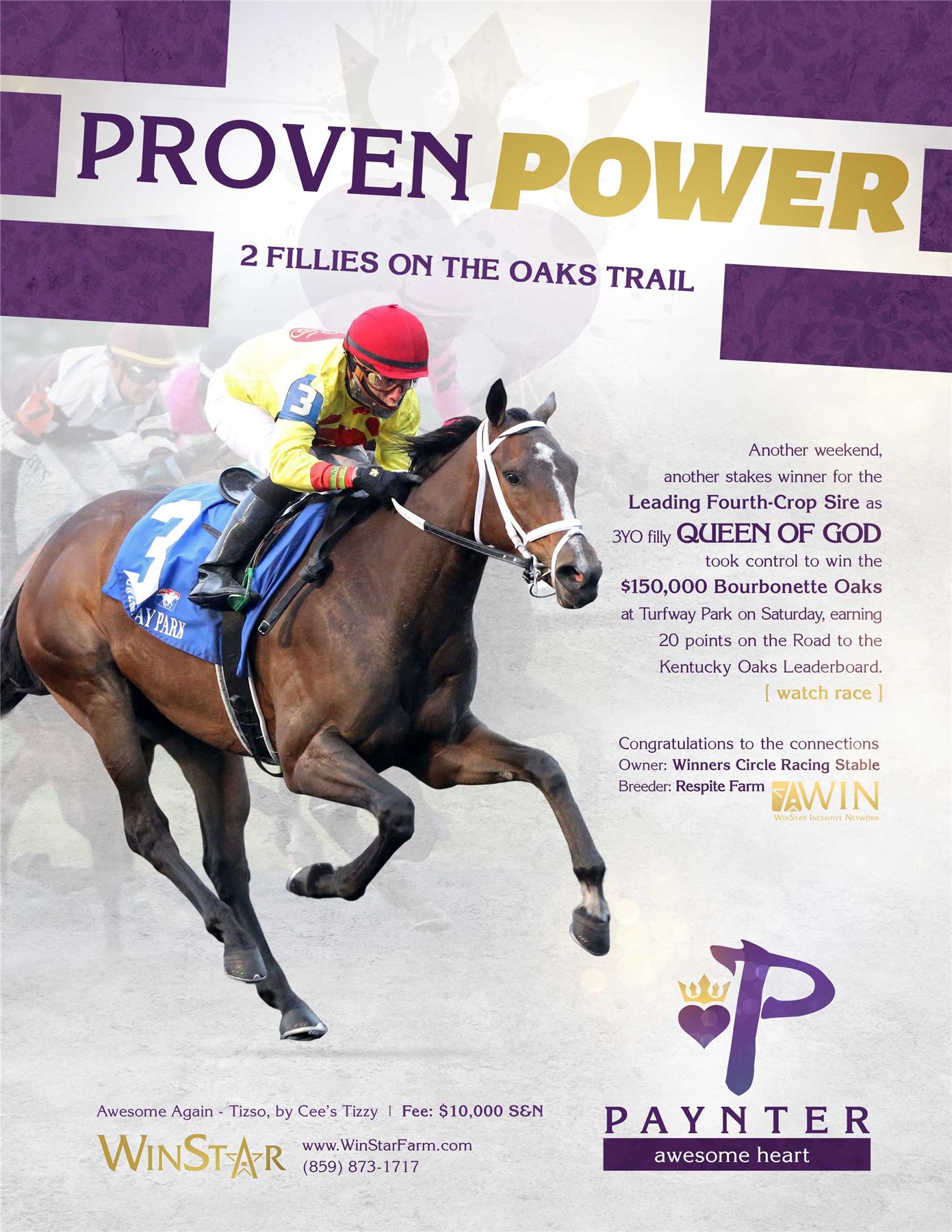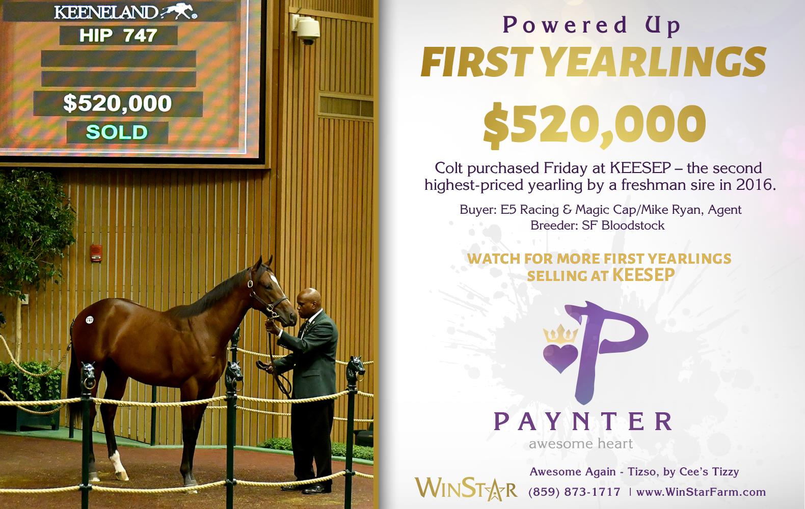 Paynter is already the sire of 23+ BTWs, including HOTY Knicks Go, who is out of a mare by Outflanker, a son of Danzig, and there are Awesome Again BTWs out of mares by Danzig sons Danehill, Dayjur, Langfuhr and Polish Numbers. From another branch of Northern Dancer, Paynter has a BTW out of a mare by Storm Cat. Outflanker is from the immediate family of A.P. Indy, and Paynter has sired GSWs out of mares by A.P. Indy sons Sauve and Mingun—A.P. Indy and sons and grandsons should be interesting here, especially Tapit. Out of Mr. Prospector line mares, he has BTWs out of mares by City Zip and his sire Carson City; Bandini, by Fusaichi Pegasus; and English Channel, by Smart Strike. There is a BTW from the sire line of Forty Niner, also the sire of Distorted Humor. From other branches of Mr. Prospector, there is a G1W on an Awesome Again cross over Gone West, making Speightstown, Elusive Quality, Mr. Greeley, and Grand Slam appealing choices. We can note Awesome Again line Classic winner Sir Winston out of a mare by Afleet Alex (by Northern Afleet). From the Fappiano branch of Mr. Prospector, Paynter has a BTW out of a mare by Quiet American and a BTW out of a mare by Unbridled’s Song. He has a GSW out of a mare by Dynaformer, a version of the successful Awesome Again cross with a Roberto line mare. Paynter has a BTW out of a mare by Holy Bull, another good cross under Awesome Again; a BTW out of a mare by Leroidesanimaux (sire of Animal Kingdom); a BTW out of a mare by Tiznow and a GSW out of a mare by his son Tiz Wonderful (both giving inbreeding to Tiznow and a sister). – Alan Porter