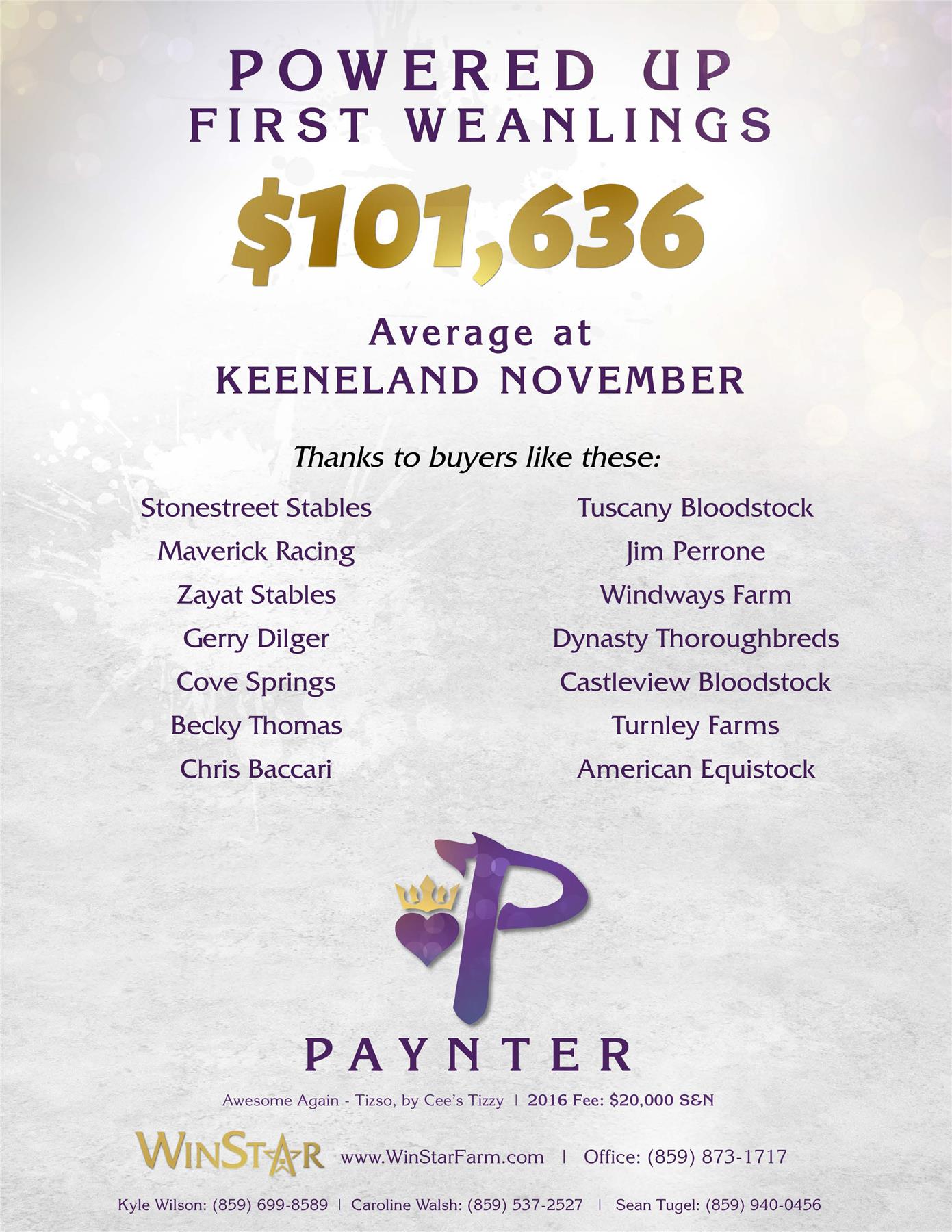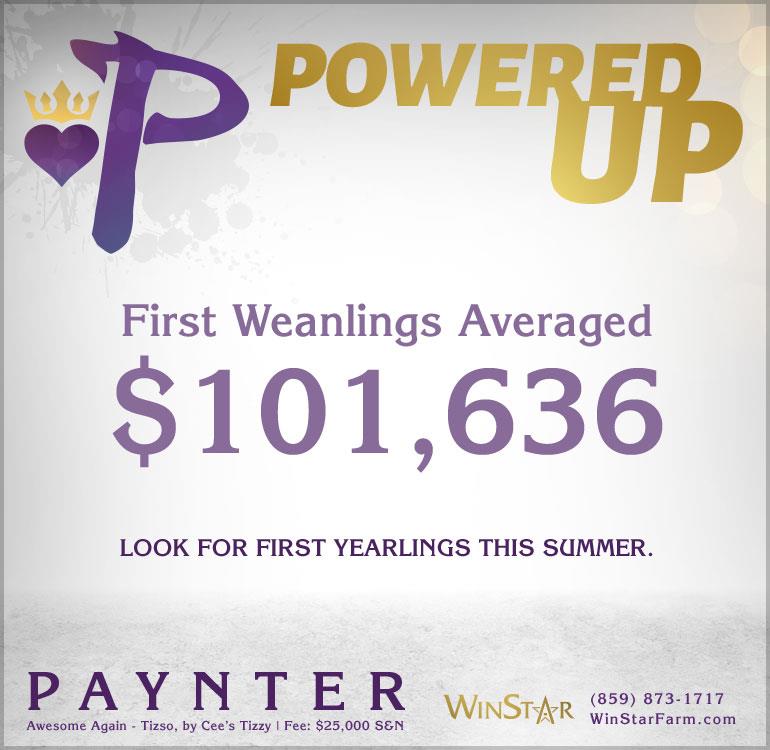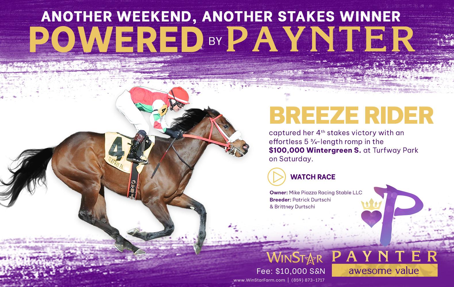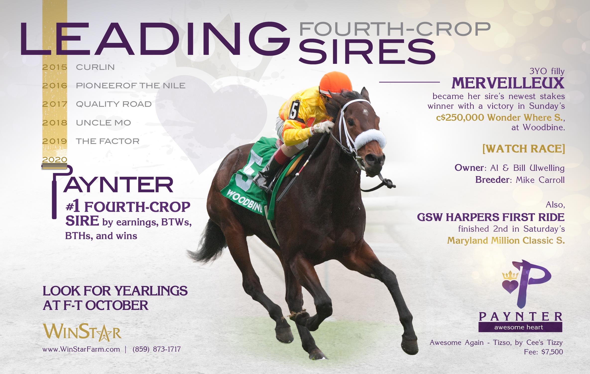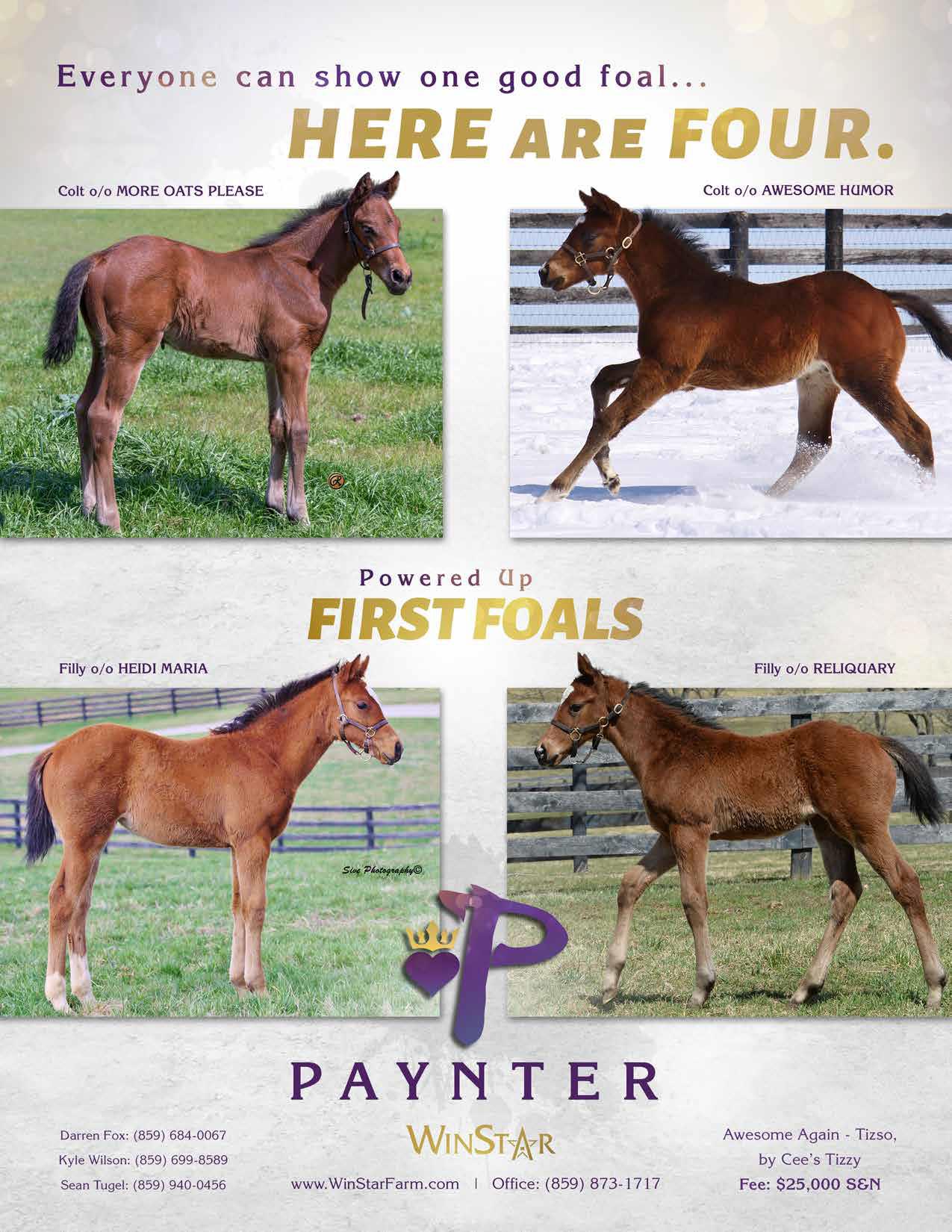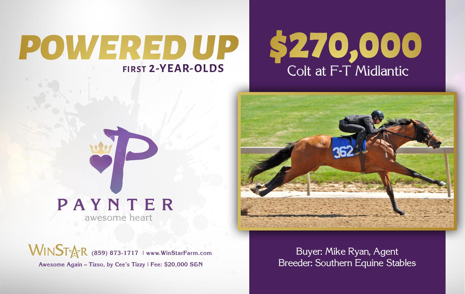 Paynter is already the sire of 23+ BTWs, including HOTY Knicks Go, who is out of a mare by Outflanker, a son of Danzig, and there are Awesome Again BTWs out of mares by Danzig sons Danehill, Dayjur, Langfuhr and Polish Numbers. From another branch of Northern Dancer, Paynter has a BTW out of a mare by Storm Cat. Outflanker is from the immediate family of A.P. Indy, and Paynter has sired GSWs out of mares by A.P. Indy sons Sauve and Mingun—A.P. Indy and sons and grandsons should be interesting here, especially Tapit. Out of Mr. Prospector line mares, he has BTWs out of mares by City Zip and his sire Carson City; Bandini, by Fusaichi Pegasus; and English Channel, by Smart Strike. There is a BTW from the sire line of Forty Niner, also the sire of Distorted Humor. From other branches of Mr. Prospector, there is a G1W on an Awesome Again cross over Gone West, making Speightstown, Elusive Quality, Mr. Greeley, and Grand Slam appealing choices. We can note Awesome Again line Classic winner Sir Winston out of a mare by Afleet Alex (by Northern Afleet). From the Fappiano branch of Mr. Prospector, Paynter has a BTW out of a mare by Quiet American and a BTW out of a mare by Unbridled’s Song. He has a GSW out of a mare by Dynaformer, a version of the successful Awesome Again cross with a Roberto line mare. Paynter has a BTW out of a mare by Holy Bull, another good cross under Awesome Again; a BTW out of a mare by Leroidesanimaux (sire of Animal Kingdom); a BTW out of a mare by Tiznow and a GSW out of a mare by his son Tiz Wonderful (both giving inbreeding to Tiznow and a sister). – Alan Porter