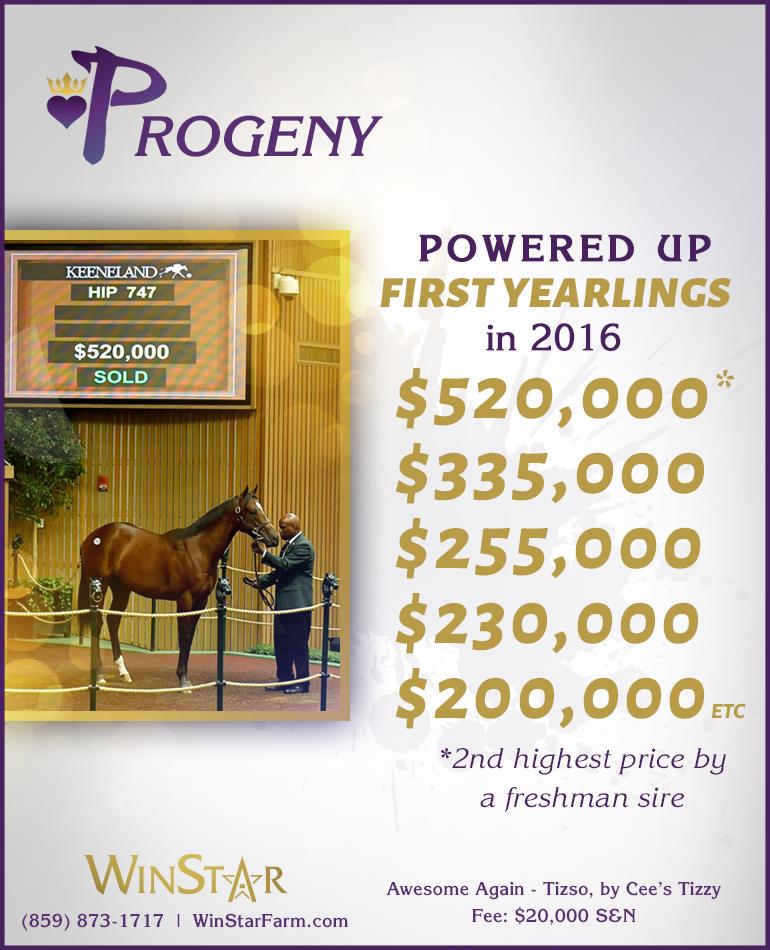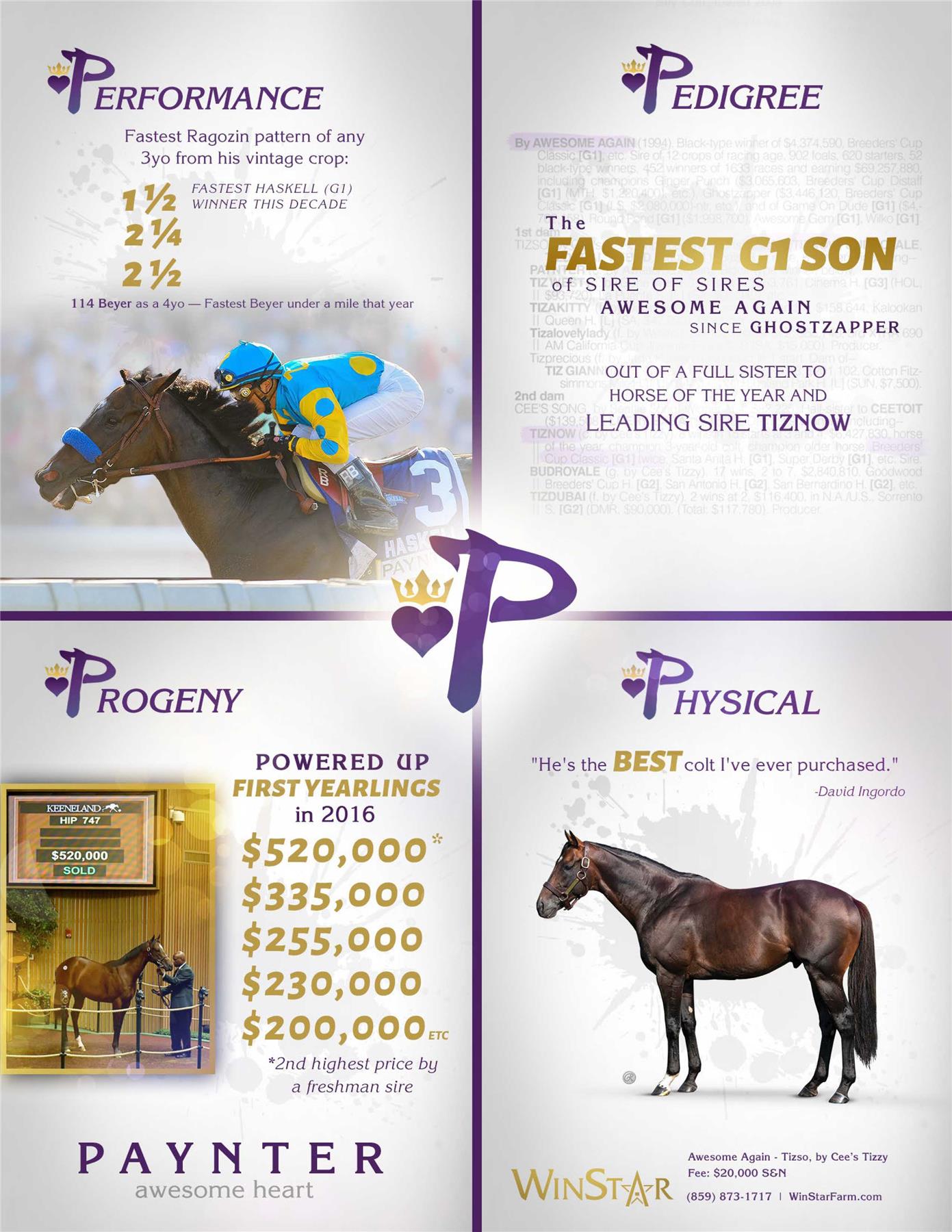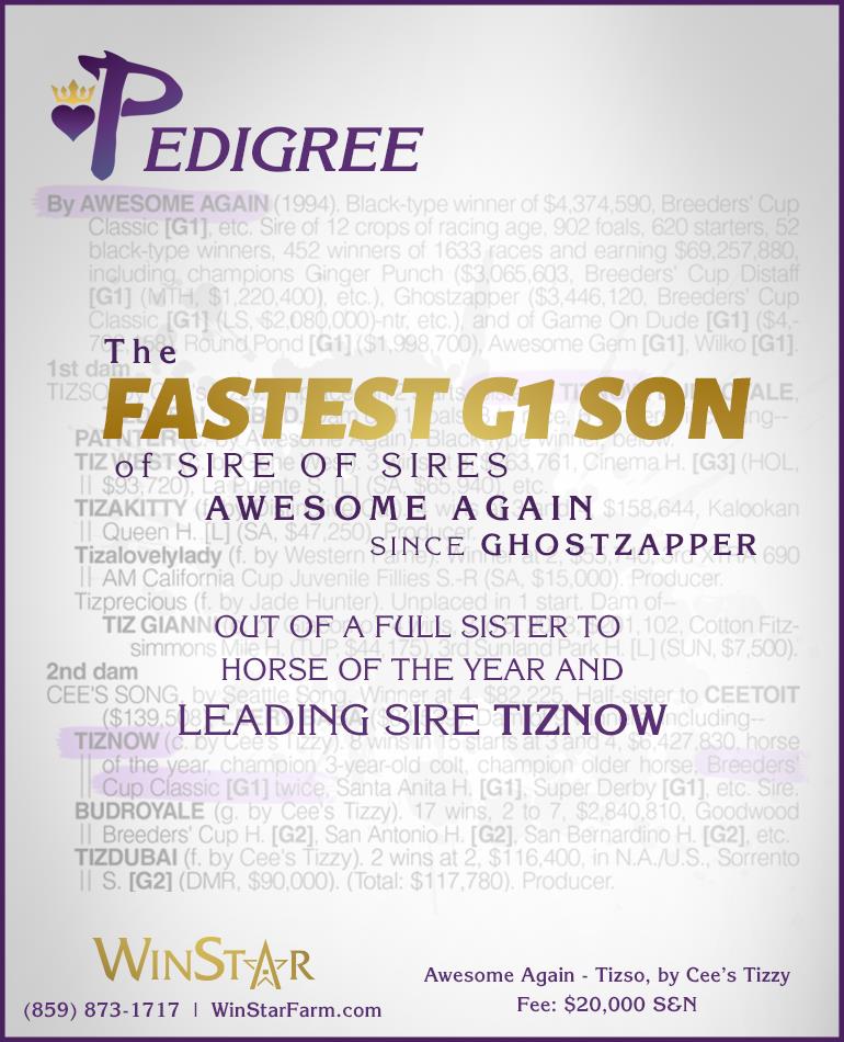 - The fastest G1-winning colt by sire of sires AWESOME AGAIN since Champion Ghostzapper; out of a full sister to Horse of the Year and leading sire TIZNOW
